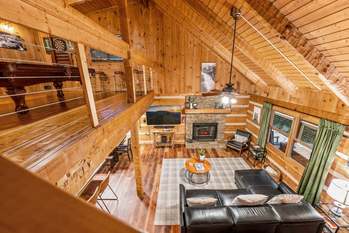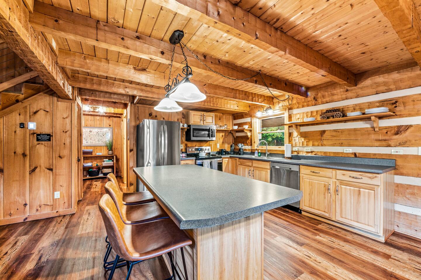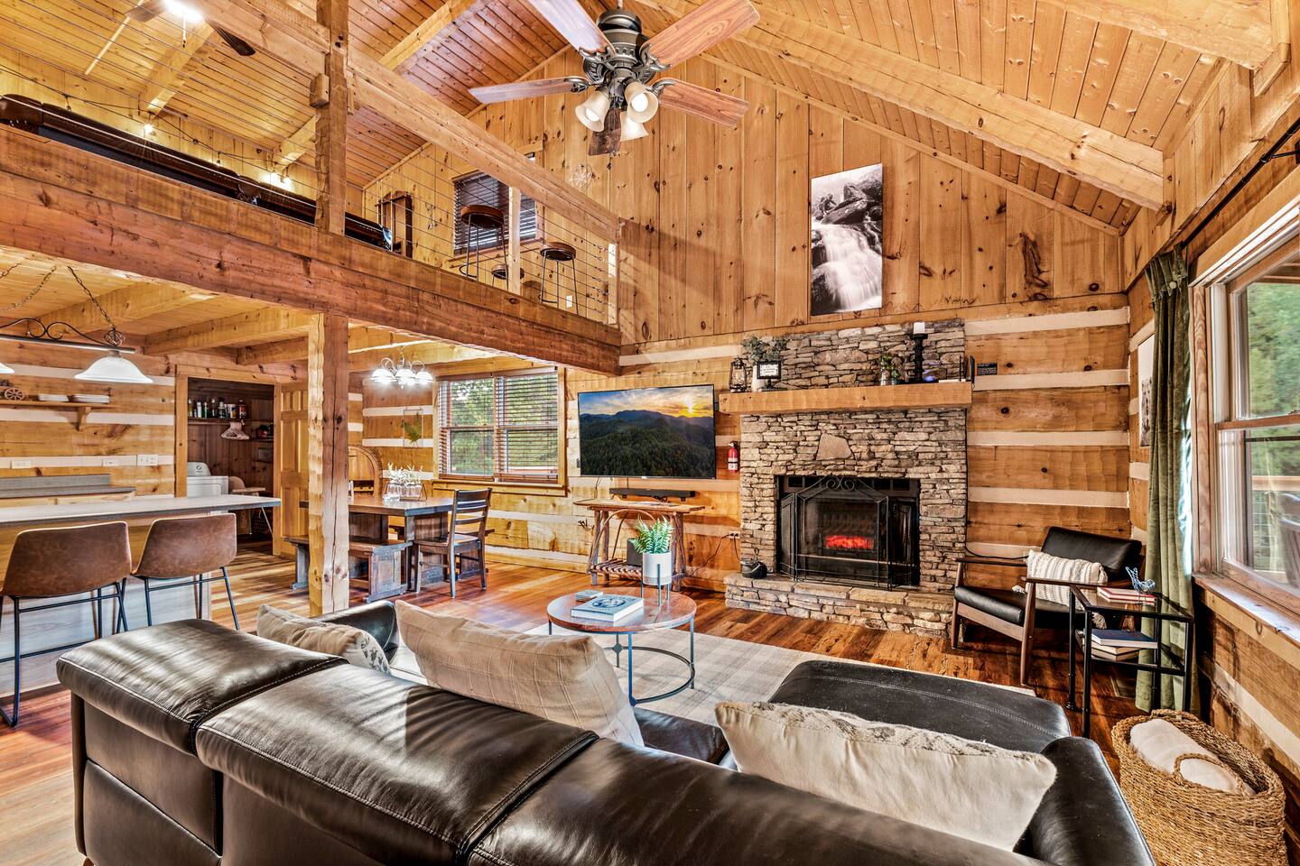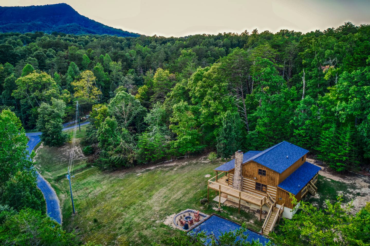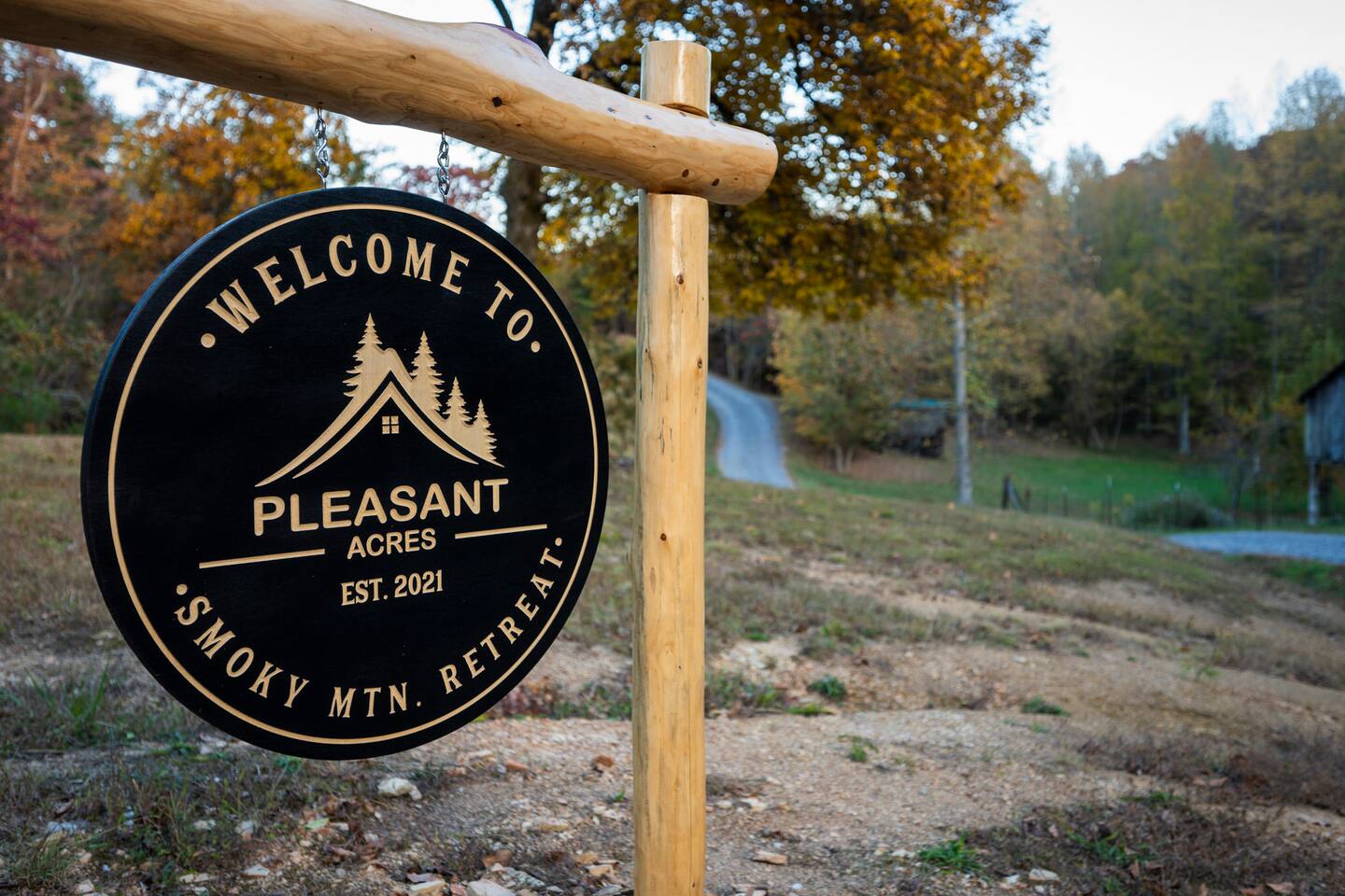 ❈ six private acres to relax or explore ❈ six miles to the main strip in Pigeon Forge ❈ view of Bluff Mountain and private property ❈ shaded and sunny deck spaces with ample outdoor seating and lounging ❈ large fire pit with a view and Adirondack chairs ❈ private hot tub ❈ fully-loaded kitchen ❈ smart TV’s everywhere ❈ wifi internet ❈ indoor sound systems ❈ pool table & dart board ❈ arcade games ❈ cornhole and other outdoor games ❈ board games, books, and puzzles ❈ large Connect 4 ❈ charcoal grill and grilling accessories ❈ ceiling fans and portable fans ❈ all new memory foam mattresses ❈ fresh bed & bath linens & beach towels ❈ basic starter consumables to include: coffee, trash bags, a roll of paper towels, household cleaner, a fresh dish sponge, dish soap, dishwasher soap, hand soap, shampoo, conditioner, body wash, and a roll of toilet paper or two in each bathroom ❈ high chair, pack-n-play, kids dinnerware & utensils ❈ washer and dryer ❈ flat parking for 4 vehicles Pull into your long private driveway and have a look at your private Smoky Mountain retreat. You’ll notice that it’s the only cabin you can see in the front of the property and that you’ll have plenty of space to enjoy. This is very rare in the area! The cantilever barn along the driveway was built around 90 years ago when the property was used as a tobacco farm. The forest of trees, seasonal streams, and the mountainside to the South are all part of your 6 acre retreat. You’ll have level parking for 4 cars right next to one of the three staircases to the cabin. There is a big fire pit overlooking the property with a view of Bluff Mountain. There is currently a ton of cut and fallen firewood that you are free to gather from the property. There is a charcoal BBQ pit in the fire pit area. Light a fire, grab the cornhole boards and a beverage and enjoy your evening at Pleasant Acres! The cabin has 135 ft of deck for you to enjoy. The front deck is our favorite spot to relax and enjoy the beautiful Smoky Mountain weather. We have a swinging bench, 4 rocking chairs, & a hammock. The nights on the decks are serene with animal sounds and rustling trees. The back deck features a private hot tub, a log futon and two rocking chairs. The closest neighbors to the back are ~275 feet away and separated by a tree line. The front door of the cabin will lead you to an open floor plan living room outfitted with all new leather furniture. The whole family can enjoy this large space which flows into the dining area and full kitchen. The 65” smart tv in the living room is connected to the wifi that you can also connect your personal devices to. There is a ton of free content on the TV’s. Feel free to sign into your Netflix or other accounts. There is a sound bar with a subwoofer for playing music or creating a theater experience with a movie. The large kitchen is well-equipped and includes dishes, glasses, utensils, cookware, grilling tools and linens. We also have a crock pot, a toaster, a blender, a Keurig that makes single cups, and a separate drip coffee maker. There are three bedrooms and three bathrooms. All bedrooms have all brand new furniture and memory foam mattresses. The master bedroom is downstairs with a King bed, reading chair, ceiling fan, luggage racks, a 32” smart TV, closet and an in-suite full bathroom. Bedroom 2 is also downstairs with a Queen bed, ceiling fan, luggage racks, a 40” smart TV and a closet. The second full bathroom is downstairs just outside of Bedroom 2. Bedroom 3 is very large and has TWO King beds and FOUR twin beds. No kids fighting over who gets the top bunk. A ceiling fan and luggage racks are also provided for this room. There is a 65” smart TV and a large Connect 4 on the wall. This is a true bedroom with a door and a closet. The third full bathroom is just outside Bedroom 3 and has two sinks. The game room has a 20 foot bar with stools that overlook the living room. There is plenty of space to enjoy the pool table, dart board, & arcade games. You will also find books for kids and adults throughout the cabin, and games and toys in the downstairs hallway. We work hard to create and maintain a place that will help make your vacation memorable. Come stay at Pleasant Acres and enjoy the Smokies!!