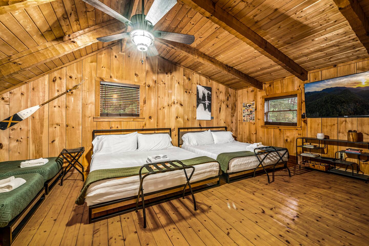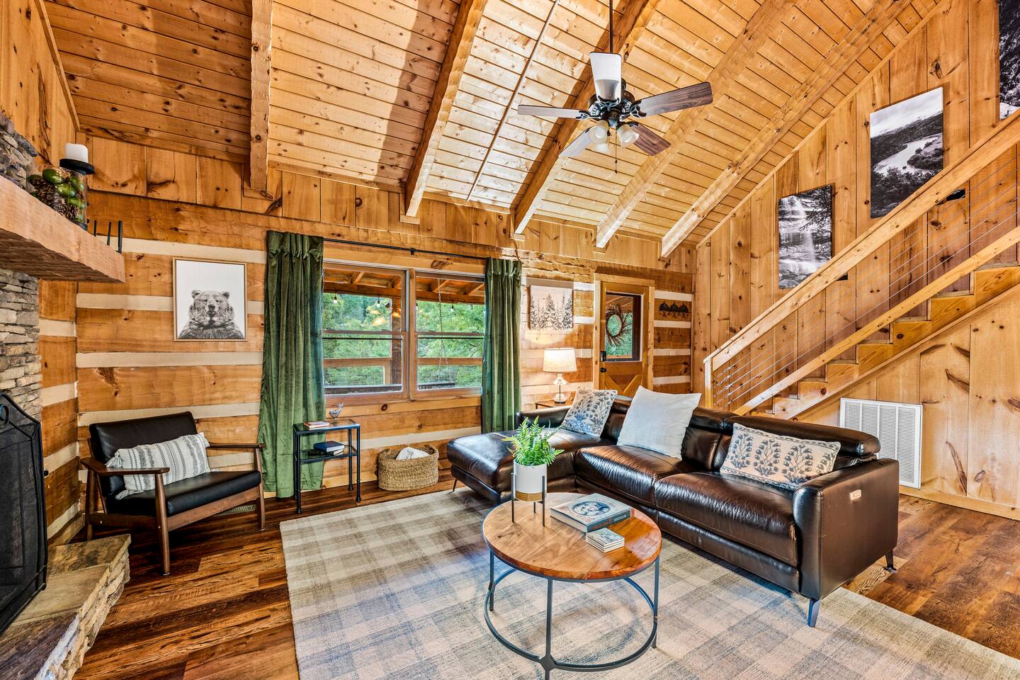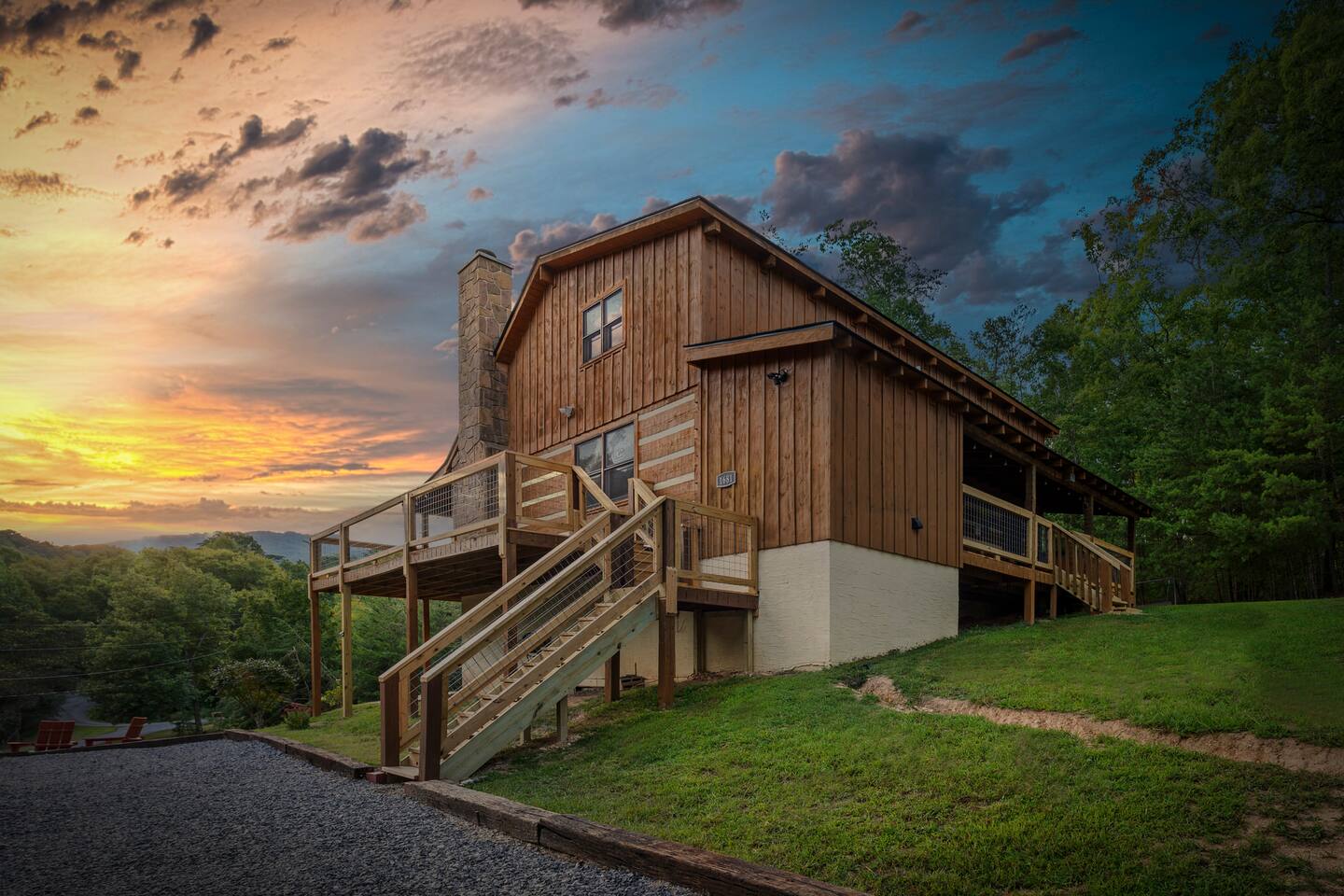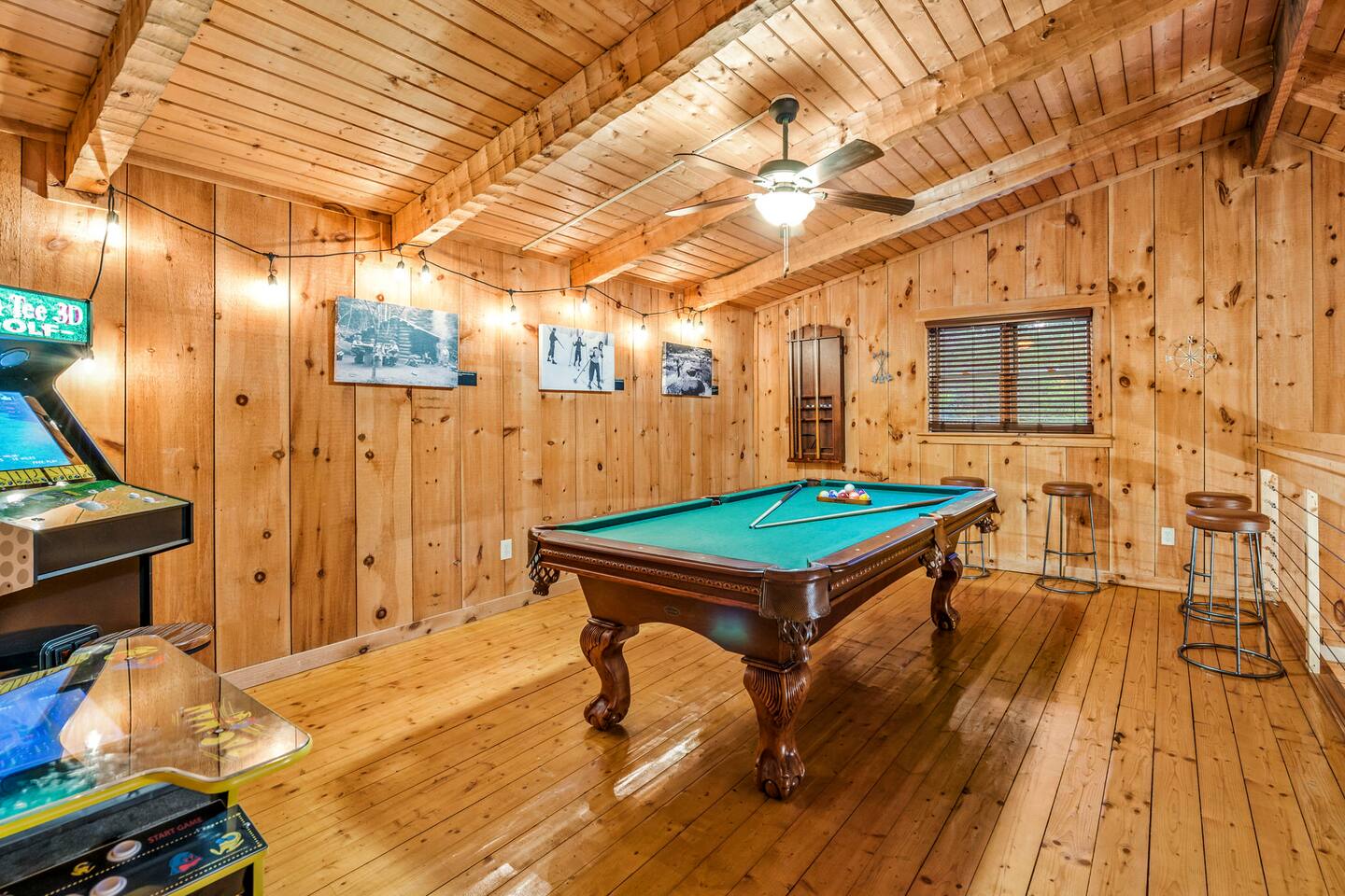 ❈ six private acres to relax or explore ❈ six miles to the main strip in Pigeon Forge ❈ view of Bluff Mountain and private property ❈ shaded and sunny deck spaces with ample outdoor seating and lounging ❈ large fire pit with a view and Adirondack chairs ❈ private hot tub ❈ fully-loaded kitchen ❈ smart TV’s everywhere ❈ wifi internet ❈ indoor sound systems ❈ pool table & dart board ❈ arcade games ❈ cornhole and other outdoor games ❈ board games, books, and puzzles ❈ large Connect 4 ❈ charcoal grill and grilling accessories ❈ ceiling fans and portable fans ❈ all new memory foam mattresses ❈ fresh bed & bath linens & beach towels ❈ basic starter consumables to include: coffee, trash bags, a roll of paper towels, household cleaner, a fresh dish sponge, dish soap, dishwasher soap, hand soap, shampoo, conditioner, body wash, and a roll of toilet paper or two in each bathroom ❈ high chair, pack-n-play, kids dinnerware & utensils ❈ washer and dryer ❈ flat parking for 4 vehicles Pull into your long private driveway and have a look at your private Smoky Mountain retreat. You’ll notice that it’s the only cabin you can see in the front of the property and that you’ll have plenty of space to enjoy. This is very rare in the area! The cantilever barn along the driveway was built around 90 years ago when the property was used as a tobacco farm. The forest of trees, seasonal streams, and the mountainside to the South are all part of your 6 acre retreat. You’ll have level parking for 4 cars right next to one of the three staircases to the cabin. There is a big fire pit overlooking the property with a view of Bluff Mountain. There is currently a ton of cut and fallen firewood that you are free to gather from the property. There is a charcoal BBQ pit in the fire pit area. Light a fire, grab the cornhole boards and a beverage and enjoy your evening at Pleasant Acres! The cabin has 135 ft of deck for you to enjoy. The front deck is our favorite spot to relax and enjoy the beautiful Smoky Mountain weather. We have a swinging bench, 4 rocking chairs, & a hammock. The nights on the decks are serene with animal sounds and rustling trees. The back deck features a private hot tub, a log futon and two rocking chairs. The closest neighbors to the back are ~275 feet away and separated by a tree line. The front door of the cabin will lead you to an open floor plan living room outfitted with all new leather furniture. The whole family can enjoy this large space which flows into the dining area and full kitchen. The 65” smart tv in the living room is connected to the wifi that you can also connect your personal devices to. There is a ton of free content on the TV’s. Feel free to sign into your Netflix or other accounts. There is a sound bar with a subwoofer for playing music or creating a theater experience with a movie. The large kitchen is well-equipped and includes dishes, glasses, utensils, cookware, grilling tools and linens. We also have a crock pot, a toaster, a blender, a Keurig that makes single cups, and a separate drip coffee maker. There are three bedrooms and three bathrooms. All bedrooms have all brand new furniture and memory foam mattresses. The master bedroom is downstairs with a King bed, reading chair, ceiling fan, luggage racks, a 32” smart TV, closet and an in-suite full bathroom. Bedroom 2 is also downstairs with a Queen bed, ceiling fan, luggage racks, a 40” smart TV and a closet. The second full bathroom is downstairs just outside of Bedroom 2. Bedroom 3 is very large and has TWO King beds and FOUR twin beds. No kids fighting over who gets the top bunk. A ceiling fan and luggage racks are also provided for this room. There is a 65” smart TV and a large Connect 4 on the wall. This is a true bedroom with a door and a closet. The third full bathroom is just outside Bedroom 3 and has two sinks. The game room has a 20 foot bar with stools that overlook the living room. There is plenty of space to enjoy the pool table, dart board, & arcade games. You will also find books for kids and adults throughout the cabin, and games and toys in the downstairs hallway. We work hard to create and maintain a place that will help make your vacation memorable. Come stay at Pleasant Acres and enjoy the Smokies!!