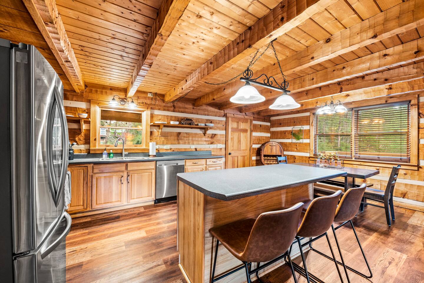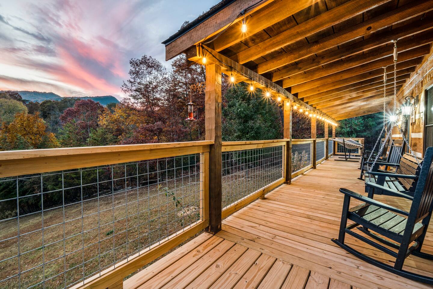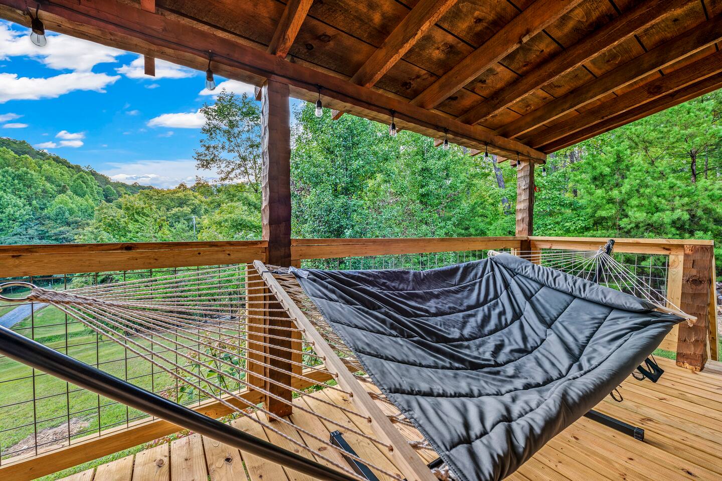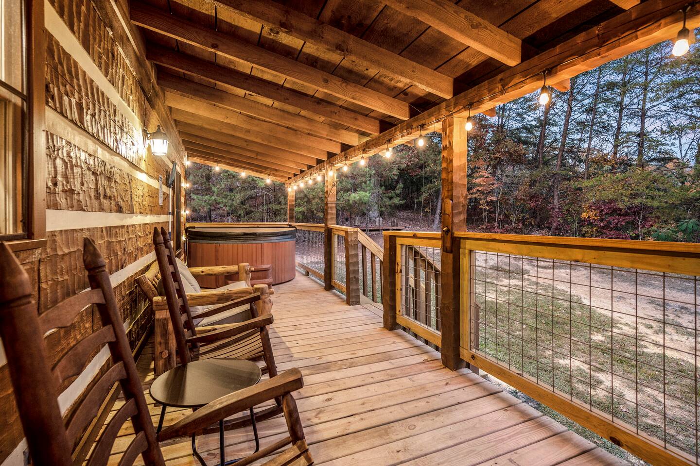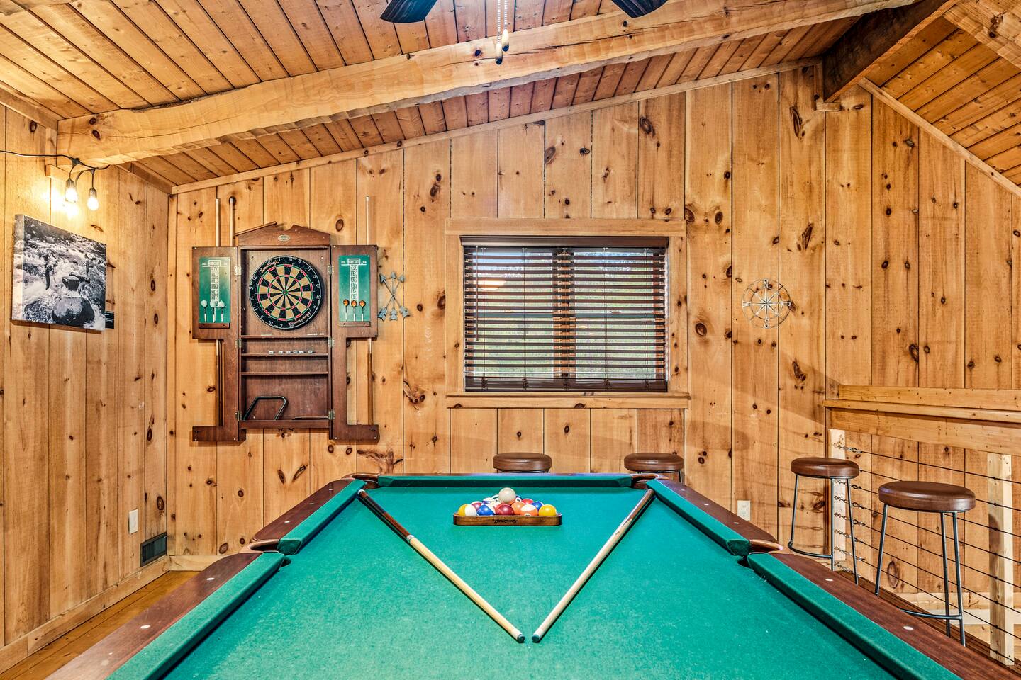 ❈ six private acres to relax or explore ❈ six miles to the main strip in Pigeon Forge ❈ view of Bluff Mountain and private property ❈ shaded and sunny deck spaces with ample outdoor seating and lounging ❈ large fire pit with a view and Adirondack chairs ❈ private hot tub ❈ fully-loaded kitchen ❈ smart TV’s everywhere ❈ wifi internet ❈ indoor sound systems ❈ pool table & dart board ❈ arcade games ❈ cornhole and other outdoor games ❈ board games, books, and puzzles ❈ large Connect 4 ❈ charcoal grill and grilling accessories ❈ ceiling fans and portable fans ❈ all new memory foam mattresses ❈ fresh bed & bath linens & beach towels ❈ basic starter consumables to include: coffee, trash bags, a roll of paper towels, household cleaner, a fresh dish sponge, dish soap, dishwasher soap, hand soap, shampoo, conditioner, body wash, and a roll of toilet paper or two in each bathroom ❈ high chair, pack-n-play, kids dinnerware & utensils ❈ washer and dryer ❈ flat parking for 4 vehicles Pull into your long private driveway and have a look at your private Smoky Mountain retreat. You’ll notice that it’s the only cabin you can see in the front of the property and that you’ll have plenty of space to enjoy. This is very rare in the area! The cantilever barn along the driveway was built around 90 years ago when the property was used as a tobacco farm. The forest of trees, seasonal streams, and the mountainside to the South are all part of your 6 acre retreat. You’ll have level parking for 4 cars right next to one of the three staircases to the cabin. There is a big fire pit overlooking the property with a view of Bluff Mountain. There is currently a ton of cut and fallen firewood that you are free to gather from the property. There is a charcoal BBQ pit in the fire pit area. Light a fire, grab the cornhole boards and a beverage and enjoy your evening at Pleasant Acres! The cabin has 135 ft of deck for you to enjoy. The front deck is our favorite spot to relax and enjoy the beautiful Smoky Mountain weather. We have a swinging bench, 4 rocking chairs, & a hammock. The nights on the decks are serene with animal sounds and rustling trees. The back deck features a private hot tub, a log futon and two rocking chairs. The closest neighbors to the back are ~275 feet away and separated by a tree line. The front door of the cabin will lead you to an open floor plan living room outfitted with all new leather furniture. The whole family can enjoy this large space which flows into the dining area and full kitchen. The 65” smart tv in the living room is connected to the wifi that you can also connect your personal devices to. There is a ton of free content on the TV’s. Feel free to sign into your Netflix or other accounts. There is a sound bar with a subwoofer for playing music or creating a theater experience with a movie. The large kitchen is well-equipped and includes dishes, glasses, utensils, cookware, grilling tools and linens. We also have a crock pot, a toaster, a blender, a Keurig that makes single cups, and a separate drip coffee maker. There are three bedrooms and three bathrooms. All bedrooms have all brand new furniture and memory foam mattresses. The master bedroom is downstairs with a King bed, reading chair, ceiling fan, luggage racks, a 32” smart TV, closet and an in-suite full bathroom. Bedroom 2 is also downstairs with a Queen bed, ceiling fan, luggage racks, a 40” smart TV and a closet. The second full bathroom is downstairs just outside of Bedroom 2. Bedroom 3 is very large and has TWO King beds and FOUR twin beds. No kids fighting over who gets the top bunk. A ceiling fan and luggage racks are also provided for this room. There is a 65” smart TV and a large Connect 4 on the wall. This is a true bedroom with a door and a closet. The third full bathroom is just outside Bedroom 3 and has two sinks. The game room has a 20 foot bar with stools that overlook the living room. There is plenty of space to enjoy the pool table, dart board, & arcade games. You will also find books for kids and adults throughout the cabin, and games and toys in the downstairs hallway. We work hard to create and maintain a place that will help make your vacation memorable. Come stay at Pleasant Acres and enjoy the Smokies!!