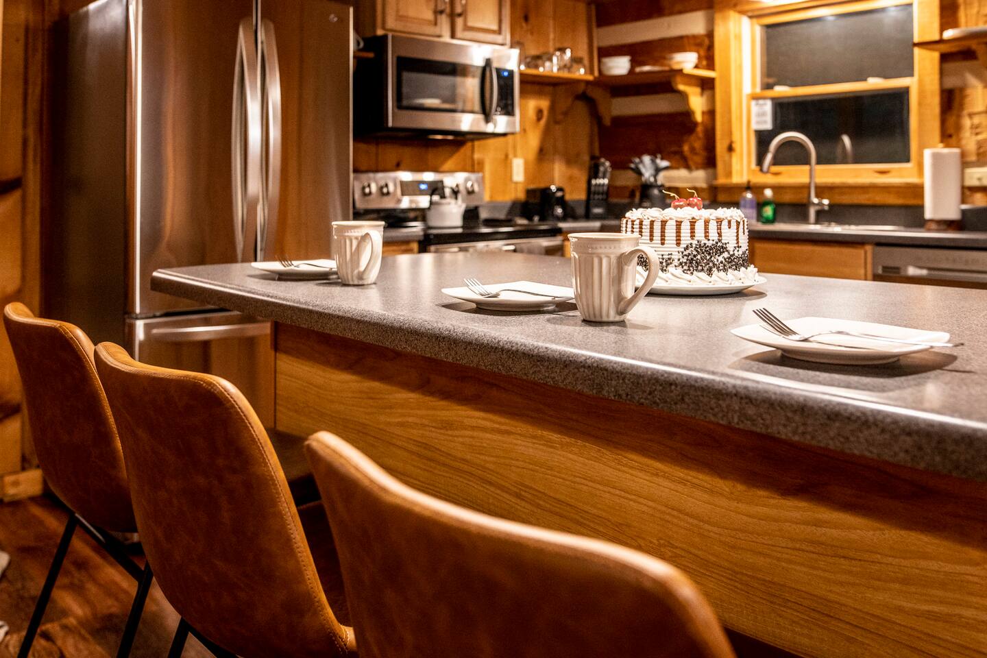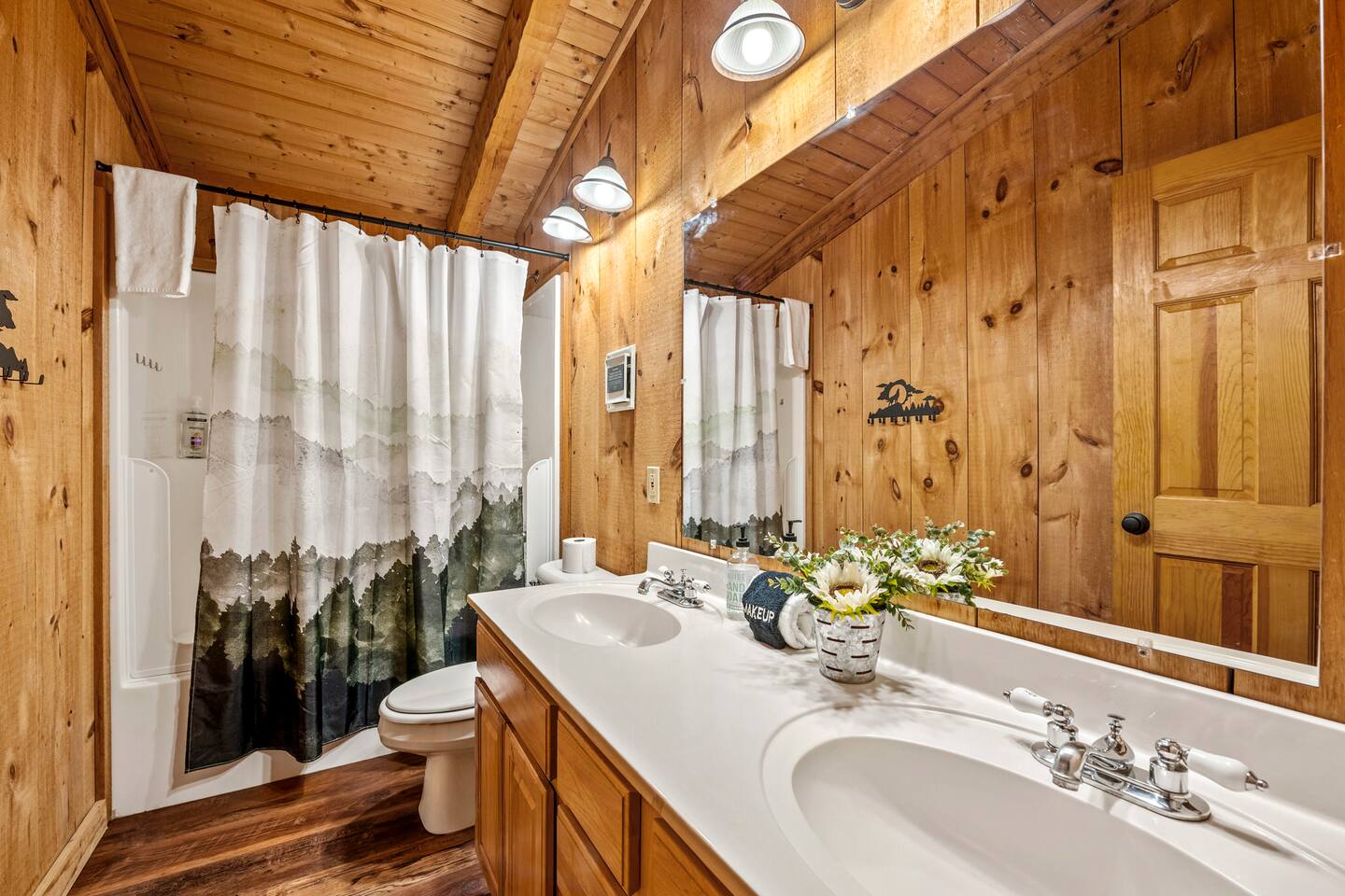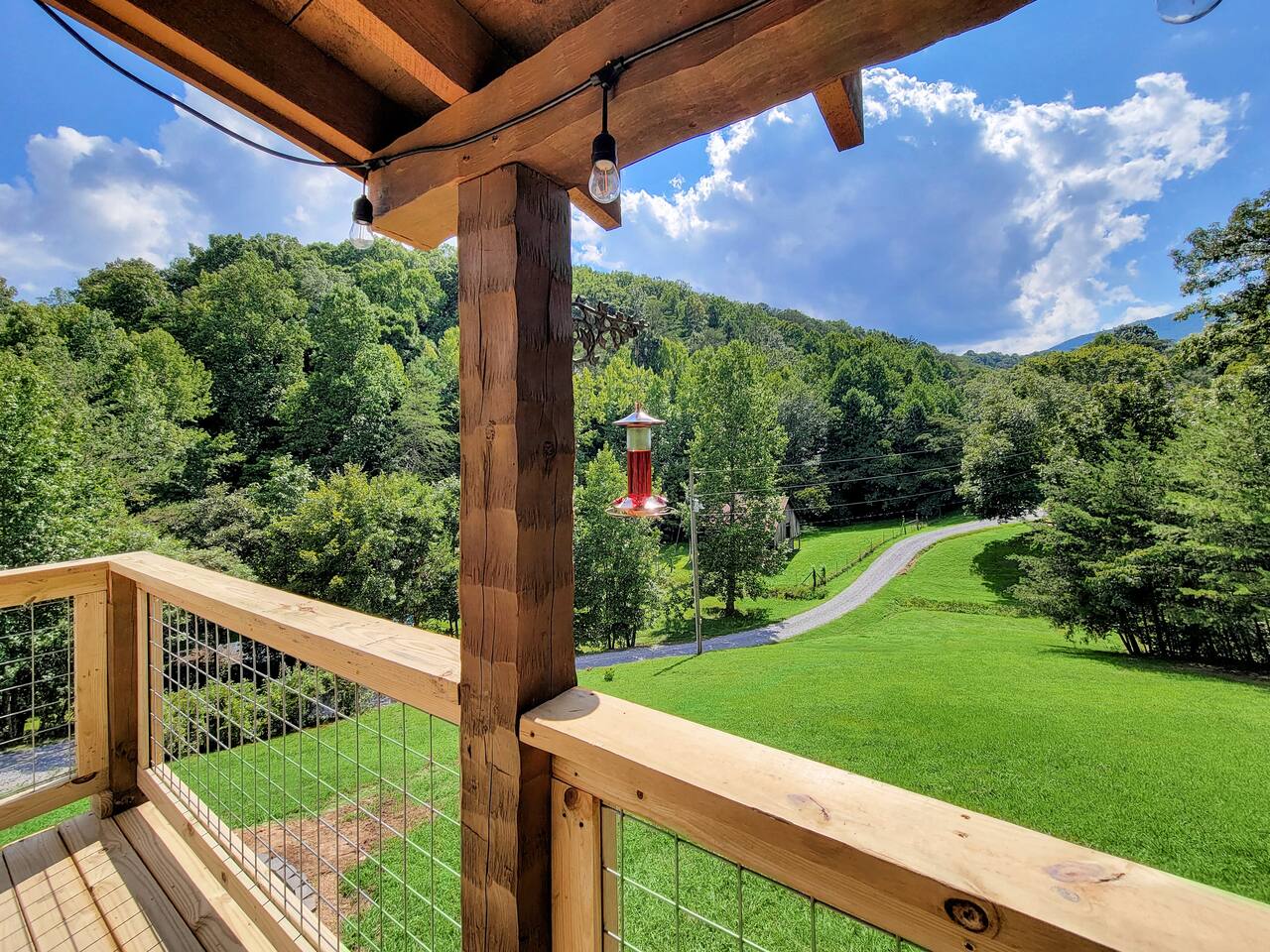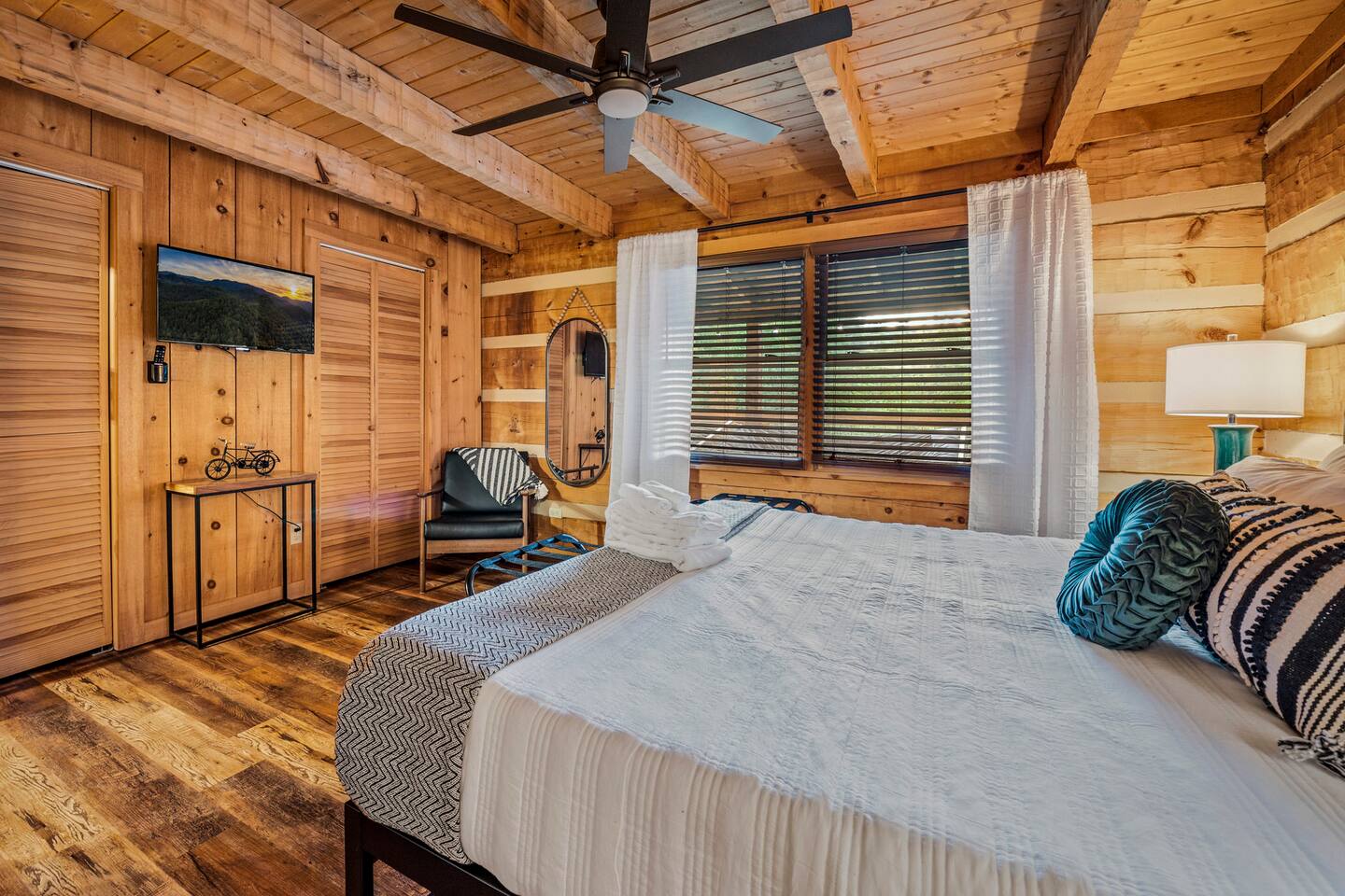 ❈ six private acres to relax or explore ❈ six miles to the main strip in Pigeon Forge ❈ view of Bluff Mountain and private property ❈ shaded and sunny deck spaces with ample outdoor seating and lounging ❈ large fire pit with a view and Adirondack chairs ❈ private hot tub ❈ fully-loaded kitchen ❈ smart TV’s everywhere ❈ wifi internet ❈ indoor sound systems ❈ pool table & dart board ❈ arcade games ❈ cornhole and other outdoor games ❈ board games, books, and puzzles ❈ large Connect 4 ❈ charcoal grill and grilling accessories ❈ ceiling fans and portable fans ❈ all new memory foam mattresses ❈ fresh bed & bath linens & beach towels ❈ basic starter consumables to include: coffee, trash bags, a roll of paper towels, household cleaner, a fresh dish sponge, dish soap, dishwasher soap, hand soap, shampoo, conditioner, body wash, and a roll of toilet paper or two in each bathroom ❈ high chair, pack-n-play, kids dinnerware & utensils ❈ washer and dryer ❈ flat parking for 4 vehicles Pull into your long private driveway and have a look at your private Smoky Mountain retreat. You’ll notice that it’s the only cabin you can see in the front of the property and that you’ll have plenty of space to enjoy. This is very rare in the area! The cantilever barn along the driveway was built around 90 years ago when the property was used as a tobacco farm. The forest of trees, seasonal streams, and the mountainside to the South are all part of your 6 acre retreat. You’ll have level parking for 4 cars right next to one of the three staircases to the cabin. There is a big fire pit overlooking the property with a view of Bluff Mountain. There is currently a ton of cut and fallen firewood that you are free to gather from the property. There is a charcoal BBQ pit in the fire pit area. Light a fire, grab the cornhole boards and a beverage and enjoy your evening at Pleasant Acres! The cabin has 135 ft of deck for you to enjoy. The front deck is our favorite spot to relax and enjoy the beautiful Smoky Mountain weather. We have a swinging bench, 4 rocking chairs, & a hammock. The nights on the decks are serene with animal sounds and rustling trees. The back deck features a private hot tub, a log futon and two rocking chairs. The closest neighbors to the back are ~275 feet away and separated by a tree line. The front door of the cabin will lead you to an open floor plan living room outfitted with all new leather furniture. The whole family can enjoy this large space which flows into the dining area and full kitchen. The 65” smart tv in the living room is connected to the wifi that you can also connect your personal devices to. There is a ton of free content on the TV’s. Feel free to sign into your Netflix or other accounts. There is a sound bar with a subwoofer for playing music or creating a theater experience with a movie. The large kitchen is well-equipped and includes dishes, glasses, utensils, cookware, grilling tools and linens. We also have a crock pot, a toaster, a blender, a Keurig that makes single cups, and a separate drip coffee maker. There are three bedrooms and three bathrooms. All bedrooms have all brand new furniture and memory foam mattresses. The master bedroom is downstairs with a King bed, reading chair, ceiling fan, luggage racks, a 32” smart TV, closet and an in-suite full bathroom. Bedroom 2 is also downstairs with a Queen bed, ceiling fan, luggage racks, a 40” smart TV and a closet. The second full bathroom is downstairs just outside of Bedroom 2. Bedroom 3 is very large and has TWO King beds and FOUR twin beds. No kids fighting over who gets the top bunk. A ceiling fan and luggage racks are also provided for this room. There is a 65” smart TV and a large Connect 4 on the wall. This is a true bedroom with a door and a closet. The third full bathroom is just outside Bedroom 3 and has two sinks. The game room has a 20 foot bar with stools that overlook the living room. There is plenty of space to enjoy the pool table, dart board, & arcade games. You will also find books for kids and adults throughout the cabin, and games and toys in the downstairs hallway. We work hard to create and maintain a place that will help make your vacation memorable. Come stay at Pleasant Acres and enjoy the Smokies!!