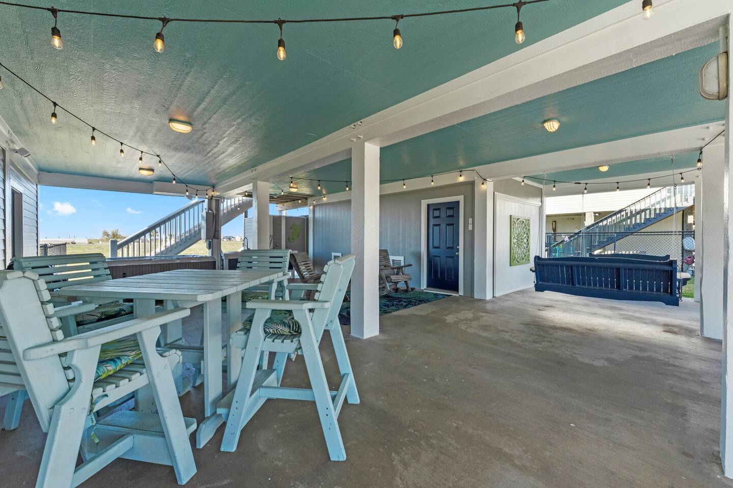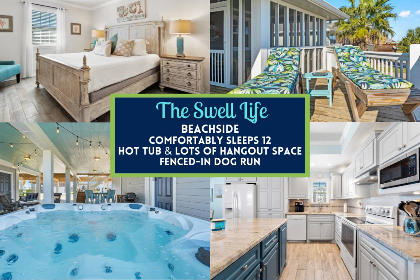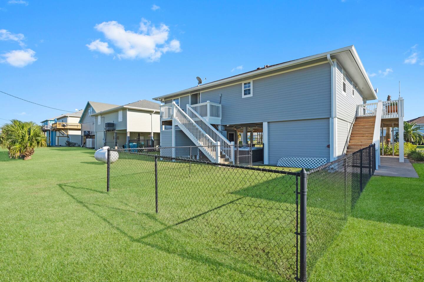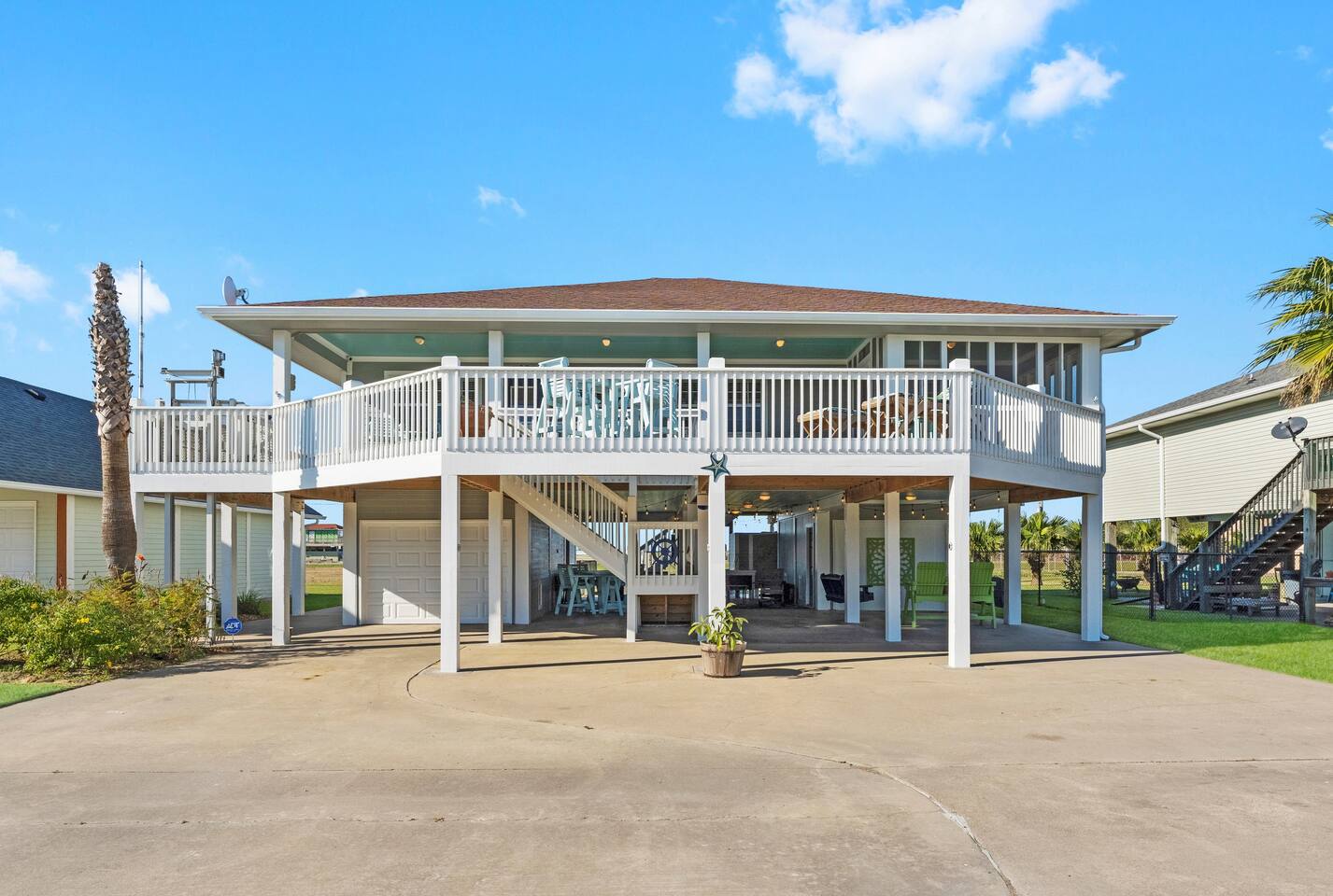 ❈ shaded, screened-in and sunny deck spaces with tons of outdoor seating ❈ 6 person private hot tub with 51 jets, multi-color light package, & waterfalls ❈ fully-loaded luxury kitchen ❈ outdoor bar and sink ❈ private outdoor shower ❈ fire pit with Adirondack chairs ❈ smart TV’s everywhere ❈ WIFI internet ❈ indoor & outdoor sound systems ❈ NFL Blitz Arcade Game ❈ cornhole & other outdoor games ❈ board games, books, & puzzles ❈ beach chairs, beach wagon, & rotating supply of beach toys ❈ charcoal grill, charcoal starter, & grilling accessories ❈ deep freezer loaded with bags of ice & secondary fridge ❈ ceiling fans & portable fans ❈ fresh bed & bath linens & beach towels for 12 people ❈ basic starter consumables to include: coffee, trash bags, a roll of paper towels, household cleaner, a fresh dish sponge, dish soap, dishwasher soap, hand soap, shampoo, conditioner, body wash, & a roll of toilet paper or two in each bathroom ❈ high chair, pack-n-play, kids dinnerware & utensils ❈ dog run that includes the upper deck & a fenced portion of the back yard ❈ washer & dryer ❈ parking for 4-6 vehicles Welcome to Texas! Crystal Beach is Texas at its finest. Drive, park, barbeque, swim, fish, build sandcastles, have events, or just relax on this beautiful and convenient beach. The beach house has everything you could need to enjoy your vacation. The home is lifted over 9-1/2 feet off of the ground, and the entire space is a finished patio with swinging benches, rocking chairs, bar chairs, tables, and a bar with a sink. Outdoor speakers with a Bluetooth sound system, hanging string lights, tons of games and a G-6 Tranquility Series 6 Person Spa make this space a paradise. The upper decks are spacious and include sunny, shady, and even screened-in deck areas. Seating and lighting is plentiful, and you can even hear the ocean waves at the front of the neighborhood. Walk inside to your open-concept luxury kitchen, dining, and living spaces. The kitchen is fully-equipped with everything you could possibly need to host your family or friends. The kitchen and island area seat 12 people comfortably. Small appliances not shown in pictures include a toaster and a crock pot. The living room has comfortable seating for 8-10 people and a large Roku TV with a sound bar and a subwoofer. You’ll find board games and puzzles in the entertainment center. How about a game day, game night, or a movie night? The master suite has a king bed, a 32” Roku TV, a ceiling fan, and solid wood furniture with built-in accent lighting. This bedroom features an en-suite bathroom with granite countertops, a river stone-floored walk-in shower and a large walk-in closet. You’ll find extra towels and blankets, as well as a box fan, and first aid kit in the closet. Bedroom 2 has a queen bed, a 32” smart TV, a ceiling fan, and solid wood furniture. The closet has extra blankets, a box fan, and a roll-away bed. A Jack-and-Jill bathroom connects bedroom 2 and bedroom 3. The bathroom features granite countertops and a large shower / bath combo with glass doors. Bedroom 3 has a bunk bed (twin over full) with a twin trundle, a 32” Roku TV, a ceiling fan, and solid wood furniture. In the closet you will find extra blankets and a toy chest with some goodies for the younger kids. Bedroom 4 has 2 bunk beds (twin over fulls), with a 32” smart TV featuring Chromecast and Apple AirPlay. This bedroom has an en-suite half bath and a dedicated mini-split HVAC unit. Bedroom 4 is on ground level separate from the rest of the home, and has its own private exterior entrance. The laundry room in the master bathroom has a full sized washer and dryer, and an iron and ironing board. The garage has a stand-up deep freezer and an additional refrigerator. We have an honor system set up for the deep freezer where we keep 100 pounds of ice ready for guests at all times. This allows you to have ice for your entire stay without having to run to The Big Store (less than 1 mile away). Please do not use the ice if you’re unable to refill it before your departure. The garage also features beach chairs, a beach wagon, and a rotating supply of beach toys that you are welcomed to bring to the beach, and a number of games and entertainment options for use at the property. There is a private outdoor shower with hot and cold water to rinse off after coming back from the beach, before getting in the spa, or just for enjoying a solid outdoor shower. We have a dog run! Your dog (30 pounds or less) can roam the entire upstairs patio space and take the stairs down to a fenced-in grass yard. We work hard to maintain a place that you and yours can enjoy. Come stay with us and indulge in the beach life!!