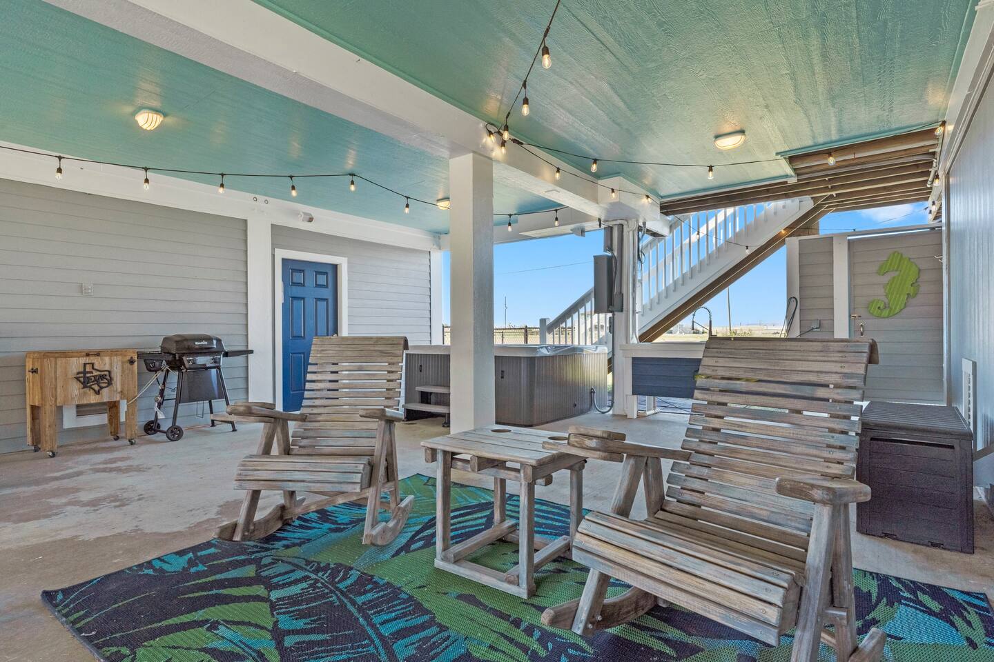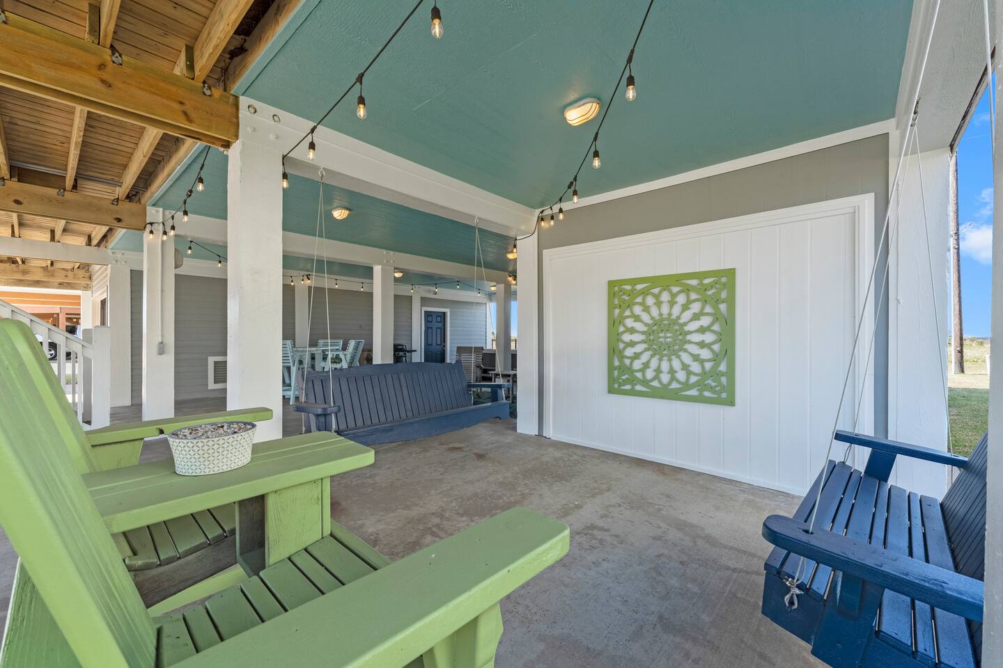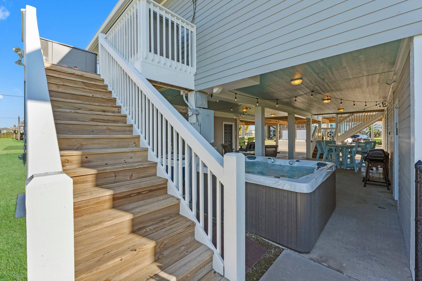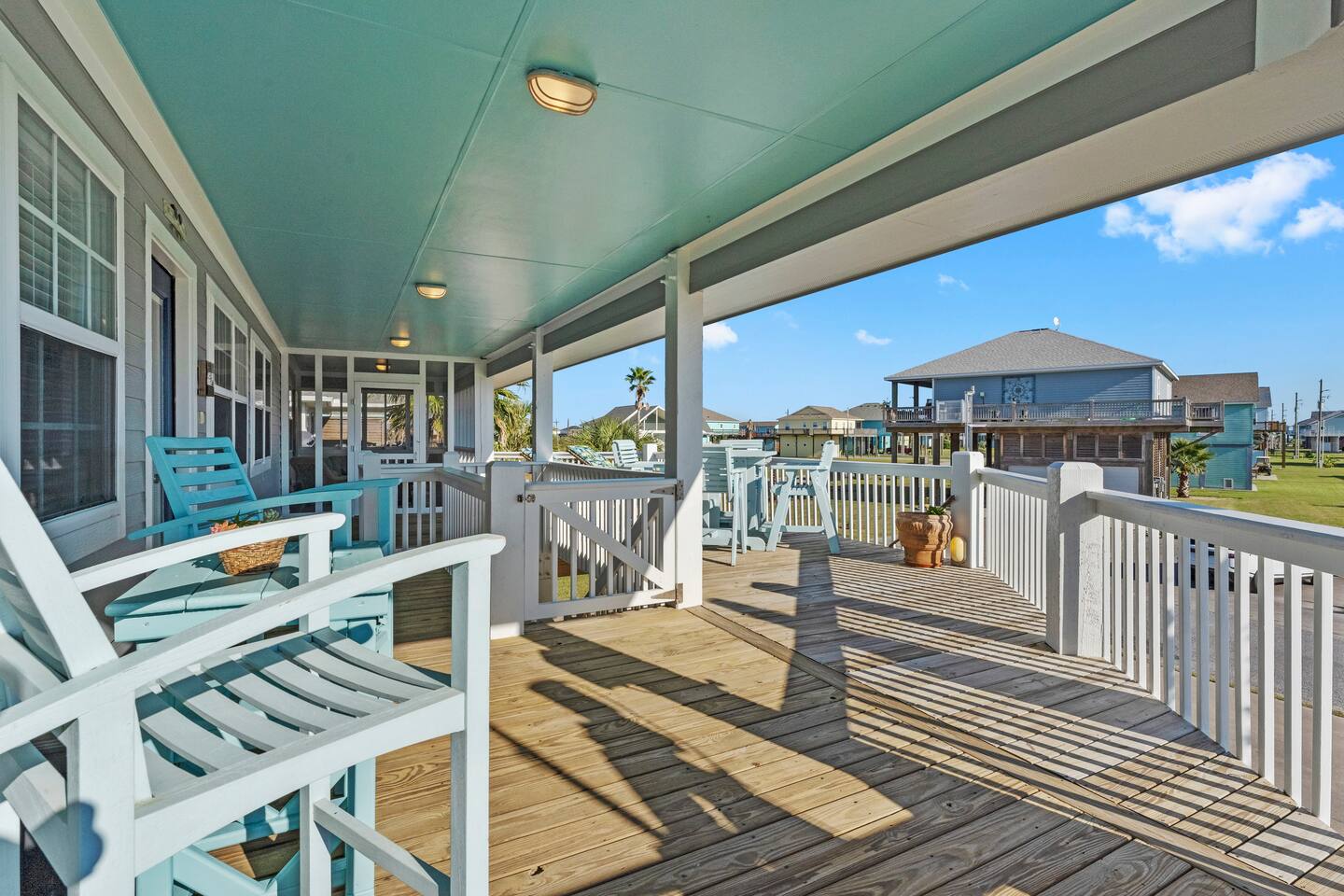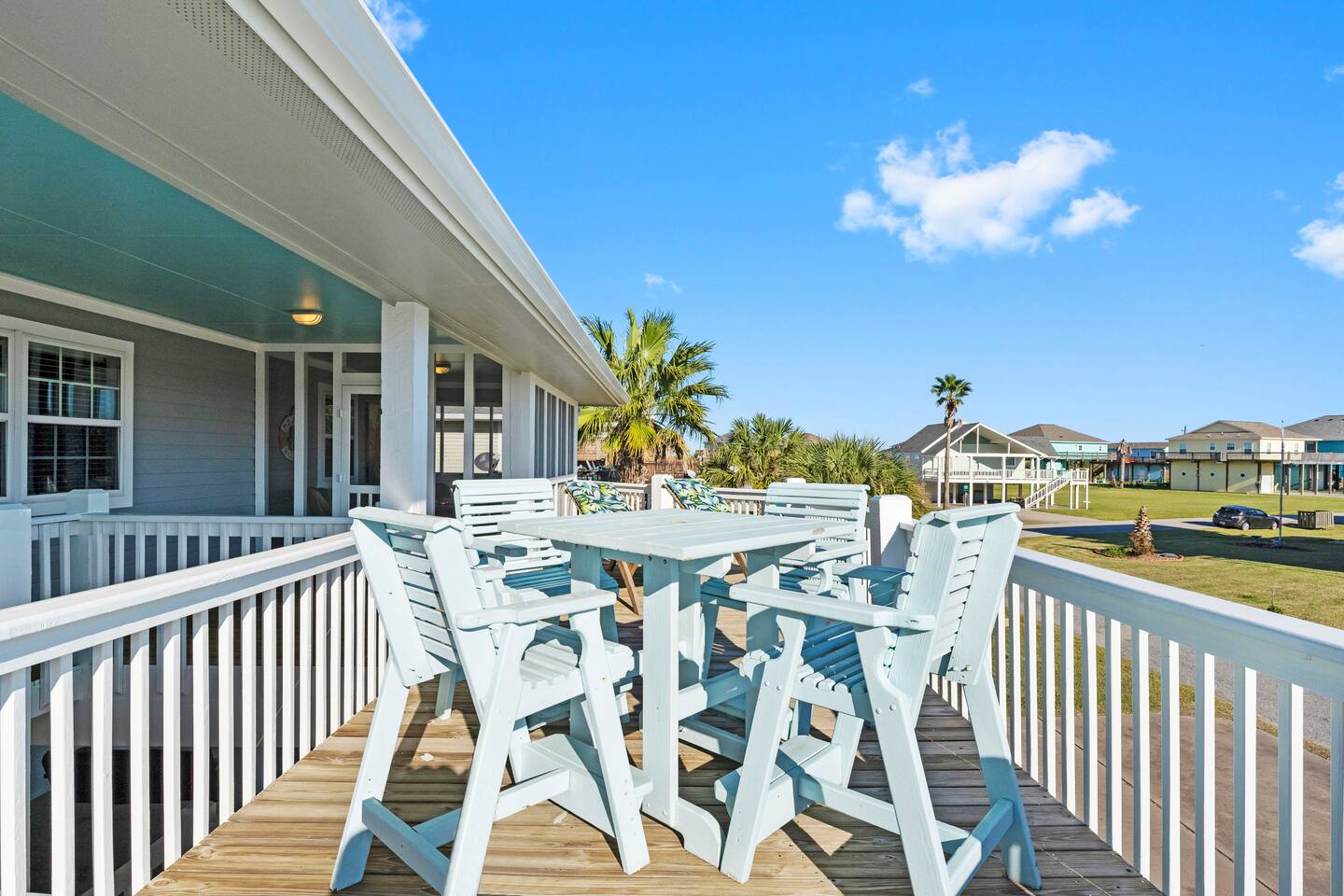 ❈ shaded, screened-in and sunny deck spaces with tons of outdoor seating ❈ 6 person private hot tub with 51 jets, multi-color light package, & waterfalls ❈ fully-loaded luxury kitchen ❈ outdoor bar and sink ❈ private outdoor shower ❈ fire pit with Adirondack chairs ❈ smart TV’s everywhere ❈ WIFI internet ❈ indoor & outdoor sound systems ❈ NFL Blitz Arcade Game ❈ cornhole & other outdoor games ❈ board games, books, & puzzles ❈ beach chairs, beach wagon, & rotating supply of beach toys ❈ charcoal grill, charcoal starter, & grilling accessories ❈ deep freezer loaded with bags of ice & secondary fridge ❈ ceiling fans & portable fans ❈ fresh bed & bath linens & beach towels for 12 people ❈ basic starter consumables to include: coffee, trash bags, a roll of paper towels, household cleaner, a fresh dish sponge, dish soap, dishwasher soap, hand soap, shampoo, conditioner, body wash, & a roll of toilet paper or two in each bathroom ❈ high chair, pack-n-play, kids dinnerware & utensils ❈ dog run that includes the upper deck & a fenced portion of the back yard ❈ washer & dryer ❈ parking for 4-6 vehicles Welcome to Texas! Crystal Beach is Texas at its finest. Drive, park, barbeque, swim, fish, build sandcastles, have events, or just relax on this beautiful and convenient beach. The beach house has everything you could need to enjoy your vacation. The home is lifted over 9-1/2 feet off of the ground, and the entire space is a finished patio with swinging benches, rocking chairs, bar chairs, tables, and a bar with a sink. Outdoor speakers with a Bluetooth sound system, hanging string lights, tons of games and a G-6 Tranquility Series 6 Person Spa make this space a paradise. The upper decks are spacious and include sunny, shady, and even screened-in deck areas. Seating and lighting is plentiful, and you can even hear the ocean waves at the front of the neighborhood. Walk inside to your open-concept luxury kitchen, dining, and living spaces. The kitchen is fully-equipped with everything you could possibly need to host your family or friends. The kitchen and island area seat 12 people comfortably. Small appliances not shown in pictures include a toaster and a crock pot. The living room has comfortable seating for 8-10 people and a large Roku TV with a sound bar and a subwoofer. You’ll find board games and puzzles in the entertainment center. How about a game day, game night, or a movie night? The master suite has a king bed, a 32” Roku TV, a ceiling fan, and solid wood furniture with built-in accent lighting. This bedroom features an en-suite bathroom with granite countertops, a river stone-floored walk-in shower and a large walk-in closet. You’ll find extra towels and blankets, as well as a box fan, and first aid kit in the closet. Bedroom 2 has a queen bed, a 32” smart TV, a ceiling fan, and solid wood furniture. The closet has extra blankets, a box fan, and a roll-away bed. A Jack-and-Jill bathroom connects bedroom 2 and bedroom 3. The bathroom features granite countertops and a large shower / bath combo with glass doors. Bedroom 3 has a bunk bed (twin over full) with a twin trundle, a 32” Roku TV, a ceiling fan, and solid wood furniture. In the closet you will find extra blankets and a toy chest with some goodies for the younger kids. Bedroom 4 has 2 bunk beds (twin over fulls), with a 32” smart TV featuring Chromecast and Apple AirPlay. This bedroom has an en-suite half bath and a dedicated mini-split HVAC unit. Bedroom 4 is on ground level separate from the rest of the home, and has its own private exterior entrance. The laundry room in the master bathroom has a full sized washer and dryer, and an iron and ironing board. The garage has a stand-up deep freezer and an additional refrigerator. We have an honor system set up for the deep freezer where we keep 100 pounds of ice ready for guests at all times. This allows you to have ice for your entire stay without having to run to The Big Store (less than 1 mile away). Please do not use the ice if you’re unable to refill it before your departure. The garage also features beach chairs, a beach wagon, and a rotating supply of beach toys that you are welcomed to bring to the beach, and a number of games and entertainment options for use at the property. There is a private outdoor shower with hot and cold water to rinse off after coming back from the beach, before getting in the spa, or just for enjoying a solid outdoor shower. We have a dog run! Your dog (30 pounds or less) can roam the entire upstairs patio space and take the stairs down to a fenced-in grass yard. We work hard to maintain a place that you and yours can enjoy. Come stay with us and indulge in the beach life!!