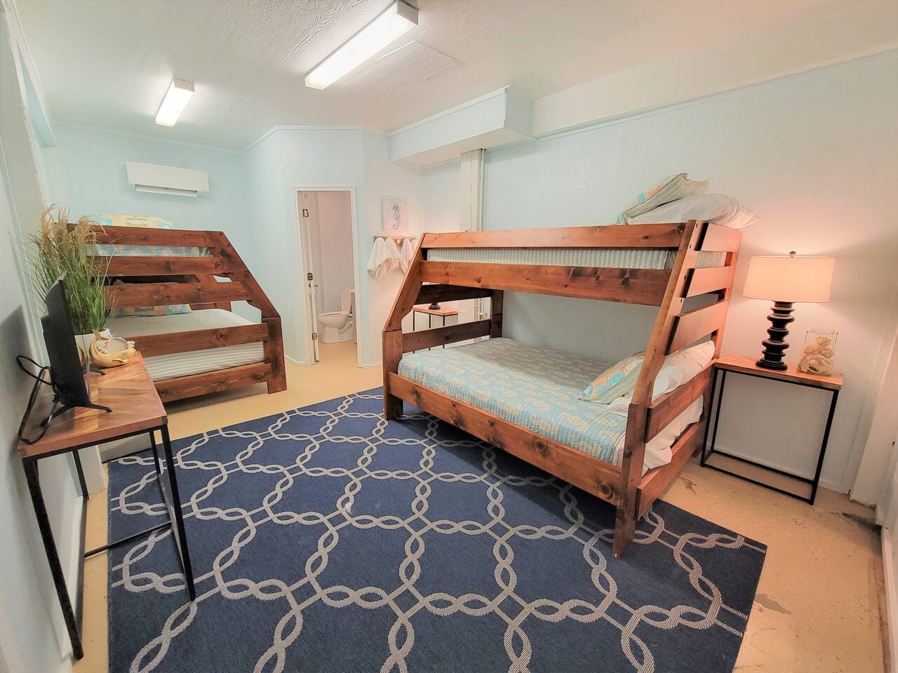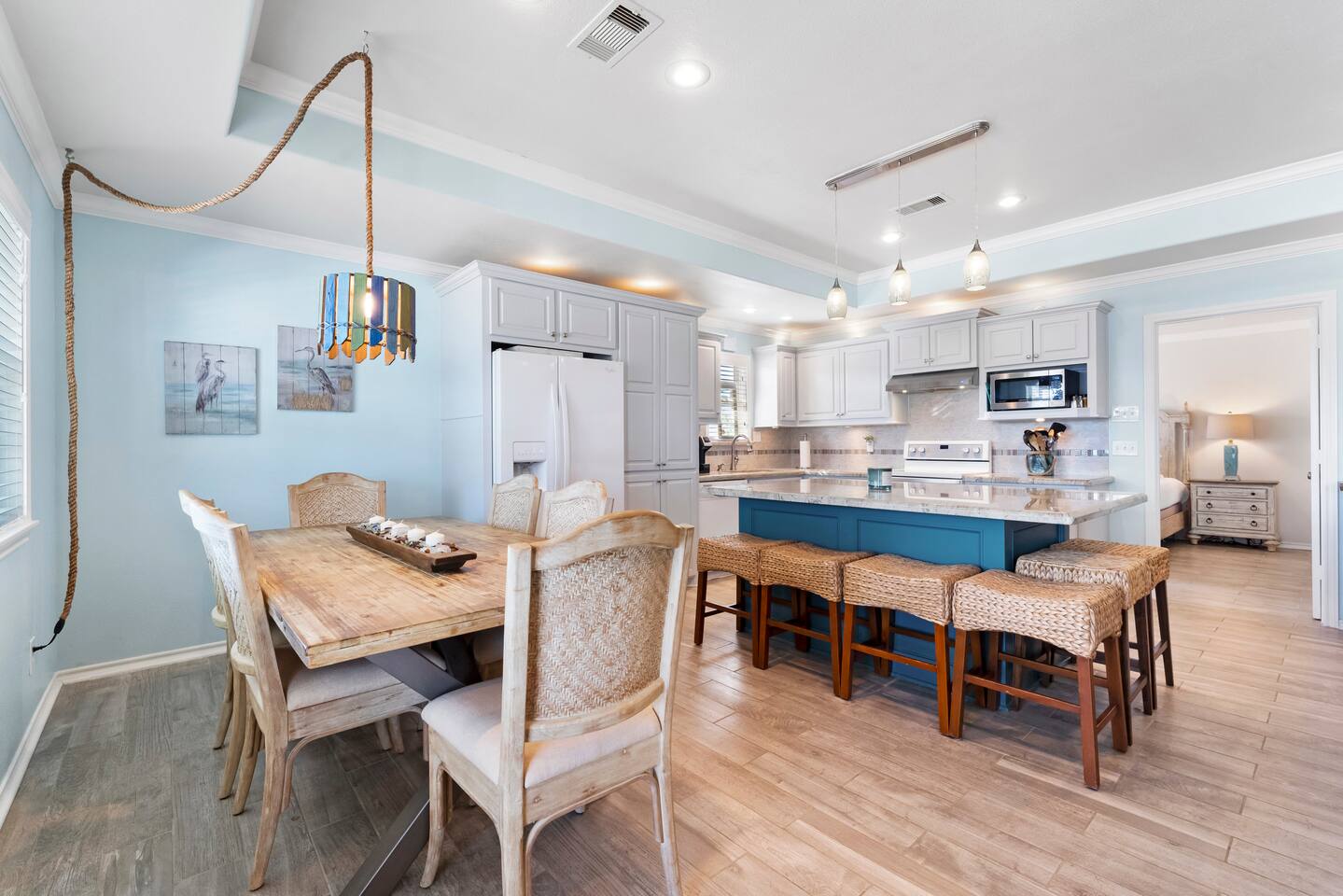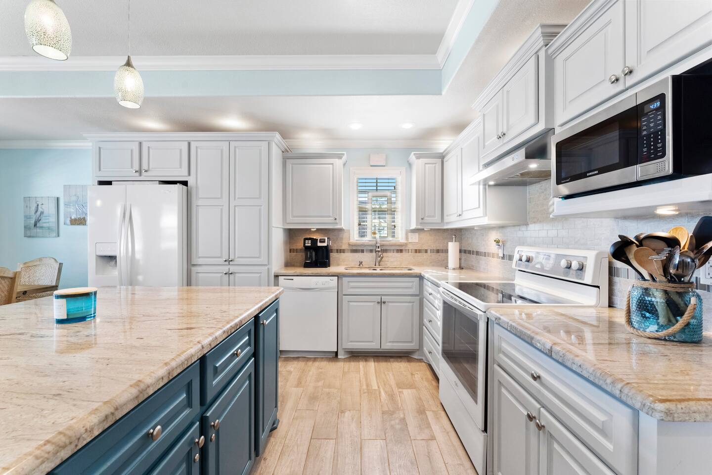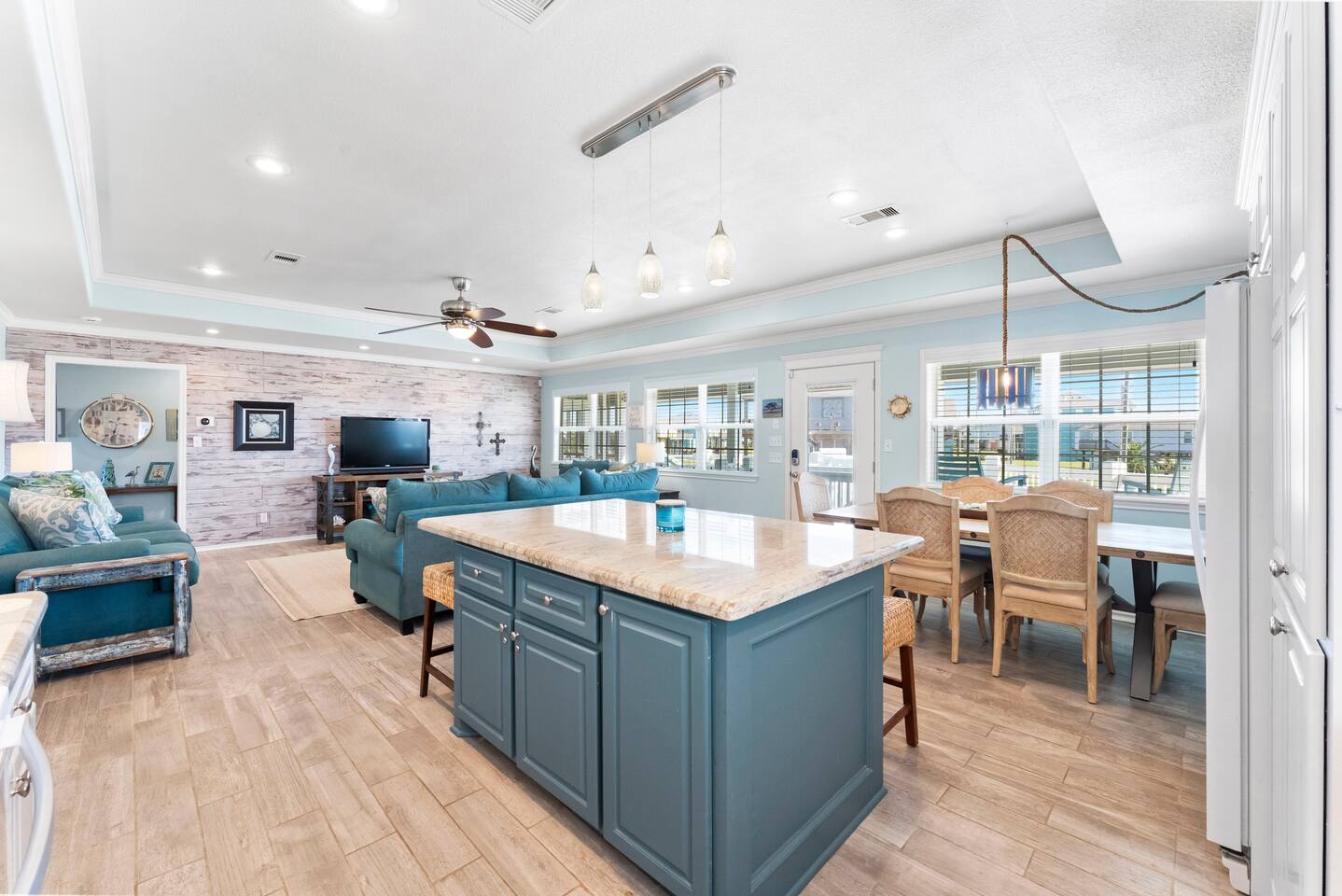 ❈ shaded, screened-in and sunny deck spaces with tons of outdoor seating ❈ 6 person private hot tub with 51 jets, multi-color light package, & waterfalls ❈ fully-loaded luxury kitchen ❈ outdoor bar and sink ❈ private outdoor shower ❈ fire pit with Adirondack chairs ❈ smart TV’s everywhere ❈ WIFI internet ❈ indoor & outdoor sound systems ❈ NFL Blitz Arcade Game ❈ cornhole & other outdoor games ❈ board games, books, & puzzles ❈ beach chairs, beach wagon, & rotating supply of beach toys ❈ charcoal grill, charcoal starter, & grilling accessories ❈ deep freezer loaded with bags of ice & secondary fridge ❈ ceiling fans & portable fans ❈ fresh bed & bath linens & beach towels for 12 people ❈ basic starter consumables to include: coffee, trash bags, a roll of paper towels, household cleaner, a fresh dish sponge, dish soap, dishwasher soap, hand soap, shampoo, conditioner, body wash, & a roll of toilet paper or two in each bathroom ❈ high chair, pack-n-play, kids dinnerware & utensils ❈ dog run that includes the upper deck & a fenced portion of the back yard ❈ washer & dryer ❈ parking for 4-6 vehicles Welcome to Texas! Crystal Beach is Texas at its finest. Drive, park, barbeque, swim, fish, build sandcastles, have events, or just relax on this beautiful and convenient beach. The beach house has everything you could need to enjoy your vacation. The home is lifted over 9-1/2 feet off of the ground, and the entire space is a finished patio with swinging benches, rocking chairs, bar chairs, tables, and a bar with a sink. Outdoor speakers with a Bluetooth sound system, hanging string lights, tons of games and a G-6 Tranquility Series 6 Person Spa make this space a paradise. The upper decks are spacious and include sunny, shady, and even screened-in deck areas. Seating and lighting is plentiful, and you can even hear the ocean waves at the front of the neighborhood. Walk inside to your open-concept luxury kitchen, dining, and living spaces. The kitchen is fully-equipped with everything you could possibly need to host your family or friends. The kitchen and island area seat 12 people comfortably. Small appliances not shown in pictures include a toaster and a crock pot. The living room has comfortable seating for 8-10 people and a large Roku TV with a sound bar and a subwoofer. You’ll find board games and puzzles in the entertainment center. How about a game day, game night, or a movie night? The master suite has a king bed, a 32” Roku TV, a ceiling fan, and solid wood furniture with built-in accent lighting. This bedroom features an en-suite bathroom with granite countertops, a river stone-floored walk-in shower and a large walk-in closet. You’ll find extra towels and blankets, as well as a box fan, and first aid kit in the closet. Bedroom 2 has a queen bed, a 32” smart TV, a ceiling fan, and solid wood furniture. The closet has extra blankets, a box fan, and a roll-away bed. A Jack-and-Jill bathroom connects bedroom 2 and bedroom 3. The bathroom features granite countertops and a large shower / bath combo with glass doors. Bedroom 3 has a bunk bed (twin over full) with a twin trundle, a 32” Roku TV, a ceiling fan, and solid wood furniture. In the closet you will find extra blankets and a toy chest with some goodies for the younger kids. Bedroom 4 has 2 bunk beds (twin over fulls), with a 32” smart TV featuring Chromecast and Apple AirPlay. This bedroom has an en-suite half bath and a dedicated mini-split HVAC unit. Bedroom 4 is on ground level separate from the rest of the home, and has its own private exterior entrance. The laundry room in the master bathroom has a full sized washer and dryer, and an iron and ironing board. The garage has a stand-up deep freezer and an additional refrigerator. We have an honor system set up for the deep freezer where we keep 100 pounds of ice ready for guests at all times. This allows you to have ice for your entire stay without having to run to The Big Store (less than 1 mile away). Please do not use the ice if you’re unable to refill it before your departure. The garage also features beach chairs, a beach wagon, and a rotating supply of beach toys that you are welcomed to bring to the beach, and a number of games and entertainment options for use at the property. There is a private outdoor shower with hot and cold water to rinse off after coming back from the beach, before getting in the spa, or just for enjoying a solid outdoor shower. We have a dog run! Your dog (30 pounds or less) can roam the entire upstairs patio space and take the stairs down to a fenced-in grass yard. We work hard to maintain a place that you and yours can enjoy. Come stay with us and indulge in the beach life!!