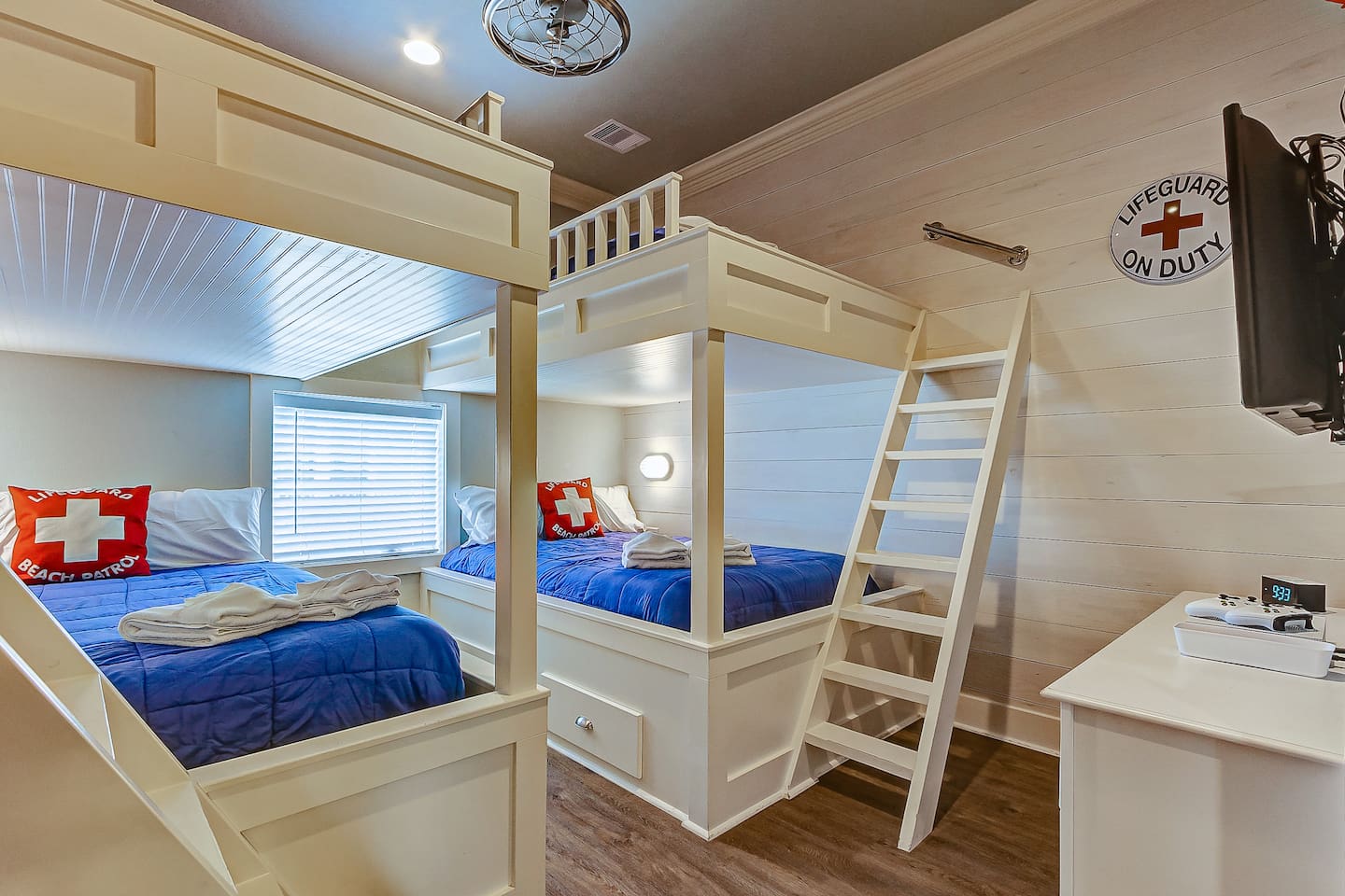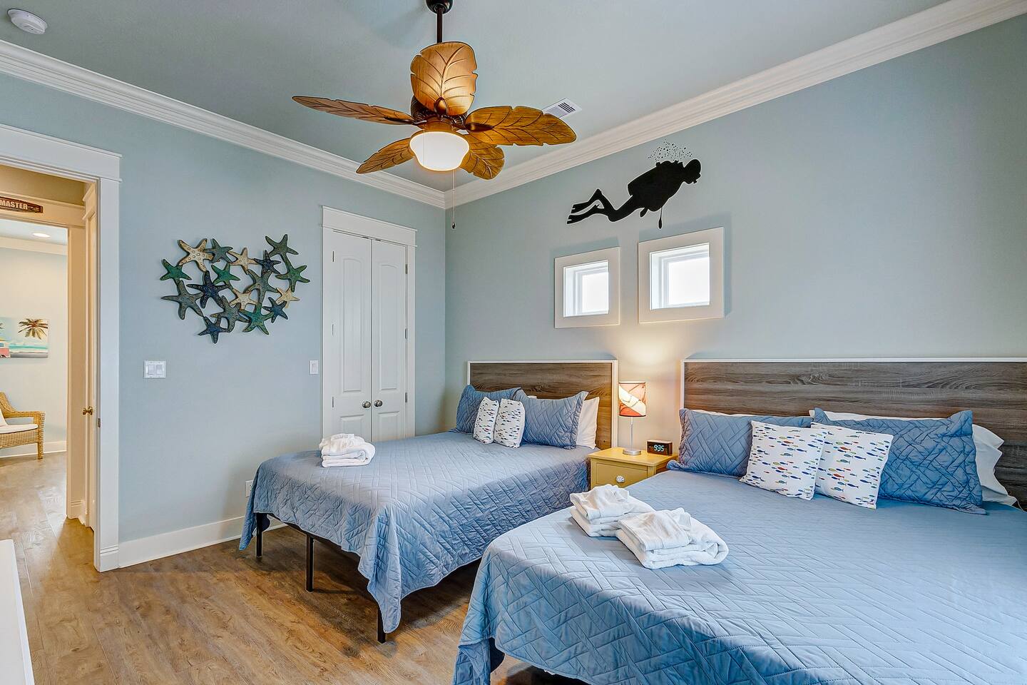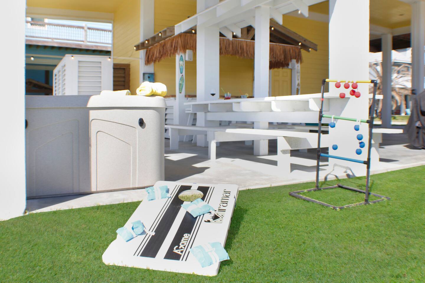 ❈ centrally located beach view property 5 houses from the sand ❈ sleeps 14 people comfortably in beds ❈ tons of outdoor space with 13 foot ceilings on ground level and a large covered deck ❈ private wrap-around balcony around the entire home ❈ 4-5 person private hot tub ❈ custom outdoor tiki bar ❈ bluetooth outdoor speakers ❈ ample outdoor seating with a large built-in dining table and patio chairs ❈ fully-loaded kitchen with high-end finishes and beautiful granite countertops ❈ outdoor shower with hot & cold water ❈ WIFI internet and smart TV’s everywhere ❈ thoughtfully and tastefully decorated throughout ❈ foosball table ❈ mini pool table ❈ outdoor cornhole boxes ❈ beach chairs, beach wagon, & rotating supply of beach toys ❈ ladderball, large Jenga, and frisbees ❈ board games, books & puzzles ❈ high chair, pack-n-play, kids dinnerware & utensils ❈ ceiling fans in every room ❈ fresh bed & bath linens for 14 people, and 6+ beach towels per reservation ❈ basic starter consumables to include: coffee, trash bags, a roll of paper towels, household cleaner, a fresh dish sponge, dish soap, dishwasher soap, hand soap, shampoo, conditioner, body wash, & a roll of toilet paper or two in each bathroom ❈ full-sized washer & dryer ❈ parking for 3-6 vehicles Miramar is where good vibes are made. In this cozy, recently renovated, custom built house with stunning beach views, you will switch your vacation mode ON to leave memorable footprints of your best adventure yet. As you make your way to the centrally located neighborhood, you will fall in love with the house having direct access to the beach. Sit back and enjoy the spectacular ocean views and gulf breeze from the porch, then stroll a short walk to the sandy beach. After an afternoon in the waves, rinse off in the outdoor shower, and then soak in the hot tub. Let the warm water fill the space around you, slow your breathing and take it all in. A self-care overindulgence which will melt your stress away. Make your way up to the entry where you will be greeted by open concept living room and kitchen with vaulted ceilings for all your guests to gather and enjoy. The nautical living room brings the feel of fishing boats navigating the subtle tones of the ocean. It offers comfortable seating for all sailors to watch their favorite shows or play with all kinds of board games for a family fun night. The kitchen has everything you need to prepare and serve meals for your stay including all new appliances large and small. The dining area has a beautiful custom-built table that seats 10 with additional seating for 4 more at the countertop kitchen. Three majestically adventure-inspired bedrooms provide comfortable accommodations for up to 14 guests. All the bedrooms have pillow top mattresses for a good night’s rest, flat screen smart TV’s, iphone clock / charging stations, and luggage racks in each closet. SURF MASTER This spacious master with an en-suite bathroom, garden tub and standalone tiled shower will transport you to a beautiful sunny day where you will catch the first wave of your stay. This surf style decorated room features a king size bed with a surfboard headboard as a focal point. Your stress will be swept away. You’ll recharge your batteries, and the waves will leave you craving for more. SCUBA TWIN After your initial dive into this undersea world, you’ll settle down on two queen size beds which look to be the perfect exploration craft for your next adventure. Almost immediately, your gaze comes into view of a school of fishes swimming around a hinged porthole. Can’t help but surrender to the sanctuary beneath the surface. SQUAD WATCH This outpost quarters 4 full size custom-built bunk beds to comfortably accommodate 8 guests, adults or children. This lifeguard inspired room may be everyone’s favorite.. Once the blow down is called, the squad returns to reload and be rescue-ready for the next adventure. A large entertainment area downstairs is the perfect place for outside gatherings, including a shower, picnic table, tiki bar, cornhole boards, gas and charcoal grills, patio poly Adirondack chairs and private parking for 3-6 cars. We provide lots of necessities including coffee, trash bags, a roll of paper towels, household cleaner, a fresh dish sponge, dish soap, dishwasher soap, hand soap, shampoo, conditioner, body wash, & a roll of toilet paper or two in each bathroom. Best of all, you’re at the beach! Plan your stay with your friends, family or come solo and let us help you create the perfect getaway. We work hard to maintain a place that you and yours can enjoy. Miramar has everything you need to enjoy a great vacation!