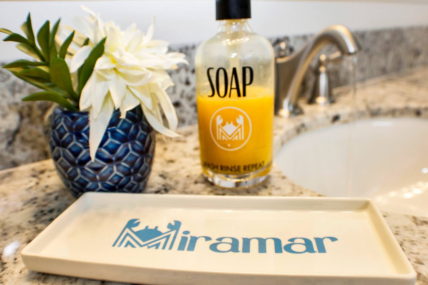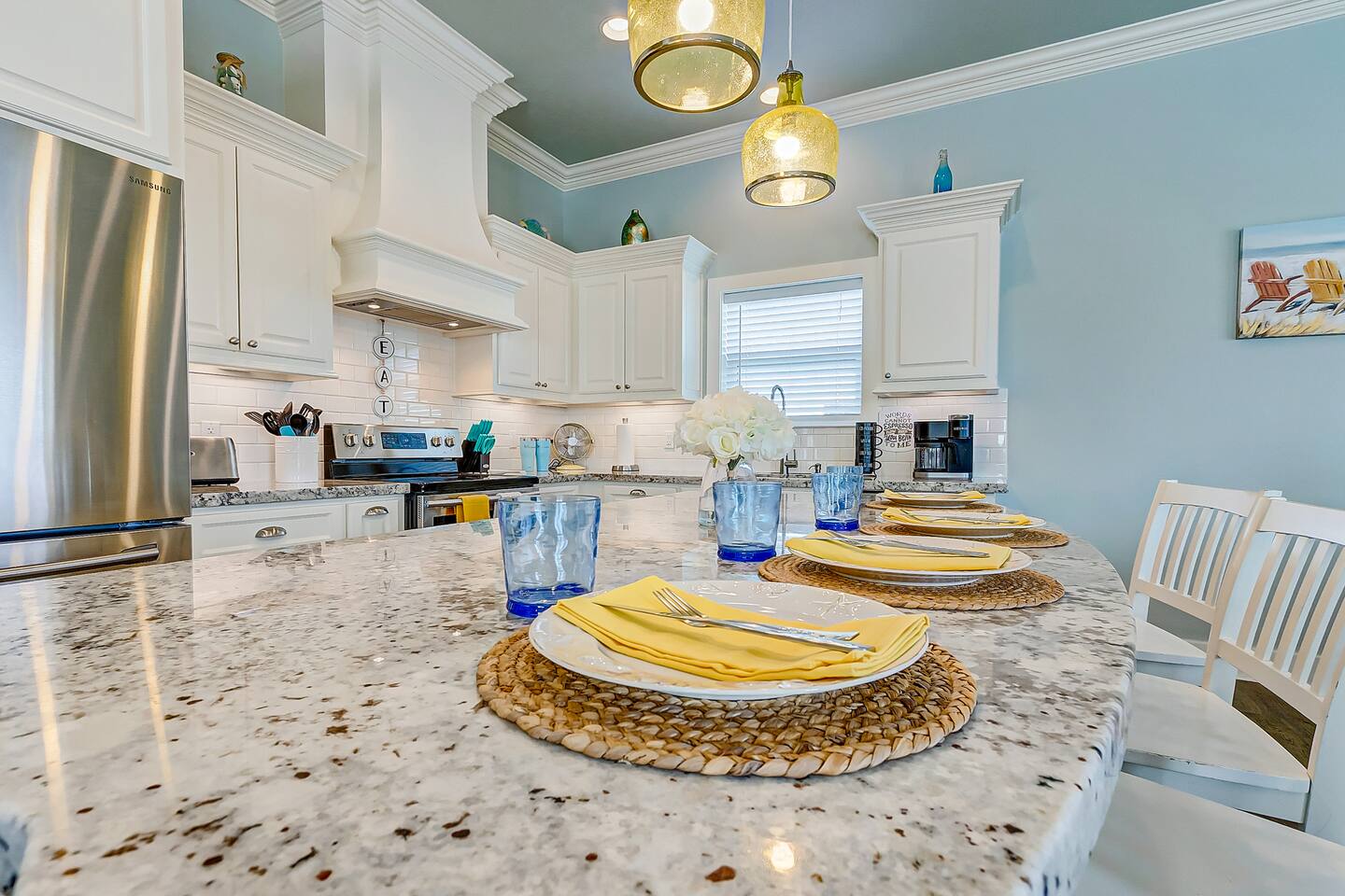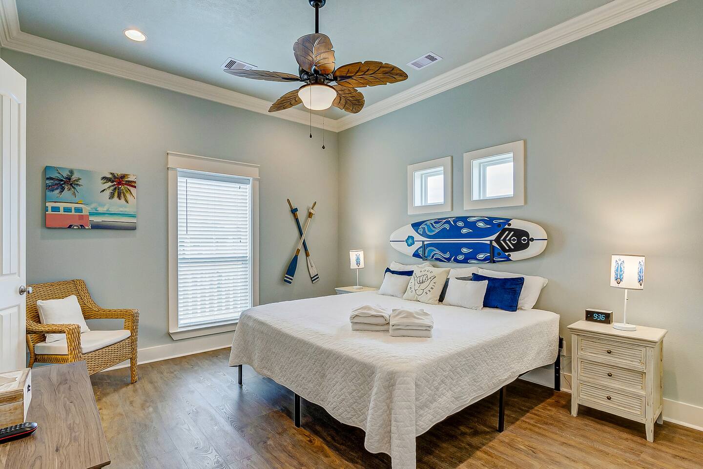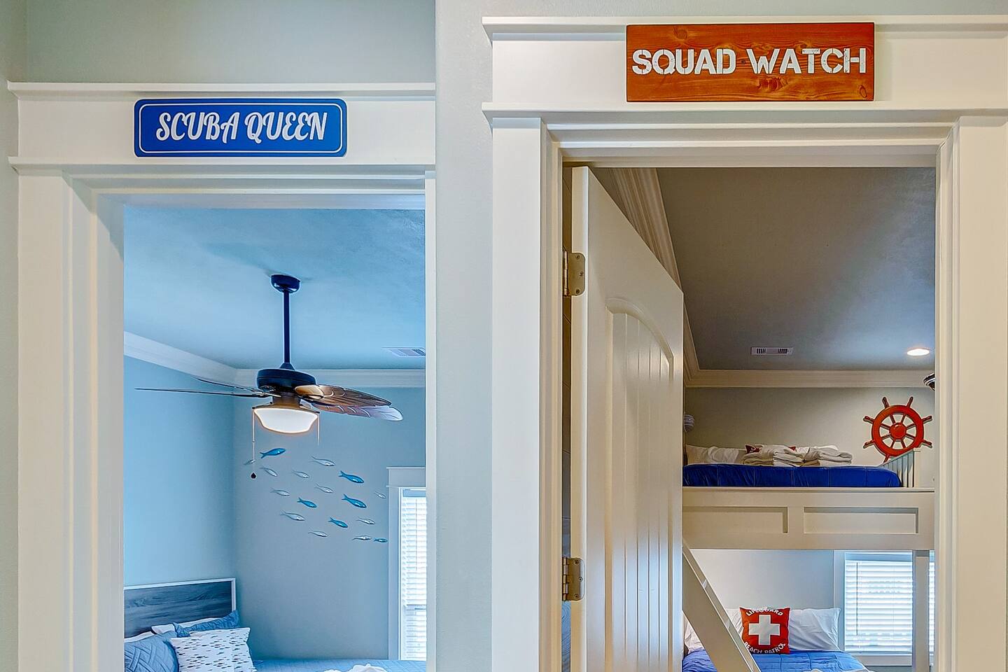 ❈ centrally located beach view property 5 houses from the sand ❈ sleeps 14 people comfortably in beds ❈ tons of outdoor space with 13 foot ceilings on ground level and a large covered deck ❈ private wrap-around balcony around the entire home ❈ 4-5 person private hot tub ❈ custom outdoor tiki bar ❈ bluetooth outdoor speakers ❈ ample outdoor seating with a large built-in dining table and patio chairs ❈ fully-loaded kitchen with high-end finishes and beautiful granite countertops ❈ outdoor shower with hot & cold water ❈ WIFI internet and smart TV’s everywhere ❈ thoughtfully and tastefully decorated throughout ❈ foosball table ❈ mini pool table ❈ outdoor cornhole boxes ❈ beach chairs, beach wagon, & rotating supply of beach toys ❈ ladderball, large Jenga, and frisbees ❈ board games, books & puzzles ❈ high chair, pack-n-play, kids dinnerware & utensils ❈ ceiling fans in every room ❈ fresh bed & bath linens for 14 people, and 6+ beach towels per reservation ❈ basic starter consumables to include: coffee, trash bags, a roll of paper towels, household cleaner, a fresh dish sponge, dish soap, dishwasher soap, hand soap, shampoo, conditioner, body wash, & a roll of toilet paper or two in each bathroom ❈ full-sized washer & dryer ❈ parking for 3-6 vehicles Miramar is where good vibes are made. In this cozy, recently renovated, custom built house with stunning beach views, you will switch your vacation mode ON to leave memorable footprints of your best adventure yet. As you make your way to the centrally located neighborhood, you will fall in love with the house having direct access to the beach. Sit back and enjoy the spectacular ocean views and gulf breeze from the porch, then stroll a short walk to the sandy beach. After an afternoon in the waves, rinse off in the outdoor shower, and then soak in the hot tub. Let the warm water fill the space around you, slow your breathing and take it all in. A self-care overindulgence which will melt your stress away. Make your way up to the entry where you will be greeted by open concept living room and kitchen with vaulted ceilings for all your guests to gather and enjoy. The nautical living room brings the feel of fishing boats navigating the subtle tones of the ocean. It offers comfortable seating for all sailors to watch their favorite shows or play with all kinds of board games for a family fun night. The kitchen has everything you need to prepare and serve meals for your stay including all new appliances large and small. The dining area has a beautiful custom-built table that seats 10 with additional seating for 4 more at the countertop kitchen. Three majestically adventure-inspired bedrooms provide comfortable accommodations for up to 14 guests. All the bedrooms have pillow top mattresses for a good night’s rest, flat screen smart TV’s, iphone clock / charging stations, and luggage racks in each closet. SURF MASTER This spacious master with an en-suite bathroom, garden tub and standalone tiled shower will transport you to a beautiful sunny day where you will catch the first wave of your stay. This surf style decorated room features a king size bed with a surfboard headboard as a focal point. Your stress will be swept away. You’ll recharge your batteries, and the waves will leave you craving for more. SCUBA TWIN After your initial dive into this undersea world, you’ll settle down on two queen size beds which look to be the perfect exploration craft for your next adventure. Almost immediately, your gaze comes into view of a school of fishes swimming around a hinged porthole. Can’t help but surrender to the sanctuary beneath the surface. SQUAD WATCH This outpost quarters 4 full size custom-built bunk beds to comfortably accommodate 8 guests, adults or children. This lifeguard inspired room may be everyone’s favorite.. Once the blow down is called, the squad returns to reload and be rescue-ready for the next adventure. A large entertainment area downstairs is the perfect place for outside gatherings, including a shower, picnic table, tiki bar, cornhole boards, gas and charcoal grills, patio poly Adirondack chairs and private parking for 3-6 cars. We provide lots of necessities including coffee, trash bags, a roll of paper towels, household cleaner, a fresh dish sponge, dish soap, dishwasher soap, hand soap, shampoo, conditioner, body wash, & a roll of toilet paper or two in each bathroom. Best of all, you’re at the beach! Plan your stay with your friends, family or come solo and let us help you create the perfect getaway. We work hard to maintain a place that you and yours can enjoy. Miramar has everything you need to enjoy a great vacation!