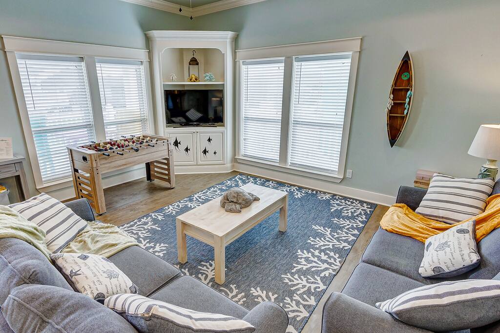 A private, top-notch beach house with a view & plenty of space for your family or group vacation. Beach View and Direct Beach Access 5 Houses Down - Sleeps 14 People - Hot Tub - Custom Tiki Bar - Plenty of Outdoor Seating - Large Kitchen with Quality Finishes - Fun Themed Bedrooms - BBQ Grill - Foosball Table - Mini Pool Table - WiFi - Smart TV’s Everywhere - Baby / Kid Items - Linens & Consumables Provided.