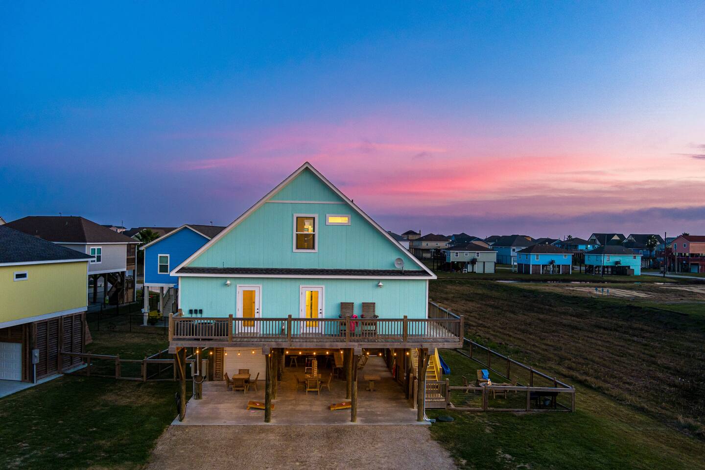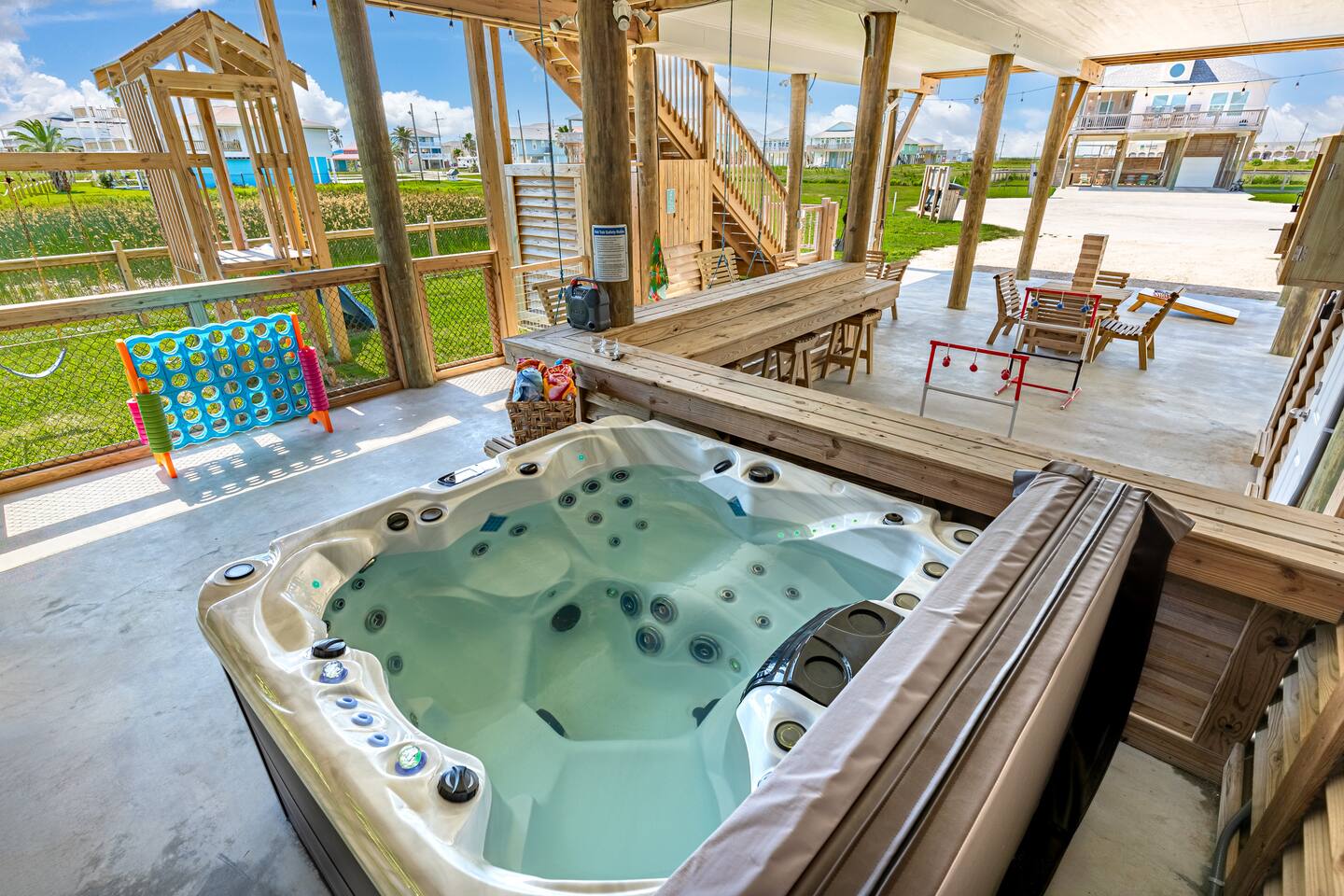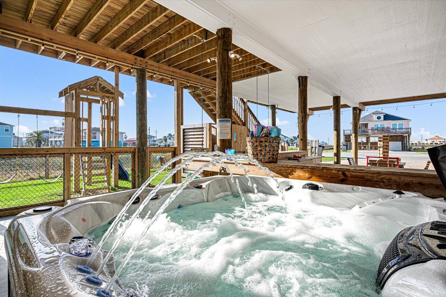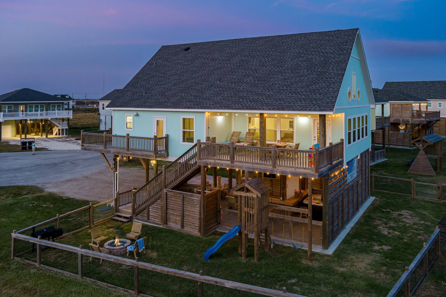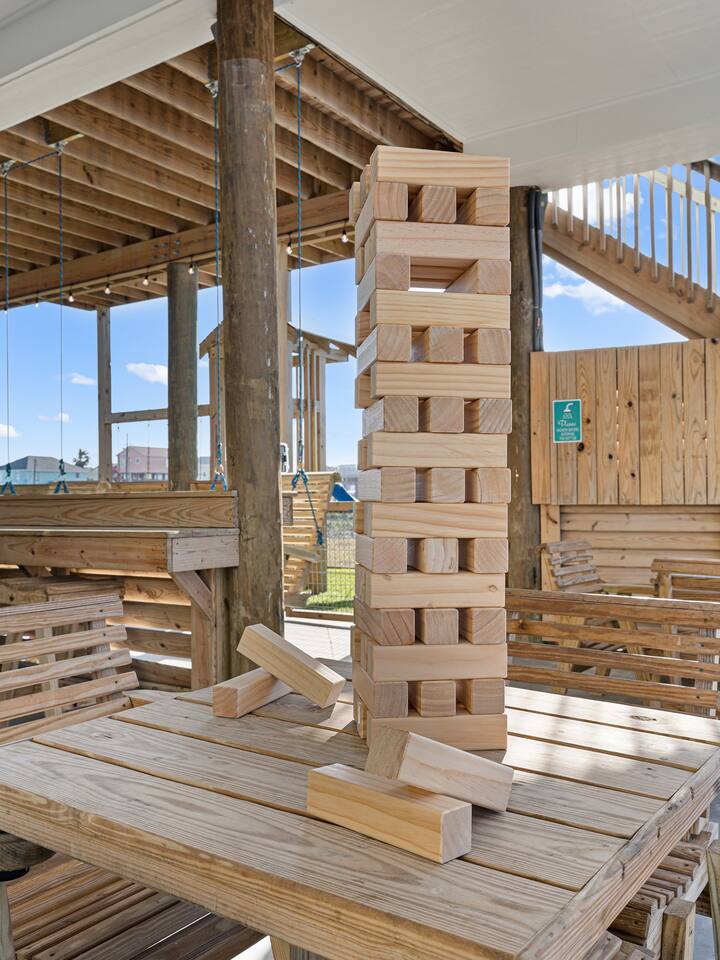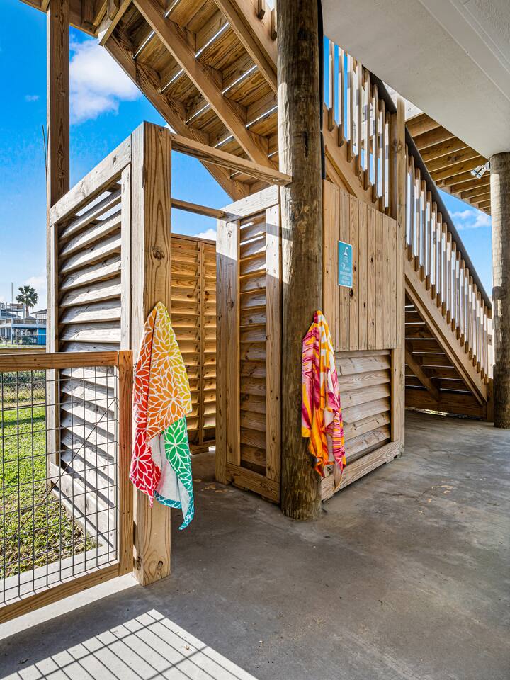 ❈ 2 story beach house that sleeps 20 people comfortably in custom-built beds ❈ tons of outdoor space with 13 foot ceilings on ground level and 2 upper decks ❈ large fenced in corner lot surrounded by over 4 acres of undeveloped land ❈ private wrap-around balcony to 3 of the 4 King bedrooms ❈ 5 person private luxury hot tub with 37 jets, water fountains, and LED package ❈ large outdoor bar and ample outdoor seating with 4 tables and 28 patio chairs ❈ fully-loaded kitchen with 2 full-sized refrigerators ❈ 3 central HVAC systems for maximum guest comfortability ❈ outdoor shower with hot & cold water ❈ built-in playground with slide and swings ❈ WIFI internet and smart TV’s everywhere ❈ portable outdoor speaker for use on property and indoor sound system ❈ decorated with art from local painters and photographers ❈ custom mural for photo opportunities ❈ fire pit ❈ large Char-Grill smoker / grill with grilling accessories ❈ 9-foot shuffleboard table ❈ custom-built cornhole boxes ❈ 6-foot air hockey table ❈ NFL Blitz football arcade game ❈ ladderball, outdoor Jenga, outdoor Connect 4, hook & ring game, basketballs, & frisbees ❈ board games, books & puzzles throughout the house ❈ beach chairs, beach wagon, & rotating supply of beach toys ❈ high chair, pack-n-play, kids dinnerware & utensils ❈ ceiling fans in every room and several pedestal fans available for use ❈ fresh bed & bath linens for 20 people, and 10 beach towels per reservation ❈ basic starter consumables to include: coffee, trash bags, a roll of paper towels, household cleaner, a fresh dish sponge, dish soap, dishwasher soap, hand soap, shampoo, conditioner, body wash, & a roll of toilet paper or two in each bathroom ❈ full-sized washer & dryer ❈ parking for 3-6 vehicles Welcome to Texas! Crystal Beach is Texas at its finest. Drive, park, barbeque, swim, fish, build sandcastles, have events, or just relax on this beautiful and convenient beach. The beach house has everything you could need to enjoy your vacation. The home is lifted 13 feet off of the ground, and the entire lower level is a finished patio with a bar, swinging chairs, dining tables, string lights, and tons of games for entertainment. An outdoor TV, radio and a brand new Catalina 5-person luxury hot tub make this space a paradise. There is a private outdoor shower with hot and cold water to rinse off after coming back from the beach, before getting in the spa, or just for enjoying a solid outdoor shower. The backyard is fenced in with a fire pit, a BBQ grill/smoker, and a playground for the kids. The DOG RUN allows you to let your pup (30 pounds or less) roam the upstairs patio space and take the stairs down to the fenced-in grass yard. The upper deck includes loungers, seating for dining and string lights for perfect evening ambiance. The 4 acres of undeveloped land surrounding the house create a nice sense of privacy and openness. With only 3 houses (as a seagull flies) between Stairway to Heaven and the beach, you can reliably hear the ocean right from the patio. Walk inside to your open-concept kitchen, dining, and living spaces. The kitchen is fully-equipped with everything you could possibly need to host your family or friends, including what we have deemed the “double fridge power move”. The kitchen and island area seats 12 people. Small appliances also include Keurig with latte capabilities, a blender, a toaster, a drip coffee maker, a mixer, and a crock pot. The large living room has 28 foot tall ceilings, 12 windows, a 9-foot shuffleboard table, comfortable seating for 8-10 people and a 65” smart TV with a sound bar and a subwoofer. It is decorated with genuine autographed art from local artists and photographers. You’ll find board games and puzzles in the hallway nook to help enjoy your time. The door to the left of the fridge allows you to create some separation from the stairway leading to the upper rooms. The first King bedroom has a door to the wraparound balcony, a 40-inch smart TV, a ceiling fan, and custom-built furniture. This bedroom features a full jack-and-jill bathroom with granite countertops, a large backlit mirror, double sinks, and a glass shower. You’ll find a pedestal fan, hangers, a high chair and a pack-n-play in the closet. King bedroom #2 has a door to the wraparound balcony, a 32-inch smart TV, a ceiling fan, and custom-built furniture. It also connects to the full jack-and-jill bathroom and is equipped with a pedestal fan. King bedroom #3 has a door to the wraparound balcony, a 40-inch smart TV, a ceiling fan, and custom-built furniture. You will find a pedestal fan and hangers in the closet. King bedroom #4 has a large window, a recliner, a 40-inch smart TV, a ceiling fan, and custom-built furniture. The “surf room” has super fun vibes with a real surfboard mounted on the wall over the bed. A full hallway bathroom with backlit mirror and built-in shelves will serve king bedrooms 3&4. Bedroom #5 is upstairs and has 2 full-sized beds, a large window, a 32-inch smart TV, a ceiling fan, and custom-built furniture. This bedroom features a full jack-and-jill bathroom with granite countertops, a backlit mirror and a glass shower. Bedroom #6 is a shared space with the upper game room. It has 4 queen beds, a 50-inch smart TV, an oscillating wall-mounted fan, books and games for kids, an air hockey table and an NFL Blitz football arcade game. This room has direct access to the upper jack-and-jill bathroom with a separate entrance from bedroom #5. The laundry room in the hallway has a full sized washer and dryer, and an iron and ironing board. We work hard to maintain a place that you and yours can enjoy. Come stay with us and indulge in the beach life!!