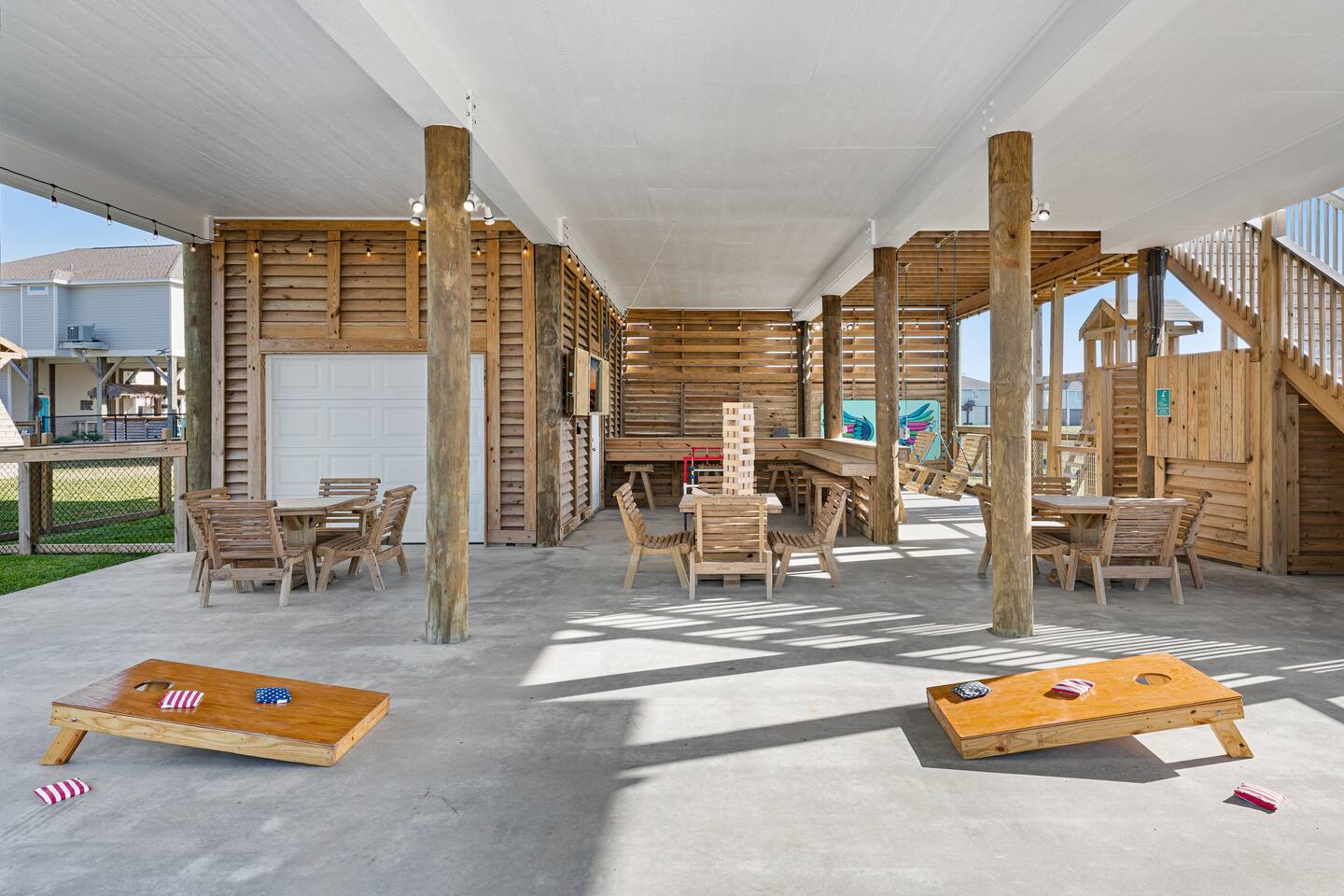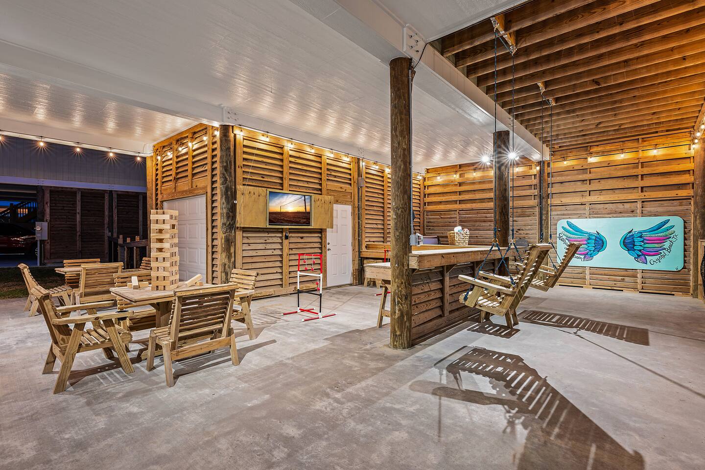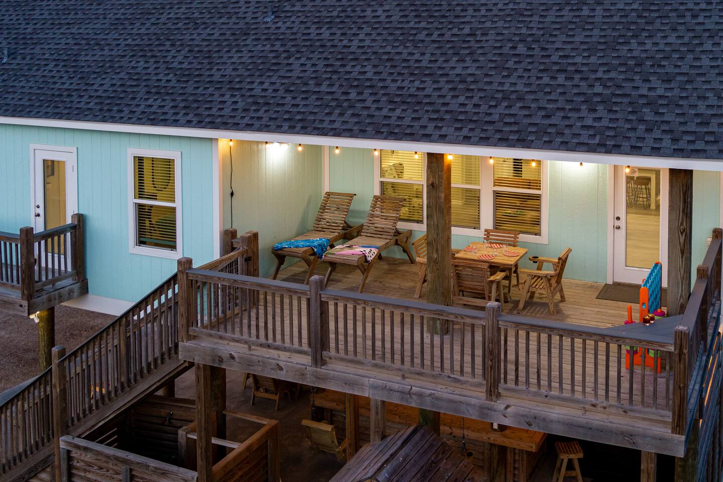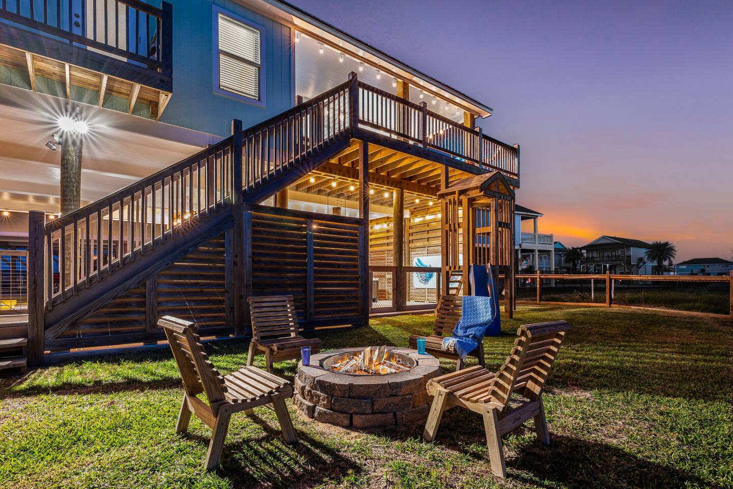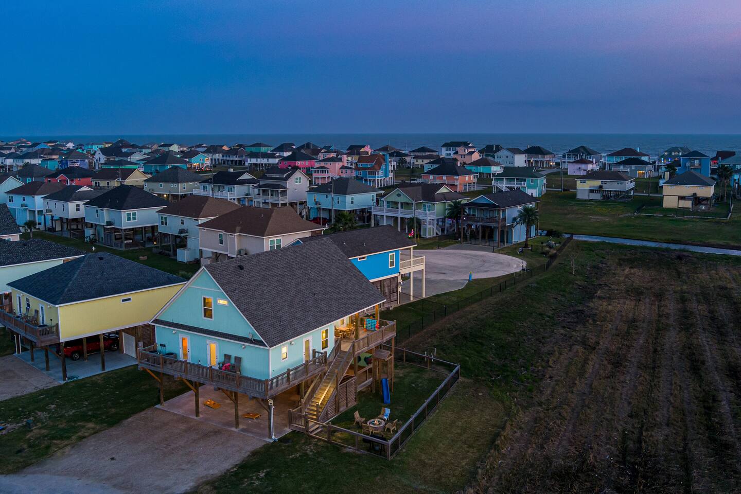 ❈ 2 story beach house that sleeps 20 people comfortably in custom-built beds ❈ tons of outdoor space with 13 foot ceilings on ground level and 2 upper decks ❈ large fenced in corner lot surrounded by over 4 acres of undeveloped land ❈ private wrap-around balcony to 3 of the 4 King bedrooms ❈ 5 person private luxury hot tub with 37 jets, water fountains, and LED package ❈ large outdoor bar and ample outdoor seating with 4 tables and 28 patio chairs ❈ fully-loaded kitchen with 2 full-sized refrigerators ❈ 3 central HVAC systems for maximum guest comfortability ❈ outdoor shower with hot & cold water ❈ built-in playground with slide and swings ❈ WIFI internet and smart TV’s everywhere ❈ portable outdoor speaker for use on property and indoor sound system ❈ decorated with art from local painters and photographers ❈ custom mural for photo opportunities ❈ fire pit ❈ large Char-Grill smoker / grill with grilling accessories ❈ 9-foot shuffleboard table ❈ custom-built cornhole boxes ❈ 6-foot air hockey table ❈ NFL Blitz football arcade game ❈ ladderball, outdoor Jenga, outdoor Connect 4, hook & ring game, basketballs, & frisbees ❈ board games, books & puzzles throughout the house ❈ beach chairs, beach wagon, & rotating supply of beach toys ❈ high chair, pack-n-play, kids dinnerware & utensils ❈ ceiling fans in every room and several pedestal fans available for use ❈ fresh bed & bath linens for 20 people, and 10 beach towels per reservation ❈ basic starter consumables to include: coffee, trash bags, a roll of paper towels, household cleaner, a fresh dish sponge, dish soap, dishwasher soap, hand soap, shampoo, conditioner, body wash, & a roll of toilet paper or two in each bathroom ❈ full-sized washer & dryer ❈ parking for 3-6 vehicles Welcome to Texas! Crystal Beach is Texas at its finest. Drive, park, barbeque, swim, fish, build sandcastles, have events, or just relax on this beautiful and convenient beach. The beach house has everything you could need to enjoy your vacation. The home is lifted 13 feet off of the ground, and the entire lower level is a finished patio with a bar, swinging chairs, dining tables, string lights, and tons of games for entertainment. An outdoor TV, radio and a brand new Catalina 5-person luxury hot tub make this space a paradise. There is a private outdoor shower with hot and cold water to rinse off after coming back from the beach, before getting in the spa, or just for enjoying a solid outdoor shower. The backyard is fenced in with a fire pit, a BBQ grill/smoker, and a playground for the kids. The DOG RUN allows you to let your pup (30 pounds or less) roam the upstairs patio space and take the stairs down to the fenced-in grass yard. The upper deck includes loungers, seating for dining and string lights for perfect evening ambiance. The 4 acres of undeveloped land surrounding the house create a nice sense of privacy and openness. With only 3 houses (as a seagull flies) between Stairway to Heaven and the beach, you can reliably hear the ocean right from the patio. Walk inside to your open-concept kitchen, dining, and living spaces. The kitchen is fully-equipped with everything you could possibly need to host your family or friends, including what we have deemed the “double fridge power move”. The kitchen and island area seats 12 people. Small appliances also include Keurig with latte capabilities, a blender, a toaster, a drip coffee maker, a mixer, and a crock pot. The large living room has 28 foot tall ceilings, 12 windows, a 9-foot shuffleboard table, comfortable seating for 8-10 people and a 65” smart TV with a sound bar and a subwoofer. It is decorated with genuine autographed art from local artists and photographers. You’ll find board games and puzzles in the hallway nook to help enjoy your time. The door to the left of the fridge allows you to create some separation from the stairway leading to the upper rooms. The first King bedroom has a door to the wraparound balcony, a 40-inch smart TV, a ceiling fan, and custom-built furniture. This bedroom features a full jack-and-jill bathroom with granite countertops, a large backlit mirror, double sinks, and a glass shower. You’ll find a pedestal fan, hangers, a high chair and a pack-n-play in the closet. King bedroom #2 has a door to the wraparound balcony, a 32-inch smart TV, a ceiling fan, and custom-built furniture. It also connects to the full jack-and-jill bathroom and is equipped with a pedestal fan. King bedroom #3 has a door to the wraparound balcony, a 40-inch smart TV, a ceiling fan, and custom-built furniture. You will find a pedestal fan and hangers in the closet. King bedroom #4 has a large window, a recliner, a 40-inch smart TV, a ceiling fan, and custom-built furniture. The “surf room” has super fun vibes with a real surfboard mounted on the wall over the bed. A full hallway bathroom with backlit mirror and built-in shelves will serve king bedrooms 3&4. Bedroom #5 is upstairs and has 2 full-sized beds, a large window, a 32-inch smart TV, a ceiling fan, and custom-built furniture. This bedroom features a full jack-and-jill bathroom with granite countertops, a backlit mirror and a glass shower. Bedroom #6 is a shared space with the upper game room. It has 4 queen beds, a 50-inch smart TV, an oscillating wall-mounted fan, books and games for kids, an air hockey table and an NFL Blitz football arcade game. This room has direct access to the upper jack-and-jill bathroom with a separate entrance from bedroom #5. The laundry room in the hallway has a full sized washer and dryer, and an iron and ironing board. We work hard to maintain a place that you and yours can enjoy. Come stay with us and indulge in the beach life!!