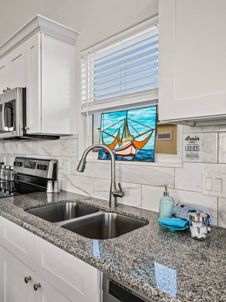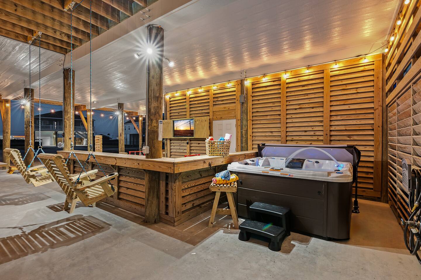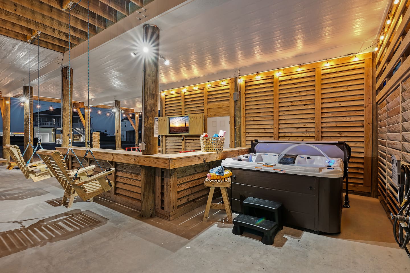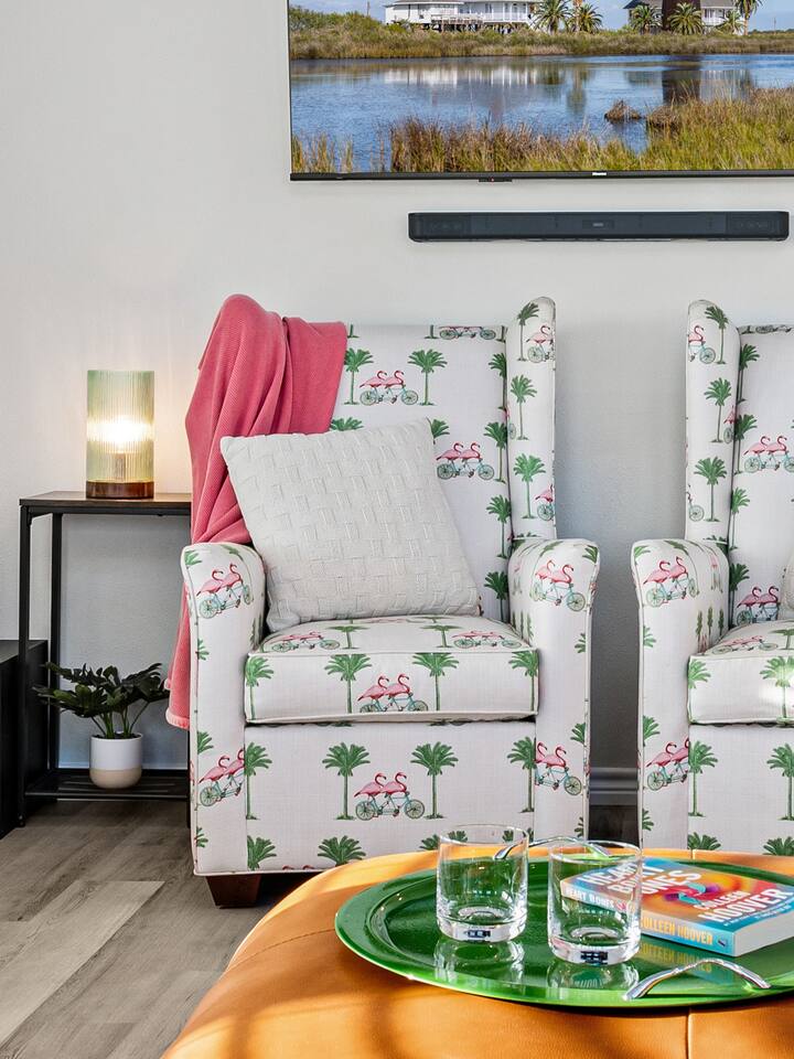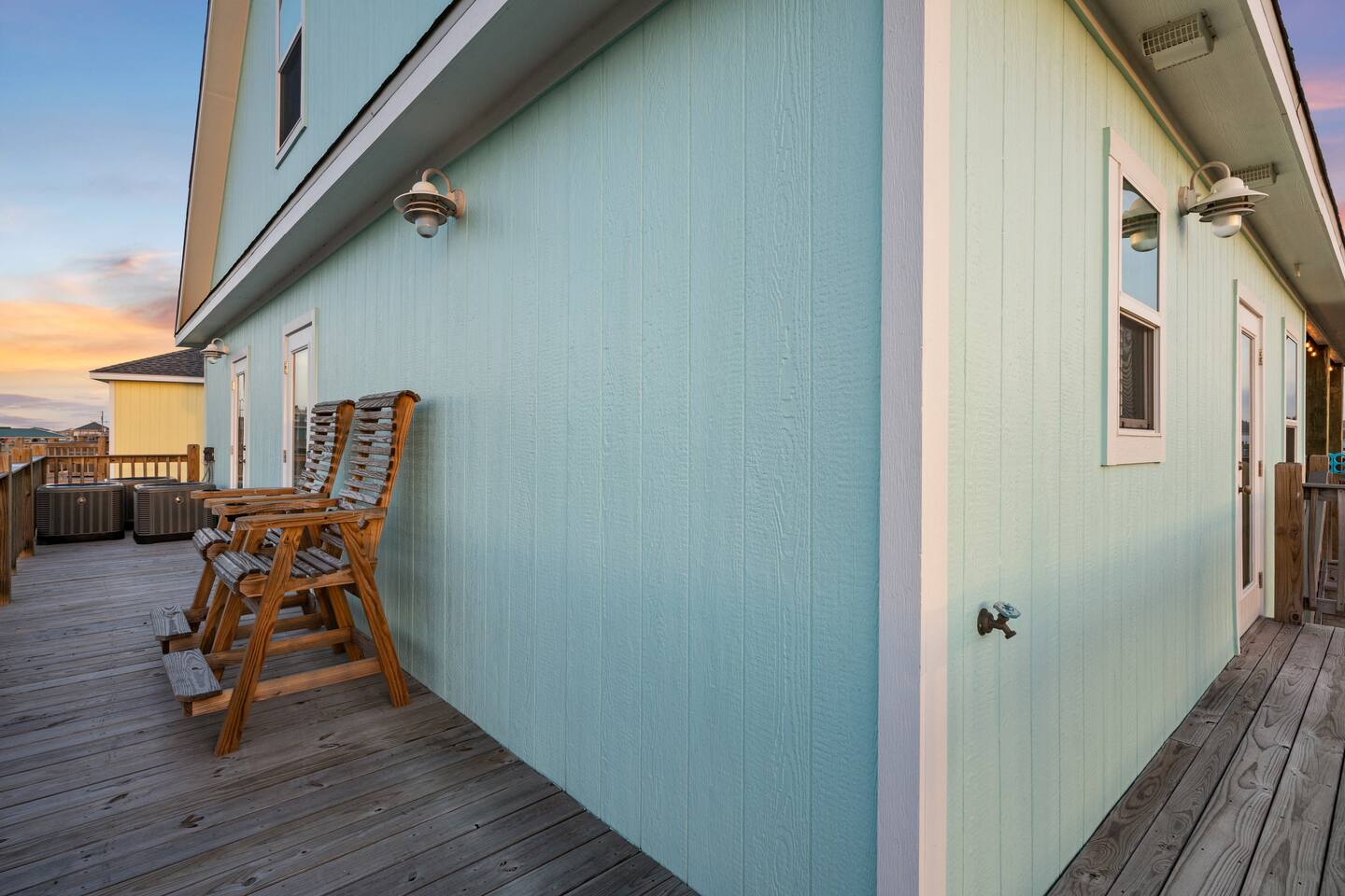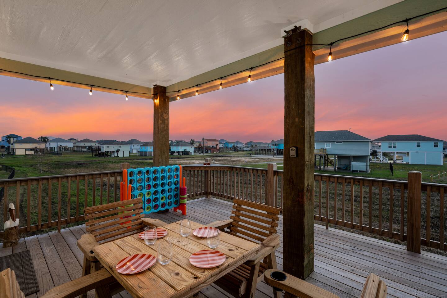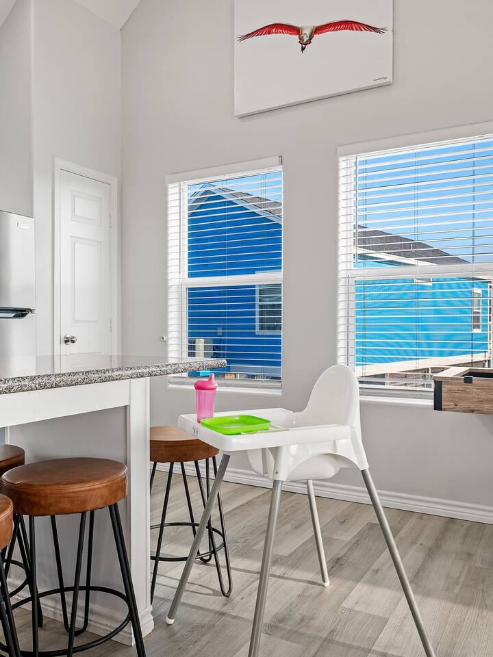 ❈ 2 story beach house that sleeps 20 people comfortably in custom-built beds ❈ tons of outdoor space with 13 foot ceilings on ground level and 2 upper decks ❈ large fenced in corner lot surrounded by over 4 acres of undeveloped land ❈ private wrap-around balcony to 3 of the 4 King bedrooms ❈ 5 person private luxury hot tub with 37 jets, water fountains, and LED package ❈ large outdoor bar and ample outdoor seating with 4 tables and 28 patio chairs ❈ fully-loaded kitchen with 2 full-sized refrigerators ❈ 3 central HVAC systems for maximum guest comfortability ❈ outdoor shower with hot & cold water ❈ built-in playground with slide and swings ❈ WIFI internet and smart TV’s everywhere ❈ portable outdoor speaker for use on property and indoor sound system ❈ decorated with art from local painters and photographers ❈ custom mural for photo opportunities ❈ fire pit ❈ large Char-Grill smoker / grill with grilling accessories ❈ 9-foot shuffleboard table ❈ custom-built cornhole boxes ❈ 6-foot air hockey table ❈ NFL Blitz football arcade game ❈ ladderball, outdoor Jenga, outdoor Connect 4, hook & ring game, basketballs, & frisbees ❈ board games, books & puzzles throughout the house ❈ beach chairs, beach wagon, & rotating supply of beach toys ❈ high chair, pack-n-play, kids dinnerware & utensils ❈ ceiling fans in every room and several pedestal fans available for use ❈ fresh bed & bath linens for 20 people, and 10 beach towels per reservation ❈ basic starter consumables to include: coffee, trash bags, a roll of paper towels, household cleaner, a fresh dish sponge, dish soap, dishwasher soap, hand soap, shampoo, conditioner, body wash, & a roll of toilet paper or two in each bathroom ❈ full-sized washer & dryer ❈ parking for 3-6 vehicles Welcome to Texas! Crystal Beach is Texas at its finest. Drive, park, barbeque, swim, fish, build sandcastles, have events, or just relax on this beautiful and convenient beach. The beach house has everything you could need to enjoy your vacation. The home is lifted 13 feet off of the ground, and the entire lower level is a finished patio with a bar, swinging chairs, dining tables, string lights, and tons of games for entertainment. An outdoor TV, radio and a brand new Catalina 5-person luxury hot tub make this space a paradise. There is a private outdoor shower with hot and cold water to rinse off after coming back from the beach, before getting in the spa, or just for enjoying a solid outdoor shower. The backyard is fenced in with a fire pit, a BBQ grill/smoker, and a playground for the kids. The DOG RUN allows you to let your pup (30 pounds or less) roam the upstairs patio space and take the stairs down to the fenced-in grass yard. The upper deck includes loungers, seating for dining and string lights for perfect evening ambiance. The 4 acres of undeveloped land surrounding the house create a nice sense of privacy and openness. With only 3 houses (as a seagull flies) between Stairway to Heaven and the beach, you can reliably hear the ocean right from the patio. Walk inside to your open-concept kitchen, dining, and living spaces. The kitchen is fully-equipped with everything you could possibly need to host your family or friends, including what we have deemed the “double fridge power move”. The kitchen and island area seats 12 people. Small appliances also include Keurig with latte capabilities, a blender, a toaster, a drip coffee maker, a mixer, and a crock pot. The large living room has 28 foot tall ceilings, 12 windows, a 9-foot shuffleboard table, comfortable seating for 8-10 people and a 65” smart TV with a sound bar and a subwoofer. It is decorated with genuine autographed art from local artists and photographers. You’ll find board games and puzzles in the hallway nook to help enjoy your time. The door to the left of the fridge allows you to create some separation from the stairway leading to the upper rooms. The first King bedroom has a door to the wraparound balcony, a 40-inch smart TV, a ceiling fan, and custom-built furniture. This bedroom features a full jack-and-jill bathroom with granite countertops, a large backlit mirror, double sinks, and a glass shower. You’ll find a pedestal fan, hangers, a high chair and a pack-n-play in the closet. King bedroom #2 has a door to the wraparound balcony, a 32-inch smart TV, a ceiling fan, and custom-built furniture. It also connects to the full jack-and-jill bathroom and is equipped with a pedestal fan. King bedroom #3 has a door to the wraparound balcony, a 40-inch smart TV, a ceiling fan, and custom-built furniture. You will find a pedestal fan and hangers in the closet. King bedroom #4 has a large window, a recliner, a 40-inch smart TV, a ceiling fan, and custom-built furniture. The “surf room” has super fun vibes with a real surfboard mounted on the wall over the bed. A full hallway bathroom with backlit mirror and built-in shelves will serve king bedrooms 3&4. Bedroom #5 is upstairs and has 2 full-sized beds, a large window, a 32-inch smart TV, a ceiling fan, and custom-built furniture. This bedroom features a full jack-and-jill bathroom with granite countertops, a backlit mirror and a glass shower. Bedroom #6 is a shared space with the upper game room. It has 4 queen beds, a 50-inch smart TV, an oscillating wall-mounted fan, books and games for kids, an air hockey table and an NFL Blitz football arcade game. This room has direct access to the upper jack-and-jill bathroom with a separate entrance from bedroom #5. The laundry room in the hallway has a full sized washer and dryer, and an iron and ironing board. We work hard to maintain a place that you and yours can enjoy. Come stay with us and indulge in the beach life!!