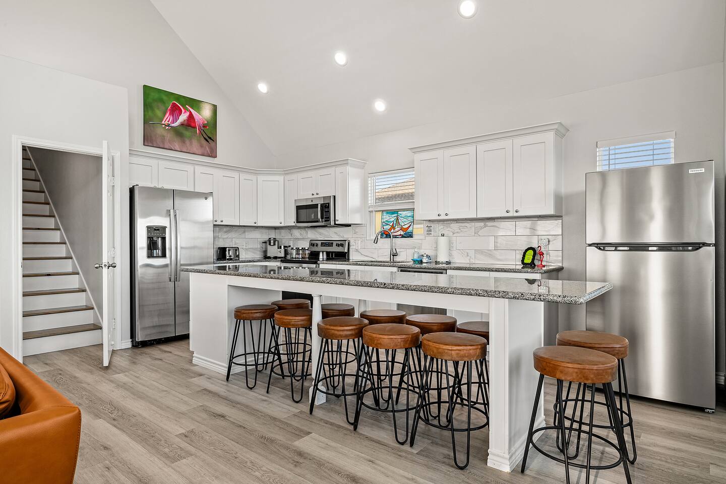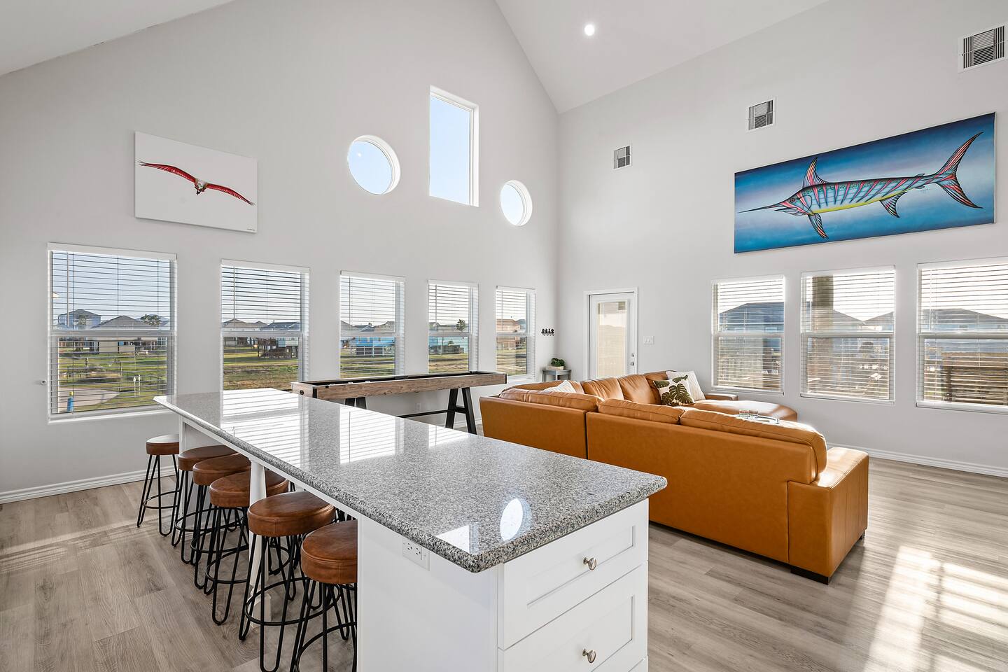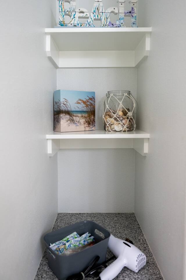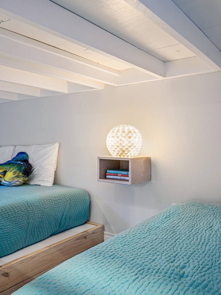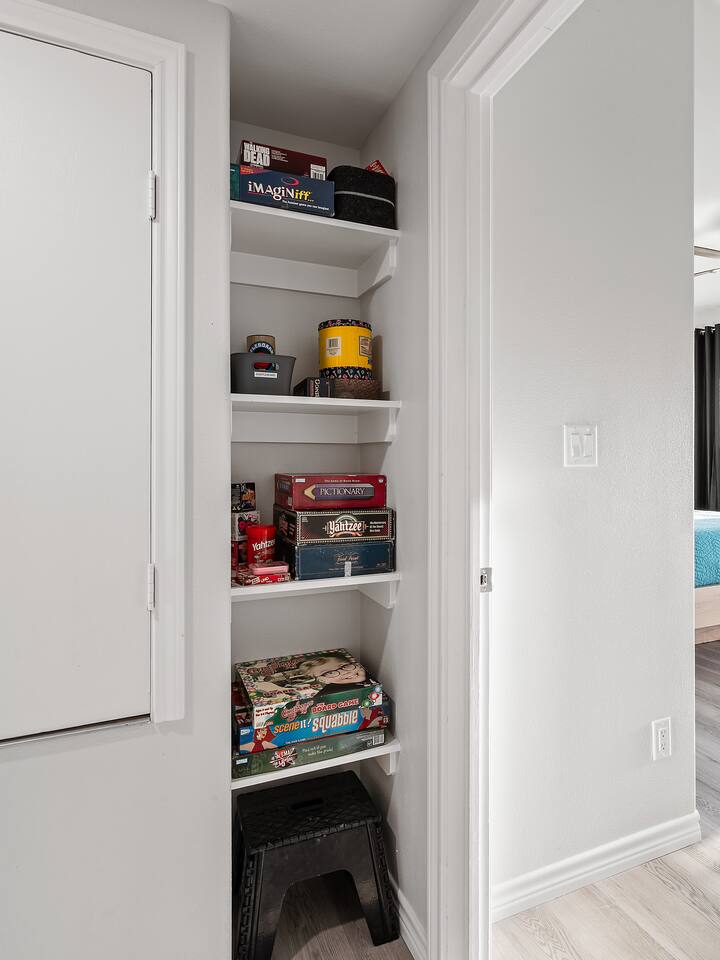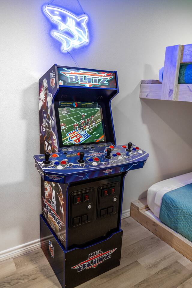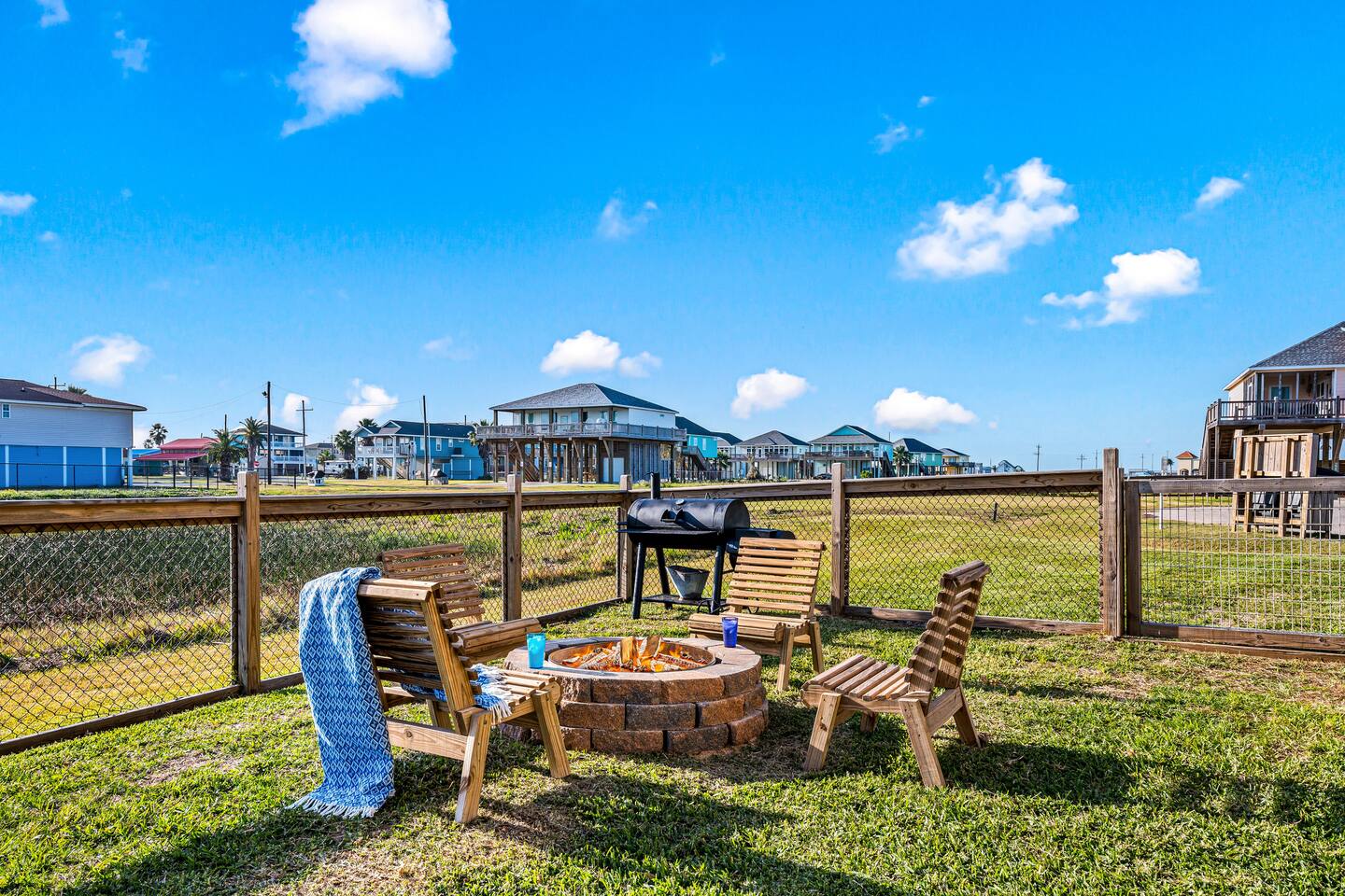 ❈ 2 story beach house that sleeps 20 people comfortably in custom-built beds ❈ tons of outdoor space with 13 foot ceilings on ground level and 2 upper decks ❈ large fenced in corner lot surrounded by over 4 acres of undeveloped land ❈ private wrap-around balcony to 3 of the 4 King bedrooms ❈ 5 person private luxury hot tub with 37 jets, water fountains, and LED package ❈ large outdoor bar and ample outdoor seating with 4 tables and 28 patio chairs ❈ fully-loaded kitchen with 2 full-sized refrigerators ❈ 3 central HVAC systems for maximum guest comfortability ❈ outdoor shower with hot & cold water ❈ built-in playground with slide and swings ❈ WIFI internet and smart TV’s everywhere ❈ portable outdoor speaker for use on property and indoor sound system ❈ decorated with art from local painters and photographers ❈ custom mural for photo opportunities ❈ fire pit ❈ large Char-Grill smoker / grill with grilling accessories ❈ 9-foot shuffleboard table ❈ custom-built cornhole boxes ❈ 6-foot air hockey table ❈ NFL Blitz football arcade game ❈ ladderball, outdoor Jenga, outdoor Connect 4, hook & ring game, basketballs, & frisbees ❈ board games, books & puzzles throughout the house ❈ beach chairs, beach wagon, & rotating supply of beach toys ❈ high chair, pack-n-play, kids dinnerware & utensils ❈ ceiling fans in every room and several pedestal fans available for use ❈ fresh bed & bath linens for 20 people, and 10 beach towels per reservation ❈ basic starter consumables to include: coffee, trash bags, a roll of paper towels, household cleaner, a fresh dish sponge, dish soap, dishwasher soap, hand soap, shampoo, conditioner, body wash, & a roll of toilet paper or two in each bathroom ❈ full-sized washer & dryer ❈ parking for 3-6 vehicles Welcome to Texas! Crystal Beach is Texas at its finest. Drive, park, barbeque, swim, fish, build sandcastles, have events, or just relax on this beautiful and convenient beach. The beach house has everything you could need to enjoy your vacation. The home is lifted 13 feet off of the ground, and the entire lower level is a finished patio with a bar, swinging chairs, dining tables, string lights, and tons of games for entertainment. An outdoor TV, radio and a brand new Catalina 5-person luxury hot tub make this space a paradise. There is a private outdoor shower with hot and cold water to rinse off after coming back from the beach, before getting in the spa, or just for enjoying a solid outdoor shower. The backyard is fenced in with a fire pit, a BBQ grill/smoker, and a playground for the kids. The DOG RUN allows you to let your pup (30 pounds or less) roam the upstairs patio space and take the stairs down to the fenced-in grass yard. The upper deck includes loungers, seating for dining and string lights for perfect evening ambiance. The 4 acres of undeveloped land surrounding the house create a nice sense of privacy and openness. With only 3 houses (as a seagull flies) between Stairway to Heaven and the beach, you can reliably hear the ocean right from the patio. Walk inside to your open-concept kitchen, dining, and living spaces. The kitchen is fully-equipped with everything you could possibly need to host your family or friends, including what we have deemed the “double fridge power move”. The kitchen and island area seats 12 people. Small appliances also include Keurig with latte capabilities, a blender, a toaster, a drip coffee maker, a mixer, and a crock pot. The large living room has 28 foot tall ceilings, 12 windows, a 9-foot shuffleboard table, comfortable seating for 8-10 people and a 65” smart TV with a sound bar and a subwoofer. It is decorated with genuine autographed art from local artists and photographers. You’ll find board games and puzzles in the hallway nook to help enjoy your time. The door to the left of the fridge allows you to create some separation from the stairway leading to the upper rooms. The first King bedroom has a door to the wraparound balcony, a 40-inch smart TV, a ceiling fan, and custom-built furniture. This bedroom features a full jack-and-jill bathroom with granite countertops, a large backlit mirror, double sinks, and a glass shower. You’ll find a pedestal fan, hangers, a high chair and a pack-n-play in the closet. King bedroom #2 has a door to the wraparound balcony, a 32-inch smart TV, a ceiling fan, and custom-built furniture. It also connects to the full jack-and-jill bathroom and is equipped with a pedestal fan. King bedroom #3 has a door to the wraparound balcony, a 40-inch smart TV, a ceiling fan, and custom-built furniture. You will find a pedestal fan and hangers in the closet. King bedroom #4 has a large window, a recliner, a 40-inch smart TV, a ceiling fan, and custom-built furniture. The “surf room” has super fun vibes with a real surfboard mounted on the wall over the bed. A full hallway bathroom with backlit mirror and built-in shelves will serve king bedrooms 3&4. Bedroom #5 is upstairs and has 2 full-sized beds, a large window, a 32-inch smart TV, a ceiling fan, and custom-built furniture. This bedroom features a full jack-and-jill bathroom with granite countertops, a backlit mirror and a glass shower. Bedroom #6 is a shared space with the upper game room. It has 4 queen beds, a 50-inch smart TV, an oscillating wall-mounted fan, books and games for kids, an air hockey table and an NFL Blitz football arcade game. This room has direct access to the upper jack-and-jill bathroom with a separate entrance from bedroom #5. The laundry room in the hallway has a full sized washer and dryer, and an iron and ironing board. We work hard to maintain a place that you and yours can enjoy. Come stay with us and indulge in the beach life!!