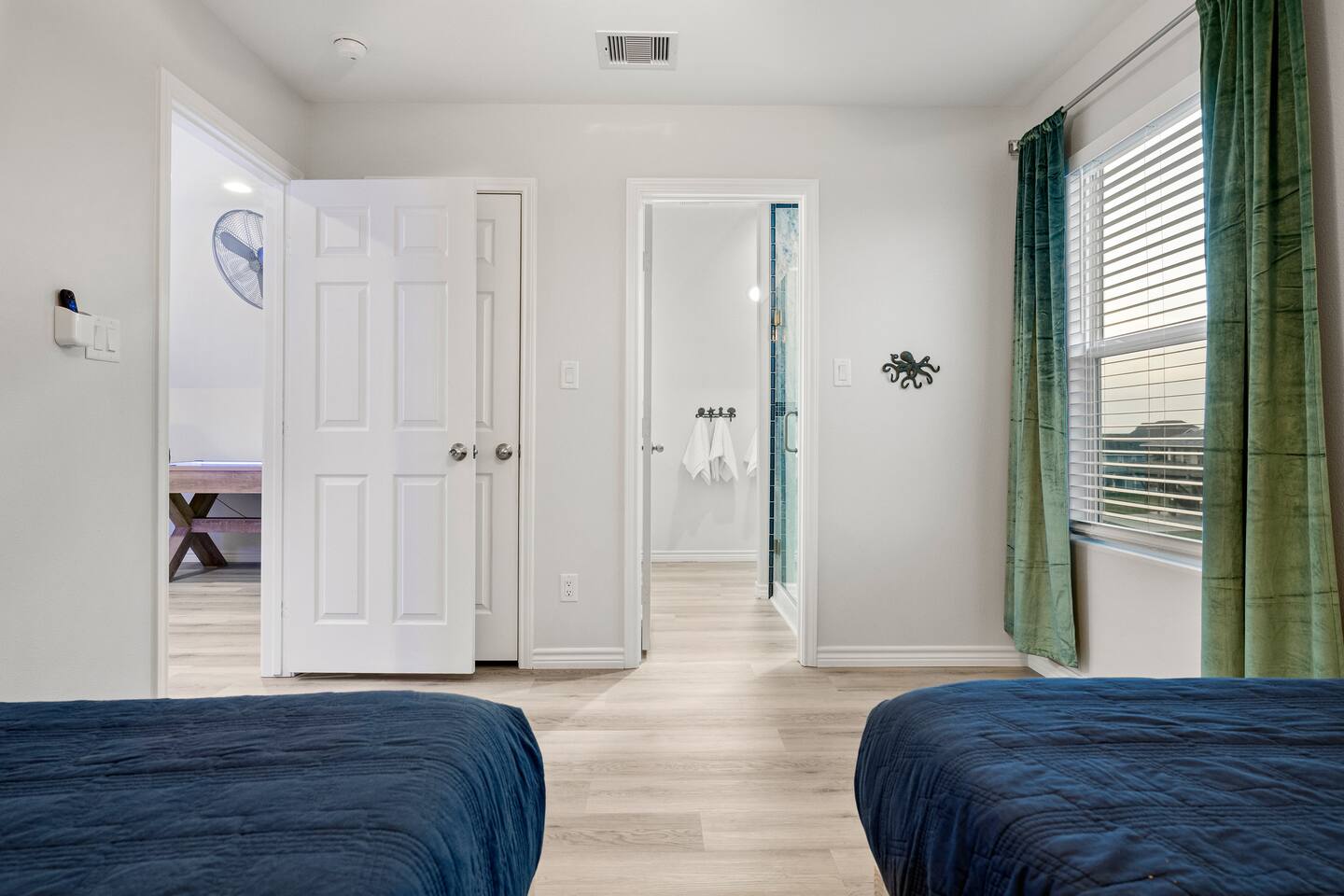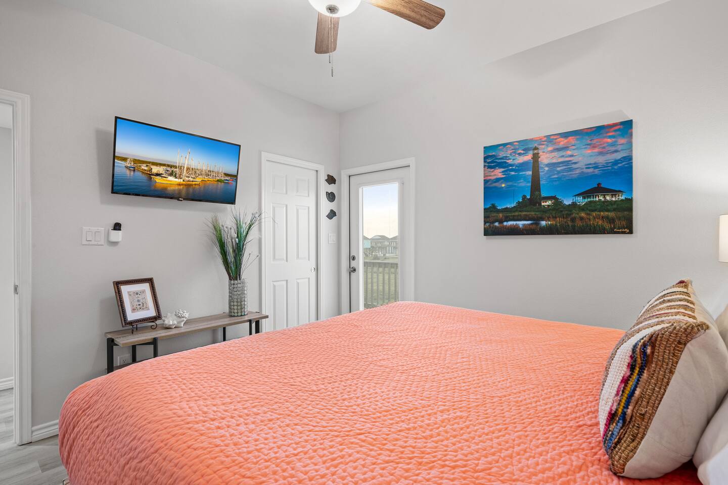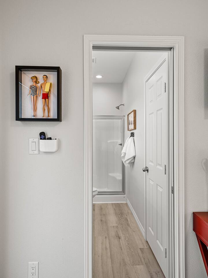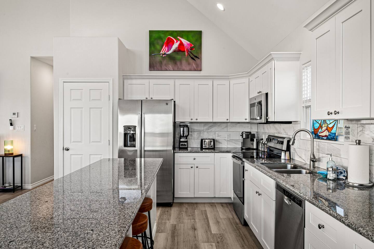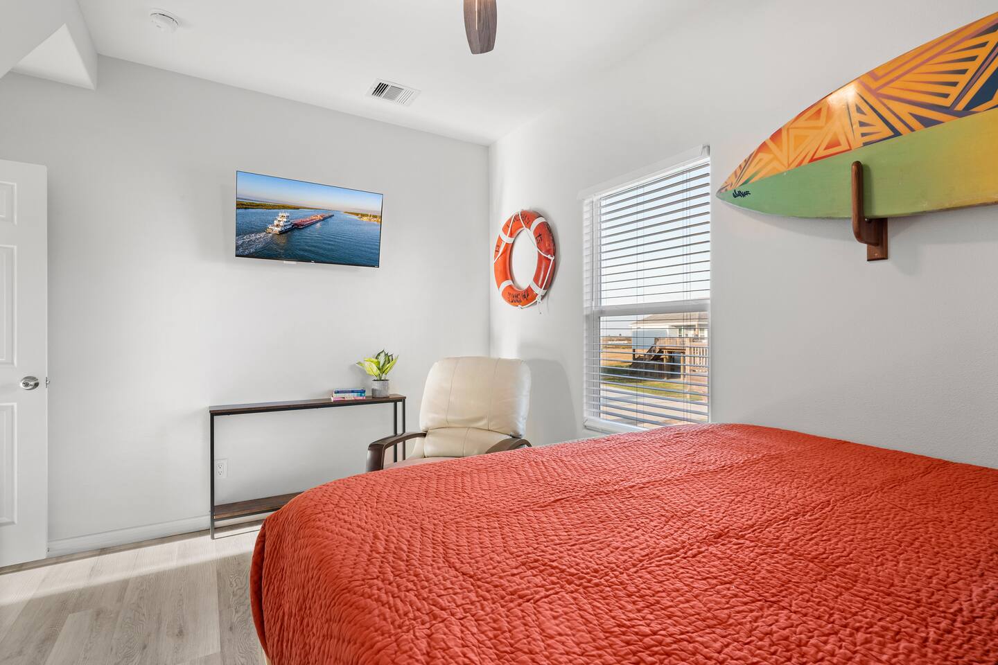 ❈ 2 story beach house that sleeps 20 people comfortably in custom-built beds ❈ tons of outdoor space with 13 foot ceilings on ground level and 2 upper decks ❈ large fenced in corner lot surrounded by over 4 acres of undeveloped land ❈ private wrap-around balcony to 3 of the 4 King bedrooms ❈ 5 person private luxury hot tub with 37 jets, water fountains, and LED package ❈ large outdoor bar and ample outdoor seating with 4 tables and 28 patio chairs ❈ fully-loaded kitchen with 2 full-sized refrigerators ❈ 3 central HVAC systems for maximum guest comfortability ❈ outdoor shower with hot & cold water ❈ built-in playground with slide and swings ❈ WIFI internet and smart TV’s everywhere ❈ portable outdoor speaker for use on property and indoor sound system ❈ decorated with art from local painters and photographers ❈ custom mural for photo opportunities ❈ fire pit ❈ large Char-Grill smoker / grill with grilling accessories ❈ 9-foot shuffleboard table ❈ custom-built cornhole boxes ❈ 6-foot air hockey table ❈ NFL Blitz football arcade game ❈ ladderball, outdoor Jenga, outdoor Connect 4, hook & ring game, basketballs, & frisbees ❈ board games, books & puzzles throughout the house ❈ beach chairs, beach wagon, & rotating supply of beach toys ❈ high chair, pack-n-play, kids dinnerware & utensils ❈ ceiling fans in every room and several pedestal fans available for use ❈ fresh bed & bath linens for 20 people, and 10 beach towels per reservation ❈ basic starter consumables to include: coffee, trash bags, a roll of paper towels, household cleaner, a fresh dish sponge, dish soap, dishwasher soap, hand soap, shampoo, conditioner, body wash, & a roll of toilet paper or two in each bathroom ❈ full-sized washer & dryer ❈ parking for 3-6 vehicles Welcome to Texas! Crystal Beach is Texas at its finest. Drive, park, barbeque, swim, fish, build sandcastles, have events, or just relax on this beautiful and convenient beach. The beach house has everything you could need to enjoy your vacation. The home is lifted 13 feet off of the ground, and the entire lower level is a finished patio with a bar, swinging chairs, dining tables, string lights, and tons of games for entertainment. An outdoor TV, radio and a brand new Catalina 5-person luxury hot tub make this space a paradise. There is a private outdoor shower with hot and cold water to rinse off after coming back from the beach, before getting in the spa, or just for enjoying a solid outdoor shower. The backyard is fenced in with a fire pit, a BBQ grill/smoker, and a playground for the kids. The DOG RUN allows you to let your pup (30 pounds or less) roam the upstairs patio space and take the stairs down to the fenced-in grass yard. The upper deck includes loungers, seating for dining and string lights for perfect evening ambiance. The 4 acres of undeveloped land surrounding the house create a nice sense of privacy and openness. With only 3 houses (as a seagull flies) between Stairway to Heaven and the beach, you can reliably hear the ocean right from the patio. Walk inside to your open-concept kitchen, dining, and living spaces. The kitchen is fully-equipped with everything you could possibly need to host your family or friends, including what we have deemed the “double fridge power move”. The kitchen and island area seats 12 people. Small appliances also include Keurig with latte capabilities, a blender, a toaster, a drip coffee maker, a mixer, and a crock pot. The large living room has 28 foot tall ceilings, 12 windows, a 9-foot shuffleboard table, comfortable seating for 8-10 people and a 65” smart TV with a sound bar and a subwoofer. It is decorated with genuine autographed art from local artists and photographers. You’ll find board games and puzzles in the hallway nook to help enjoy your time. The door to the left of the fridge allows you to create some separation from the stairway leading to the upper rooms. The first King bedroom has a door to the wraparound balcony, a 40-inch smart TV, a ceiling fan, and custom-built furniture. This bedroom features a full jack-and-jill bathroom with granite countertops, a large backlit mirror, double sinks, and a glass shower. You’ll find a pedestal fan, hangers, a high chair and a pack-n-play in the closet. King bedroom #2 has a door to the wraparound balcony, a 32-inch smart TV, a ceiling fan, and custom-built furniture. It also connects to the full jack-and-jill bathroom and is equipped with a pedestal fan. King bedroom #3 has a door to the wraparound balcony, a 40-inch smart TV, a ceiling fan, and custom-built furniture. You will find a pedestal fan and hangers in the closet. King bedroom #4 has a large window, a recliner, a 40-inch smart TV, a ceiling fan, and custom-built furniture. The “surf room” has super fun vibes with a real surfboard mounted on the wall over the bed. A full hallway bathroom with backlit mirror and built-in shelves will serve king bedrooms 3&4. Bedroom #5 is upstairs and has 2 full-sized beds, a large window, a 32-inch smart TV, a ceiling fan, and custom-built furniture. This bedroom features a full jack-and-jill bathroom with granite countertops, a backlit mirror and a glass shower. Bedroom #6 is a shared space with the upper game room. It has 4 queen beds, a 50-inch smart TV, an oscillating wall-mounted fan, books and games for kids, an air hockey table and an NFL Blitz football arcade game. This room has direct access to the upper jack-and-jill bathroom with a separate entrance from bedroom #5. The laundry room in the hallway has a full sized washer and dryer, and an iron and ironing board. We work hard to maintain a place that you and yours can enjoy. Come stay with us and indulge in the beach life!!