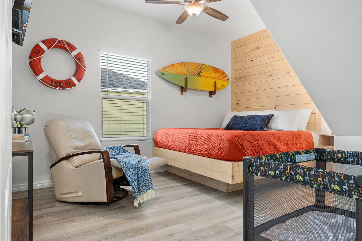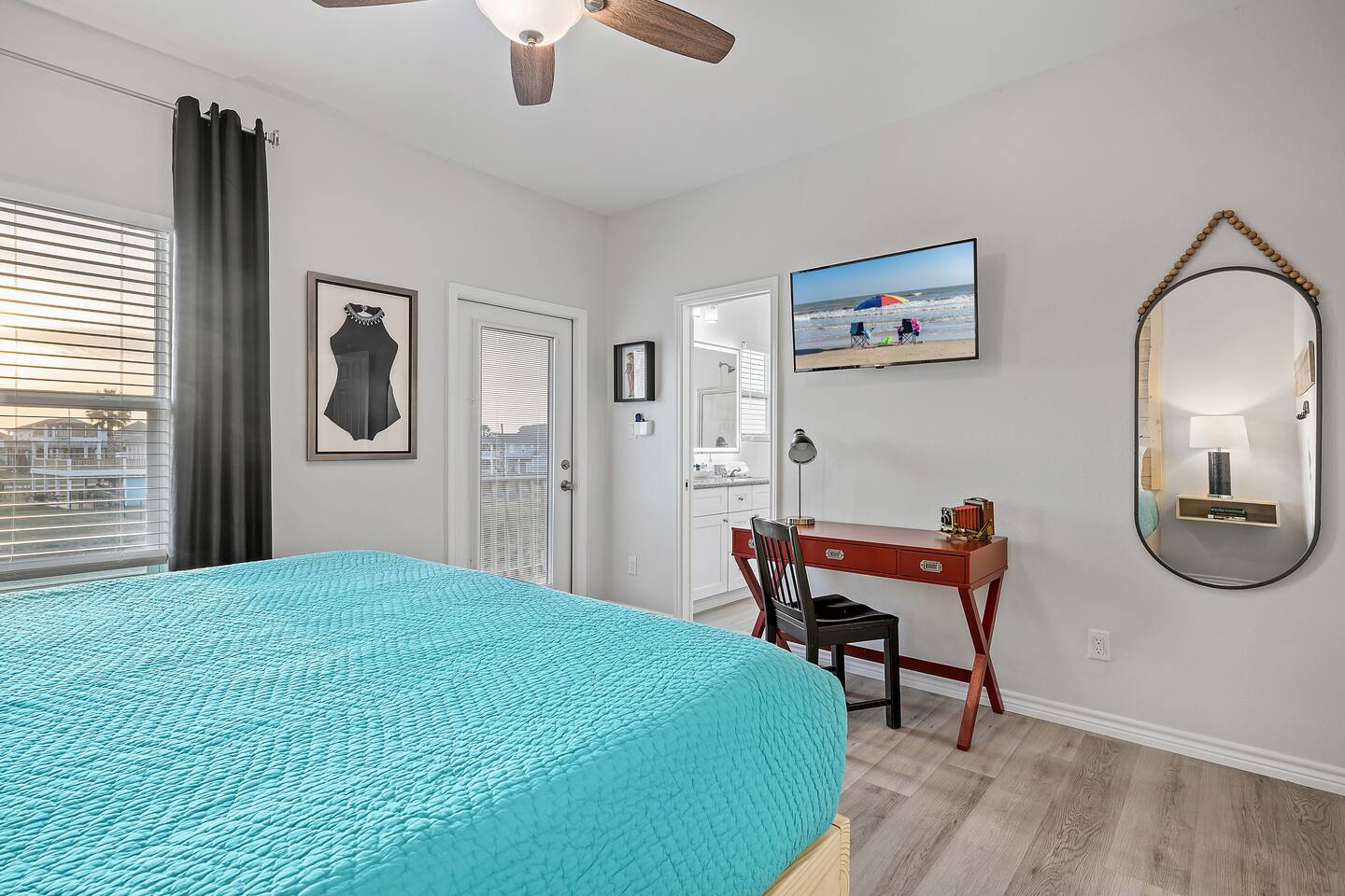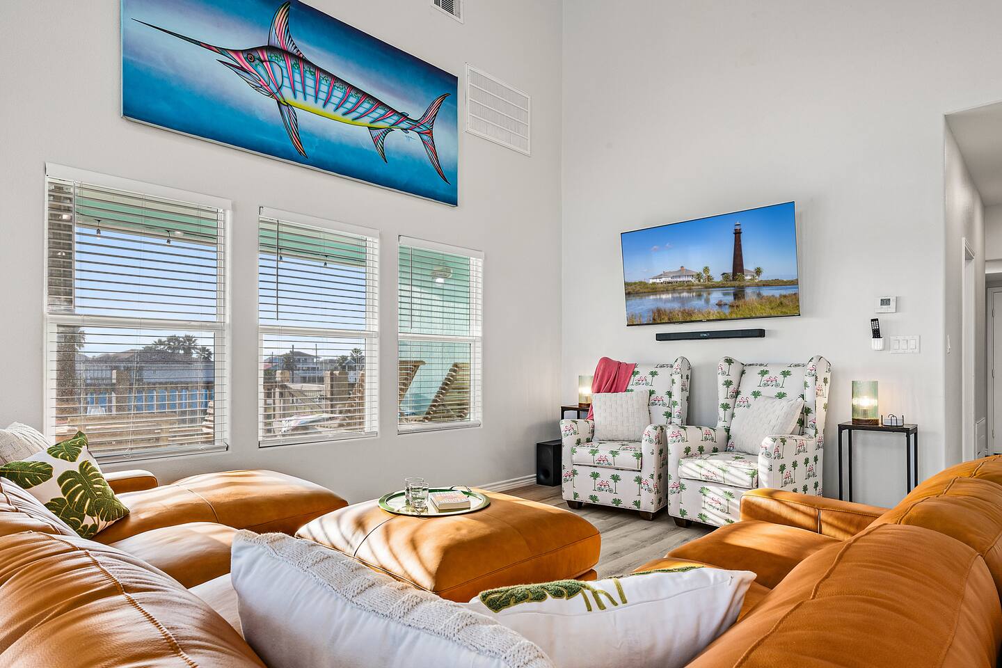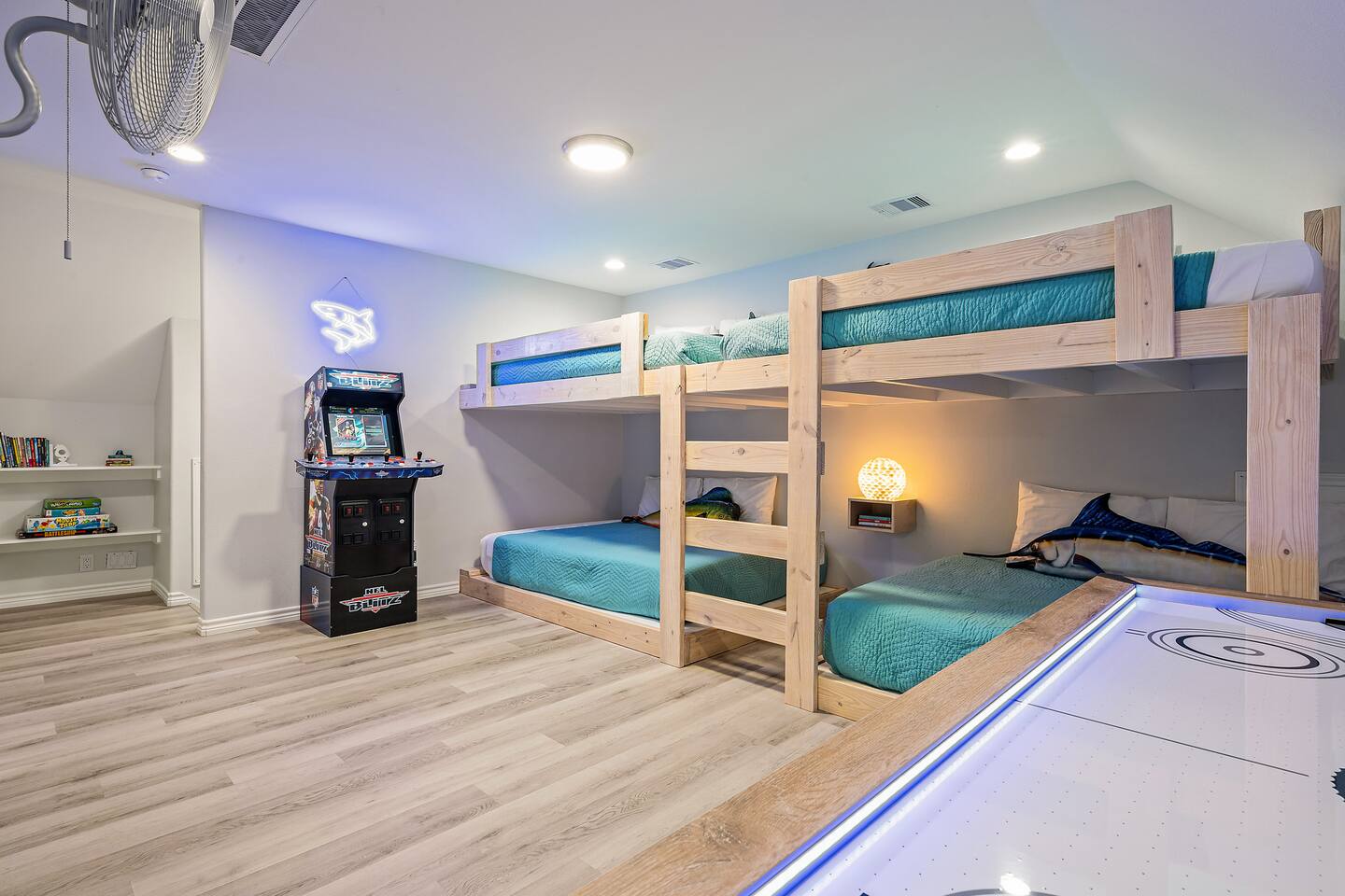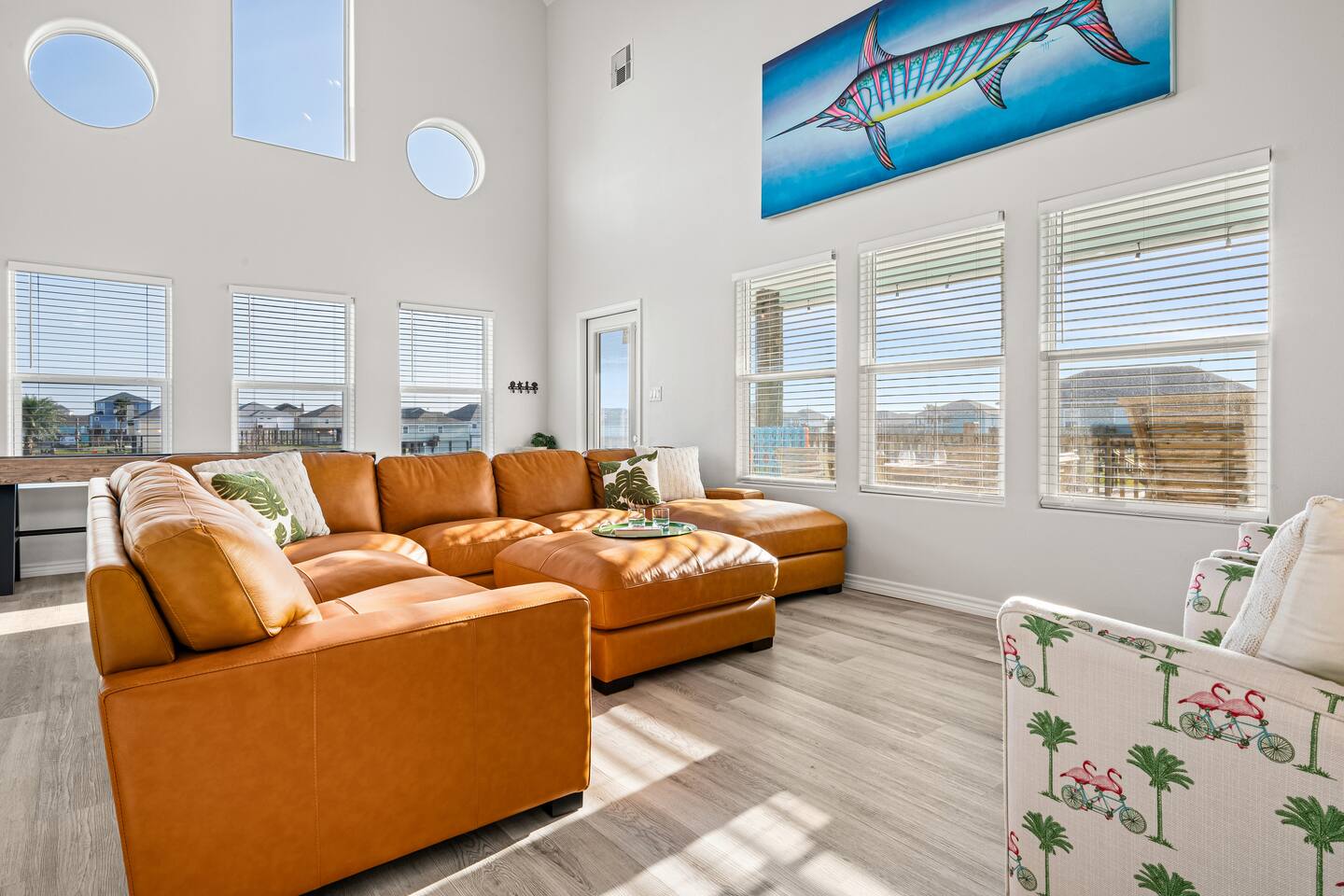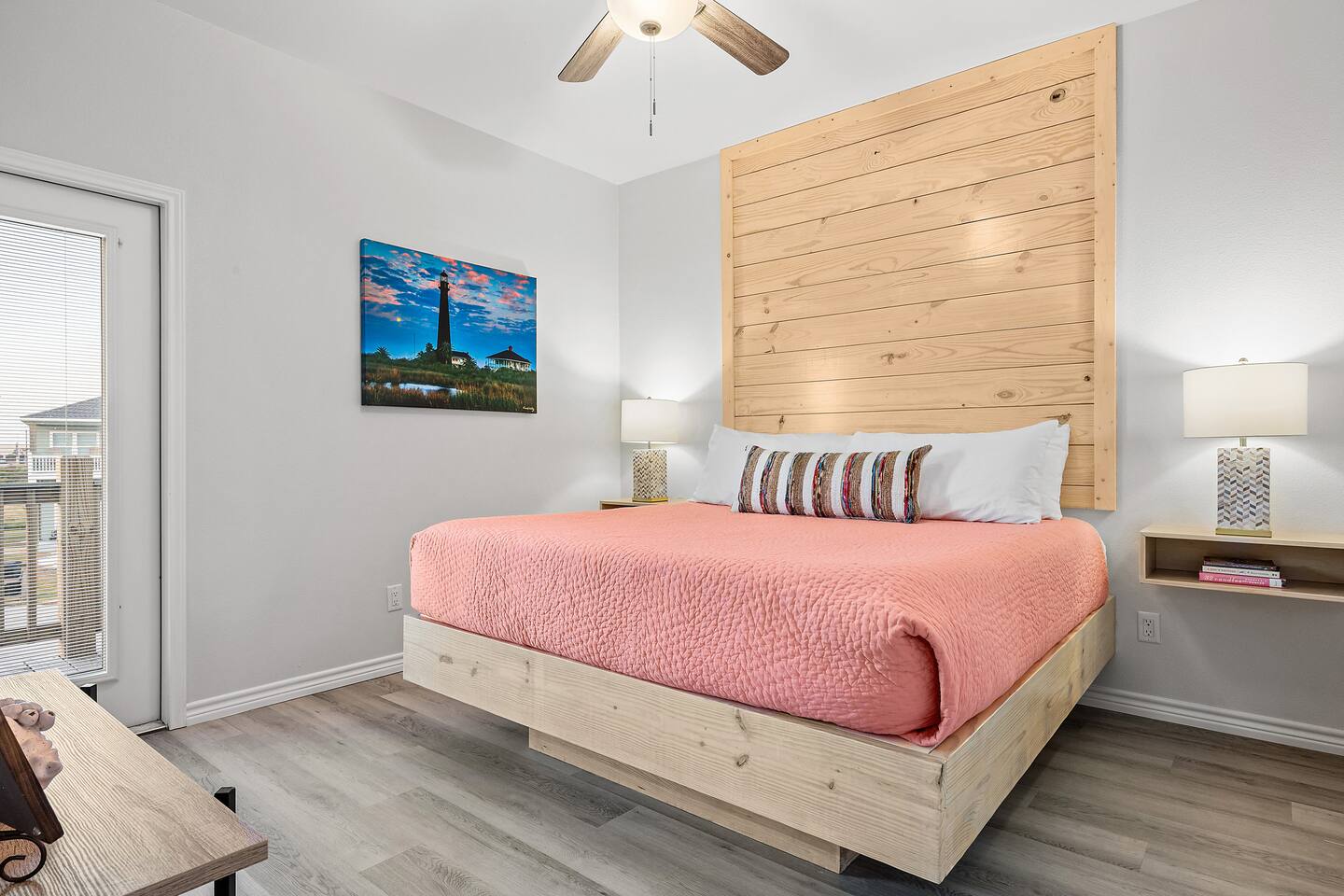 ❈ 2 story beach house that sleeps 20 people comfortably in custom-built beds ❈ tons of outdoor space with 13 foot ceilings on ground level and 2 upper decks ❈ large fenced in corner lot surrounded by over 4 acres of undeveloped land ❈ private wrap-around balcony to 3 of the 4 King bedrooms ❈ 5 person private luxury hot tub with 37 jets, water fountains, and LED package ❈ large outdoor bar and ample outdoor seating with 4 tables and 28 patio chairs ❈ fully-loaded kitchen with 2 full-sized refrigerators ❈ 3 central HVAC systems for maximum guest comfortability ❈ outdoor shower with hot & cold water ❈ built-in playground with slide and swings ❈ WIFI internet and smart TV’s everywhere ❈ portable outdoor speaker for use on property and indoor sound system ❈ decorated with art from local painters and photographers ❈ custom mural for photo opportunities ❈ fire pit ❈ large Char-Grill smoker / grill with grilling accessories ❈ 9-foot shuffleboard table ❈ custom-built cornhole boxes ❈ 6-foot air hockey table ❈ NFL Blitz football arcade game ❈ ladderball, outdoor Jenga, outdoor Connect 4, hook & ring game, basketballs, & frisbees ❈ board games, books & puzzles throughout the house ❈ beach chairs, beach wagon, & rotating supply of beach toys ❈ high chair, pack-n-play, kids dinnerware & utensils ❈ ceiling fans in every room and several pedestal fans available for use ❈ fresh bed & bath linens for 20 people, and 10 beach towels per reservation ❈ basic starter consumables to include: coffee, trash bags, a roll of paper towels, household cleaner, a fresh dish sponge, dish soap, dishwasher soap, hand soap, shampoo, conditioner, body wash, & a roll of toilet paper or two in each bathroom ❈ full-sized washer & dryer ❈ parking for 3-6 vehicles Welcome to Texas! Crystal Beach is Texas at its finest. Drive, park, barbeque, swim, fish, build sandcastles, have events, or just relax on this beautiful and convenient beach. The beach house has everything you could need to enjoy your vacation. The home is lifted 13 feet off of the ground, and the entire lower level is a finished patio with a bar, swinging chairs, dining tables, string lights, and tons of games for entertainment. An outdoor TV, radio and a brand new Catalina 5-person luxury hot tub make this space a paradise. There is a private outdoor shower with hot and cold water to rinse off after coming back from the beach, before getting in the spa, or just for enjoying a solid outdoor shower. The backyard is fenced in with a fire pit, a BBQ grill/smoker, and a playground for the kids. The DOG RUN allows you to let your pup (30 pounds or less) roam the upstairs patio space and take the stairs down to the fenced-in grass yard. The upper deck includes loungers, seating for dining and string lights for perfect evening ambiance. The 4 acres of undeveloped land surrounding the house create a nice sense of privacy and openness. With only 3 houses (as a seagull flies) between Stairway to Heaven and the beach, you can reliably hear the ocean right from the patio. Walk inside to your open-concept kitchen, dining, and living spaces. The kitchen is fully-equipped with everything you could possibly need to host your family or friends, including what we have deemed the “double fridge power move”. The kitchen and island area seats 12 people. Small appliances also include Keurig with latte capabilities, a blender, a toaster, a drip coffee maker, a mixer, and a crock pot. The large living room has 28 foot tall ceilings, 12 windows, a 9-foot shuffleboard table, comfortable seating for 8-10 people and a 65” smart TV with a sound bar and a subwoofer. It is decorated with genuine autographed art from local artists and photographers. You’ll find board games and puzzles in the hallway nook to help enjoy your time. The door to the left of the fridge allows you to create some separation from the stairway leading to the upper rooms. The first King bedroom has a door to the wraparound balcony, a 40-inch smart TV, a ceiling fan, and custom-built furniture. This bedroom features a full jack-and-jill bathroom with granite countertops, a large backlit mirror, double sinks, and a glass shower. You’ll find a pedestal fan, hangers, a high chair and a pack-n-play in the closet. King bedroom #2 has a door to the wraparound balcony, a 32-inch smart TV, a ceiling fan, and custom-built furniture. It also connects to the full jack-and-jill bathroom and is equipped with a pedestal fan. King bedroom #3 has a door to the wraparound balcony, a 40-inch smart TV, a ceiling fan, and custom-built furniture. You will find a pedestal fan and hangers in the closet. King bedroom #4 has a large window, a recliner, a 40-inch smart TV, a ceiling fan, and custom-built furniture. The “surf room” has super fun vibes with a real surfboard mounted on the wall over the bed. A full hallway bathroom with backlit mirror and built-in shelves will serve king bedrooms 3&4. Bedroom #5 is upstairs and has 2 full-sized beds, a large window, a 32-inch smart TV, a ceiling fan, and custom-built furniture. This bedroom features a full jack-and-jill bathroom with granite countertops, a backlit mirror and a glass shower. Bedroom #6 is a shared space with the upper game room. It has 4 queen beds, a 50-inch smart TV, an oscillating wall-mounted fan, books and games for kids, an air hockey table and an NFL Blitz football arcade game. This room has direct access to the upper jack-and-jill bathroom with a separate entrance from bedroom #5. The laundry room in the hallway has a full sized washer and dryer, and an iron and ironing board. We work hard to maintain a place that you and yours can enjoy. Come stay with us and indulge in the beach life!!