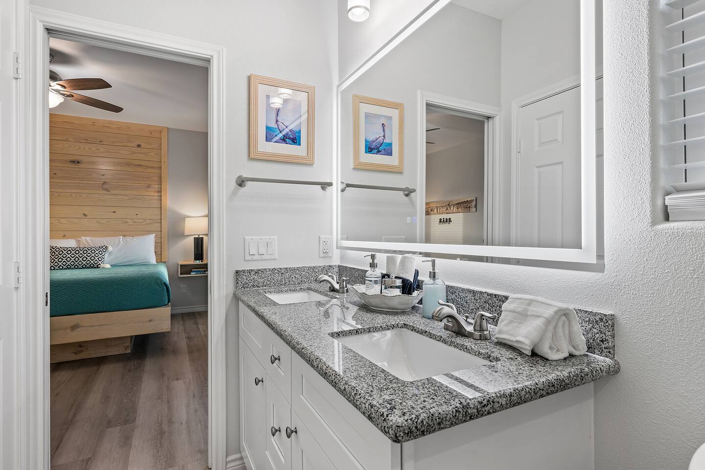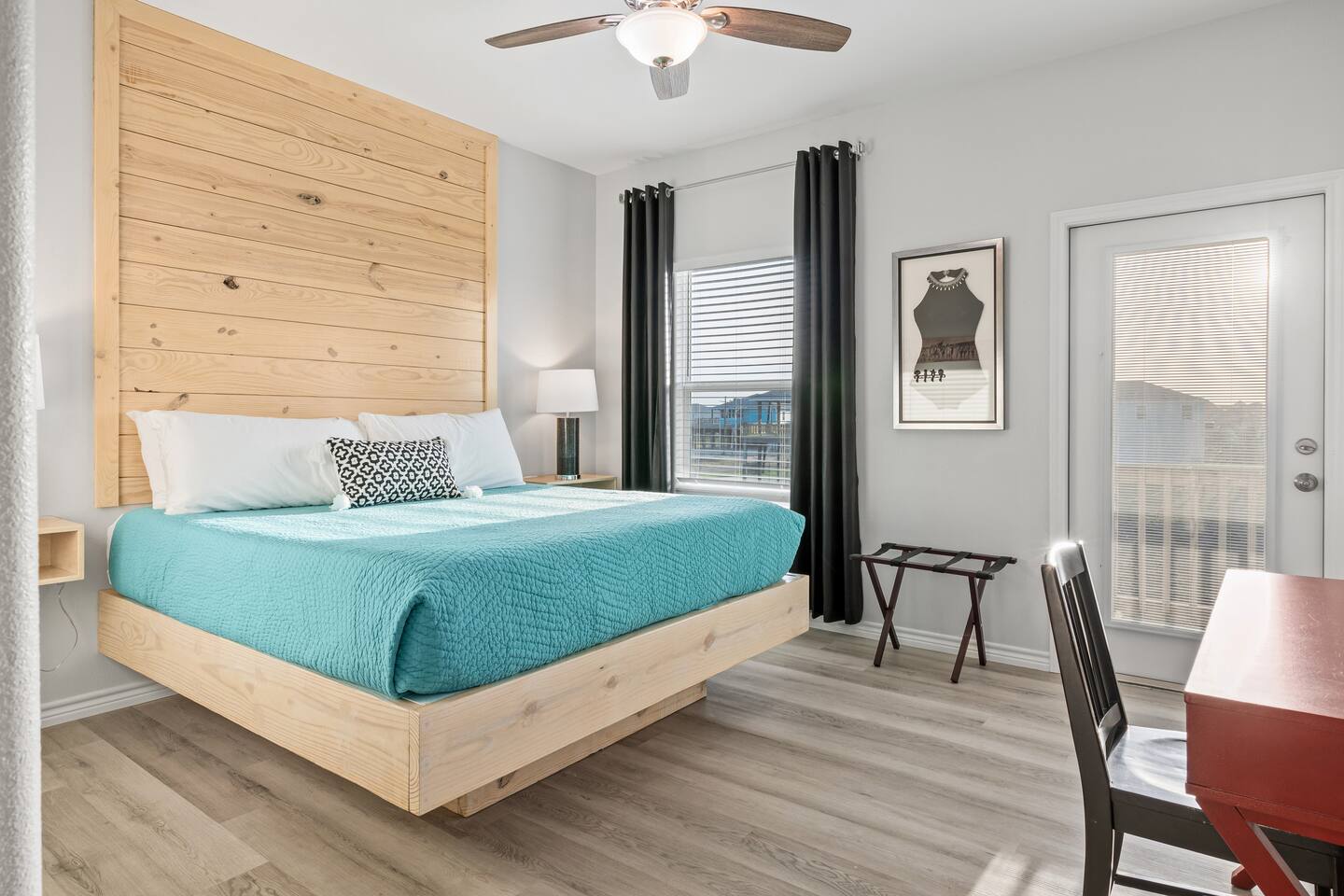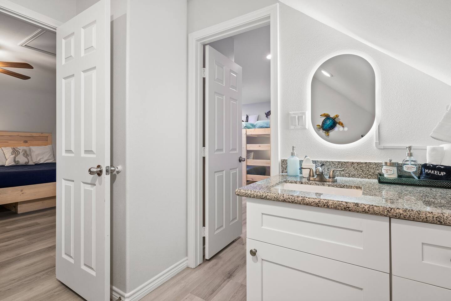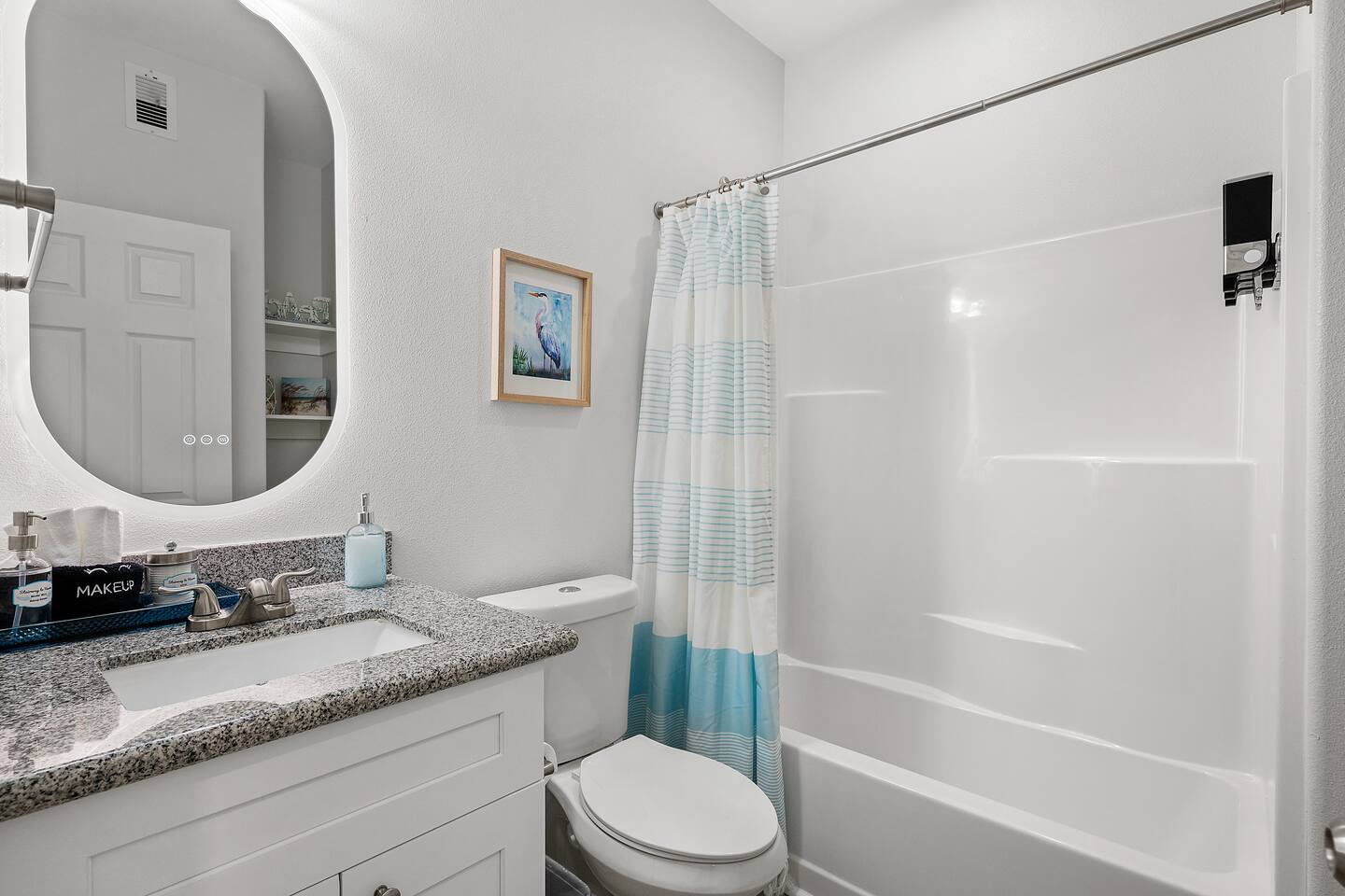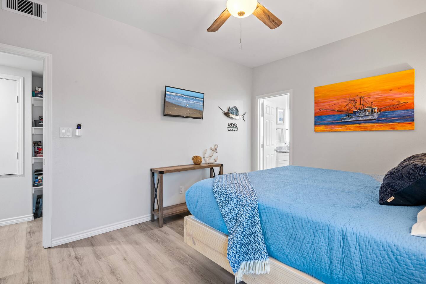 ❈ 2 story beach house that sleeps 20 people comfortably in custom-built beds ❈ tons of outdoor space with 13 foot ceilings on ground level and 2 upper decks ❈ large fenced in corner lot surrounded by over 4 acres of undeveloped land ❈ private wrap-around balcony to 3 of the 4 King bedrooms ❈ 5 person private luxury hot tub with 37 jets, water fountains, and LED package ❈ large outdoor bar and ample outdoor seating with 4 tables and 28 patio chairs ❈ fully-loaded kitchen with 2 full-sized refrigerators ❈ 3 central HVAC systems for maximum guest comfortability ❈ outdoor shower with hot & cold water ❈ built-in playground with slide and swings ❈ WIFI internet and smart TV’s everywhere ❈ portable outdoor speaker for use on property and indoor sound system ❈ decorated with art from local painters and photographers ❈ custom mural for photo opportunities ❈ fire pit ❈ large Char-Grill smoker / grill with grilling accessories ❈ 9-foot shuffleboard table ❈ custom-built cornhole boxes ❈ 6-foot air hockey table ❈ NFL Blitz football arcade game ❈ ladderball, outdoor Jenga, outdoor Connect 4, hook & ring game, basketballs, & frisbees ❈ board games, books & puzzles throughout the house ❈ beach chairs, beach wagon, & rotating supply of beach toys ❈ high chair, pack-n-play, kids dinnerware & utensils ❈ ceiling fans in every room and several pedestal fans available for use ❈ fresh bed & bath linens for 20 people, and 10 beach towels per reservation ❈ basic starter consumables to include: coffee, trash bags, a roll of paper towels, household cleaner, a fresh dish sponge, dish soap, dishwasher soap, hand soap, shampoo, conditioner, body wash, & a roll of toilet paper or two in each bathroom ❈ full-sized washer & dryer ❈ parking for 3-6 vehicles Welcome to Texas! Crystal Beach is Texas at its finest. Drive, park, barbeque, swim, fish, build sandcastles, have events, or just relax on this beautiful and convenient beach. The beach house has everything you could need to enjoy your vacation. The home is lifted 13 feet off of the ground, and the entire lower level is a finished patio with a bar, swinging chairs, dining tables, string lights, and tons of games for entertainment. An outdoor TV, radio and a brand new Catalina 5-person luxury hot tub make this space a paradise. There is a private outdoor shower with hot and cold water to rinse off after coming back from the beach, before getting in the spa, or just for enjoying a solid outdoor shower. The backyard is fenced in with a fire pit, a BBQ grill/smoker, and a playground for the kids. The DOG RUN allows you to let your pup (30 pounds or less) roam the upstairs patio space and take the stairs down to the fenced-in grass yard. The upper deck includes loungers, seating for dining and string lights for perfect evening ambiance. The 4 acres of undeveloped land surrounding the house create a nice sense of privacy and openness. With only 3 houses (as a seagull flies) between Stairway to Heaven and the beach, you can reliably hear the ocean right from the patio. Walk inside to your open-concept kitchen, dining, and living spaces. The kitchen is fully-equipped with everything you could possibly need to host your family or friends, including what we have deemed the “double fridge power move”. The kitchen and island area seats 12 people. Small appliances also include Keurig with latte capabilities, a blender, a toaster, a drip coffee maker, a mixer, and a crock pot. The large living room has 28 foot tall ceilings, 12 windows, a 9-foot shuffleboard table, comfortable seating for 8-10 people and a 65” smart TV with a sound bar and a subwoofer. It is decorated with genuine autographed art from local artists and photographers. You’ll find board games and puzzles in the hallway nook to help enjoy your time. The door to the left of the fridge allows you to create some separation from the stairway leading to the upper rooms. The first King bedroom has a door to the wraparound balcony, a 40-inch smart TV, a ceiling fan, and custom-built furniture. This bedroom features a full jack-and-jill bathroom with granite countertops, a large backlit mirror, double sinks, and a glass shower. You’ll find a pedestal fan, hangers, a high chair and a pack-n-play in the closet. King bedroom #2 has a door to the wraparound balcony, a 32-inch smart TV, a ceiling fan, and custom-built furniture. It also connects to the full jack-and-jill bathroom and is equipped with a pedestal fan. King bedroom #3 has a door to the wraparound balcony, a 40-inch smart TV, a ceiling fan, and custom-built furniture. You will find a pedestal fan and hangers in the closet. King bedroom #4 has a large window, a recliner, a 40-inch smart TV, a ceiling fan, and custom-built furniture. The “surf room” has super fun vibes with a real surfboard mounted on the wall over the bed. A full hallway bathroom with backlit mirror and built-in shelves will serve king bedrooms 3&4. Bedroom #5 is upstairs and has 2 full-sized beds, a large window, a 32-inch smart TV, a ceiling fan, and custom-built furniture. This bedroom features a full jack-and-jill bathroom with granite countertops, a backlit mirror and a glass shower. Bedroom #6 is a shared space with the upper game room. It has 4 queen beds, a 50-inch smart TV, an oscillating wall-mounted fan, books and games for kids, an air hockey table and an NFL Blitz football arcade game. This room has direct access to the upper jack-and-jill bathroom with a separate entrance from bedroom #5. The laundry room in the hallway has a full sized washer and dryer, and an iron and ironing board. We work hard to maintain a place that you and yours can enjoy. Come stay with us and indulge in the beach life!!
