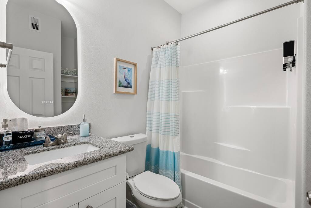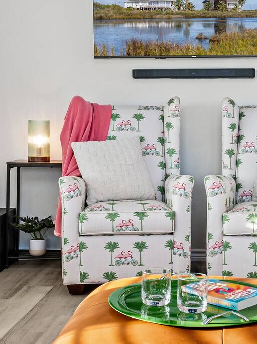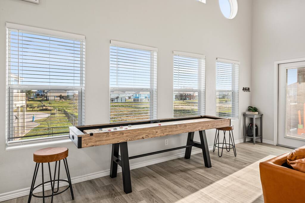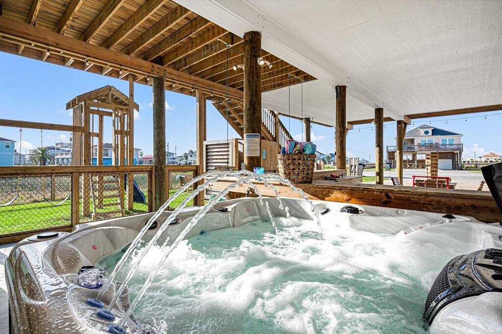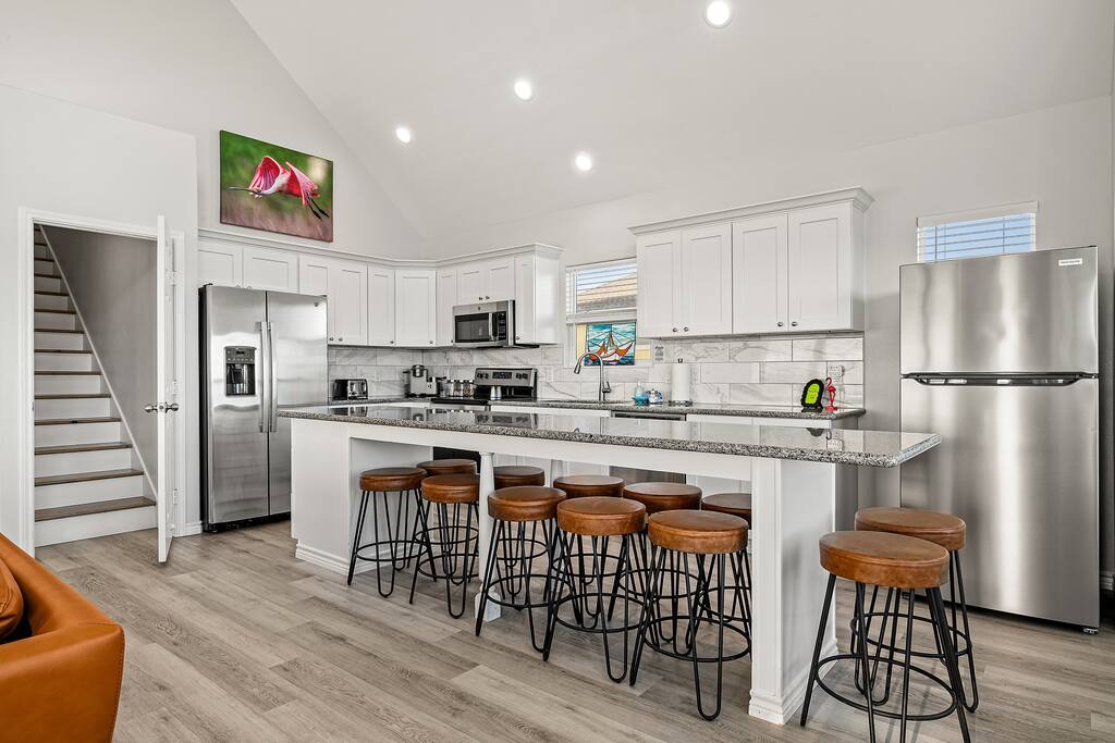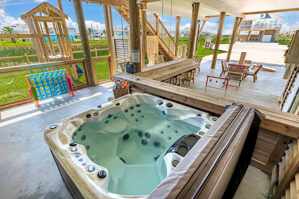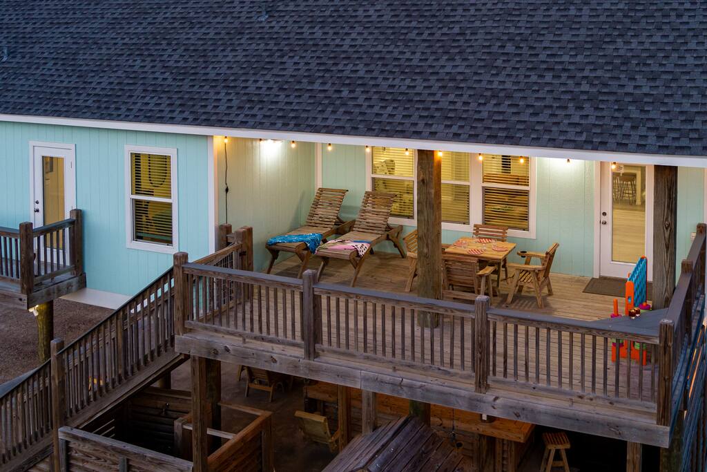 ❈ 2 story beach house that sleeps 20 people comfortably in custom-built beds ❈ tons of outdoor space with 13 foot ceilings on ground level and 2 upper decks ❈ large fenced in corner lot surrounded by over 4 acres of undeveloped land ❈ private wrap-around balcony to 3 of the 4 King bedrooms ❈ 5 person private luxury hot tub with 37 jets, water fountains, and LED package ❈ large outdoor bar and ample outdoor seating with 4 tables and 28 patio chairs ❈ fully-loaded kitchen with 2 full-sized refrigerators ❈ 3 central HVAC systems for maximum guest comfortability ❈ outdoor shower with hot & cold water ❈ built-in playground with slide and swings ❈ WIFI internet and smart TV’s everywhere ❈ portable outdoor speaker for use on property and indoor sound system ❈ decorated with art from local painters and photographers ❈ custom mural for photo opportunities ❈ fire pit ❈ large Char-Grill smoker / grill with grilling accessories ❈ 9-foot shuffleboard table ❈ custom-built cornhole boxes ❈ 6-foot air hockey table ❈ NFL Blitz football arcade game ❈ ladderball, outdoor Jenga, outdoor Connect 4, hook & ring game, basketballs, & frisbees ❈ board games, books & puzzles throughout the house ❈ beach chairs, beach wagon, & rotating supply of beach toys ❈ high chair, pack-n-play, kids dinnerware & utensils ❈ ceiling fans in every room and several pedestal fans available for use ❈ fresh bed & bath linens for 20 people, and 10 beach towels per reservation ❈ basic starter consumables to include: coffee, trash bags, a roll of paper towels, household cleaner, a fresh dish sponge, dish soap, dishwasher soap, hand soap, shampoo, conditioner, body wash, & a roll of toilet paper or two in each bathroom ❈ full-sized washer & dryer ❈ parking for 3-6 vehicles Welcome to Texas! Crystal Beach is Texas at its finest. Drive, park, barbeque, swim, fish, build sandcastles, have events, or just relax on this beautiful and convenient beach. The beach house has everything you could need to enjoy your vacation. The home is lifted 13 feet off of the ground, and the entire lower level is a finished patio with a bar, swinging chairs, dining tables, string lights, and tons of games for entertainment. An outdoor TV, radio and a brand new Catalina 5-person luxury hot tub make this space a paradise. There is a private outdoor shower with hot and cold water to rinse off after coming back from the beach, before getting in the spa, or just for enjoying a solid outdoor shower. The backyard is fenced in with a fire pit, a BBQ grill/smoker, and a playground for the kids. The DOG RUN allows you to let your pup (30 pounds or less) roam the upstairs patio space and take the stairs down to the fenced-in grass yard. The upper deck includes loungers, seating for dining and string lights for perfect evening ambiance. The 4 acres of undeveloped land surrounding the house create a nice sense of privacy and openness. With only 3 houses (as a seagull flies) between Stairway to Heaven and the beach, you can reliably hear the ocean right from the patio. Walk inside to your open-concept kitchen, dining, and living spaces. The kitchen is fully-equipped with everything you could possibly need to host your family or friends, including what we have deemed the “double fridge power move”. The kitchen and island area seats 12 people. Small appliances also include Keurig with latte capabilities, a blender, a toaster, a drip coffee maker, a mixer, and a crock pot. The large living room has 28 foot tall ceilings, 12 windows, a 9-foot shuffleboard table, comfortable seating for 8-10 people and a 65” smart TV with a sound bar and a subwoofer. It is decorated with genuine autographed art from local artists and photographers. You’ll find board games and puzzles in the hallway nook to help enjoy your time. The door to the left of the fridge allows you to create some separation from the stairway leading to the upper rooms. The first King bedroom has a door to the wraparound balcony, a 40-inch smart TV, a ceiling fan, and custom-built furniture. This bedroom features a full jack-and-jill bathroom with granite countertops, a large backlit mirror, double sinks, and a glass shower. You’ll find a pedestal fan, hangers, a high chair and a pack-n-play in the closet. King bedroom #2 has a door to the wraparound balcony, a 32-inch smart TV, a ceiling fan, and custom-built furniture. It also connects to the full jack-and-jill bathroom and is equipped with a pedestal fan. King bedroom #3 has a door to the wraparound balcony, a 40-inch smart TV, a ceiling fan, and custom-built furniture. You will find a pedestal fan and hangers in the closet. King bedroom #4 has a large window, a recliner, a 40-inch smart TV, a ceiling fan, and custom-built furniture. The “surf room” has super fun vibes with a real surfboard mounted on the wall over the bed. A full hallway bathroom with backlit mirror and built-in shelves will serve king bedrooms 3&4. Bedroom #5 is upstairs and has 2 full-sized beds, a large window, a 32-inch smart TV, a ceiling fan, and custom-built furniture. This bedroom features a full jack-and-jill bathroom with granite countertops, a backlit mirror and a glass shower. Bedroom #6 is a shared space with the upper game room. It has 4 queen beds, a 50-inch smart TV, an oscillating wall-mounted fan, books and games for kids, an air hockey table and an NFL Blitz football arcade game. This room has direct access to the upper jack-and-jill bathroom with a separate entrance from bedroom #5. The laundry room in the hallway has a full sized washer and dryer, and an iron and ironing board. We work hard to maintain a place that you and yours can enjoy. Come stay with us and indulge in the beach life!
